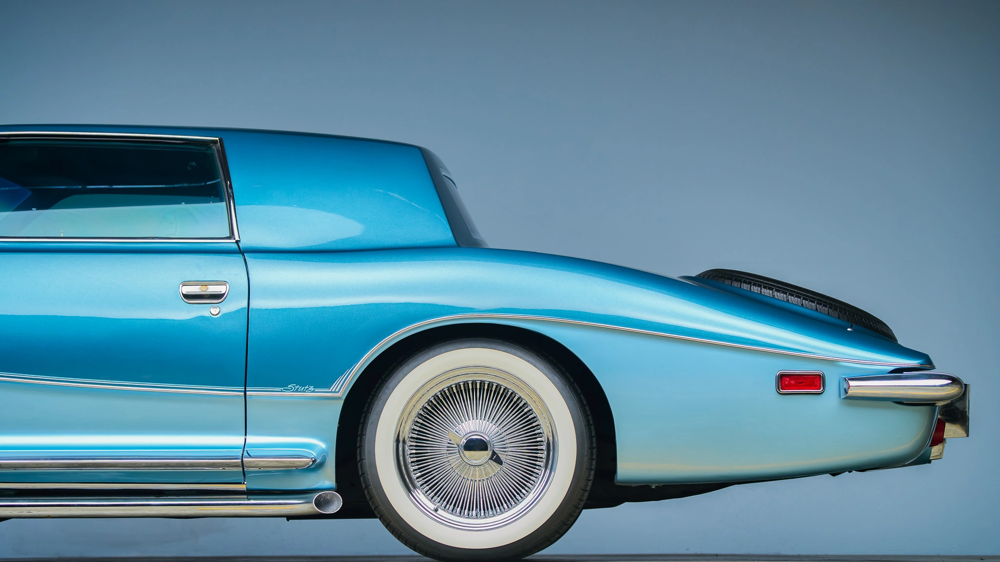 La vision de Virgil Exner de la Stutz Blackhawk a été réalisée sous forme d’un grand coupé élégant de parade, en utilisant des composants d’origine américaine dans un costume italien exclusif “coachbuilt”, dans l’esprit de la luxueuse et exclusive Dual-Ghia des années 1950, la Stutz Blackhawk Coupé d’origine n’était en réalité qu’une voiture entièrement recarrossée, prétendument reconstruite totalement “à la main”! Ce n’était qu’un banal Coupé Pontiac Standard d’usine et non une réplique en kit ou en fibre de verre. Le coûteux processus de reproduction consistait à expédier une Pontiac “Grand-Prix” complète (achetée au détail !) à la Carrozzeria Padane à Modène, qui modifiait l’apparence extérieure et la totalité de l’intérieur. Le nouveau carrosse partageait quasi tout avec la voiture donatrice, et le résultat obtenu était soigneusement peint aux spécifications de l’acheteur.