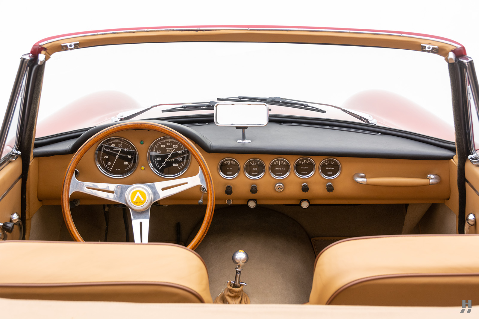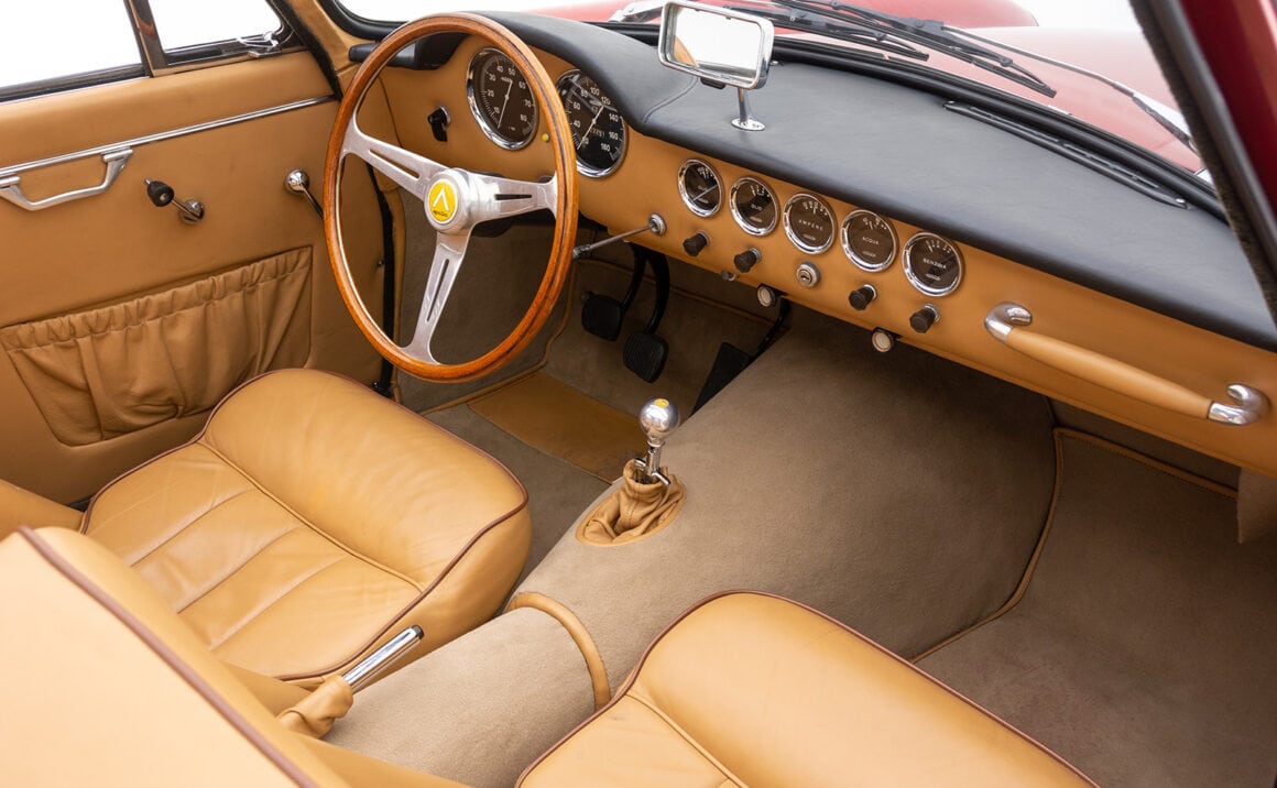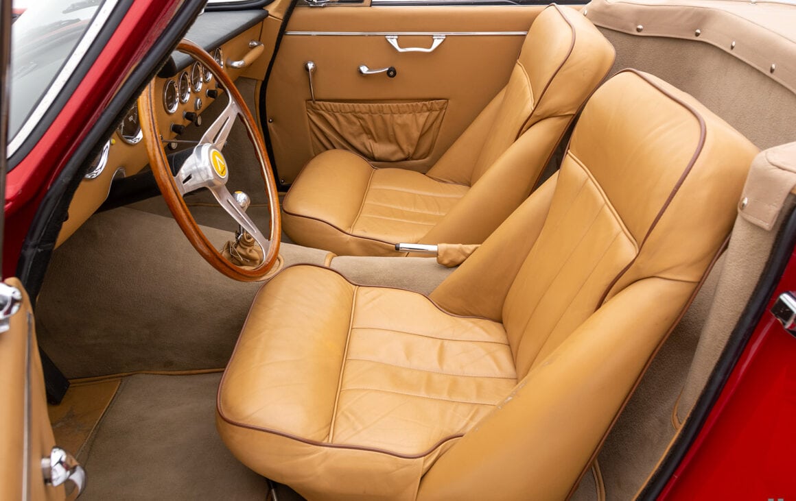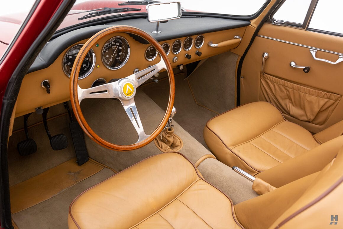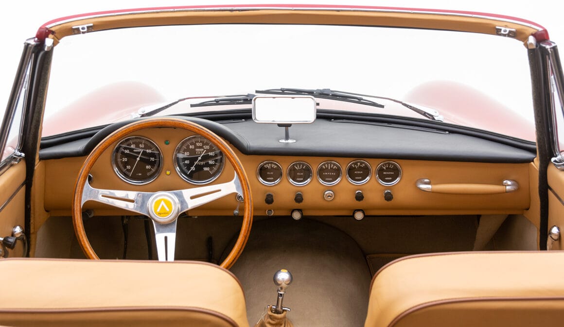 Les cabriolets se distinguaient par leurs ailes avant ventilées, améliorant le design déjà magnifique. Le chrome est utilisé avec parcimonie sur l’Apollo, principalement sur les pare-chocs et les garnitures de phares, qui sont tous en excellent état. Les détails appropriés incluent des phares Carello d’époque, des roues à fil Borrani 5 x 400 polies (estampillées RW 3796 tout autour), chaussées des pneus Pirelli Cinturato 165 x 400 corrects, un remplisseur de carburant de style Monza et des badges Carrozzeria IM discrets sur les flancs.