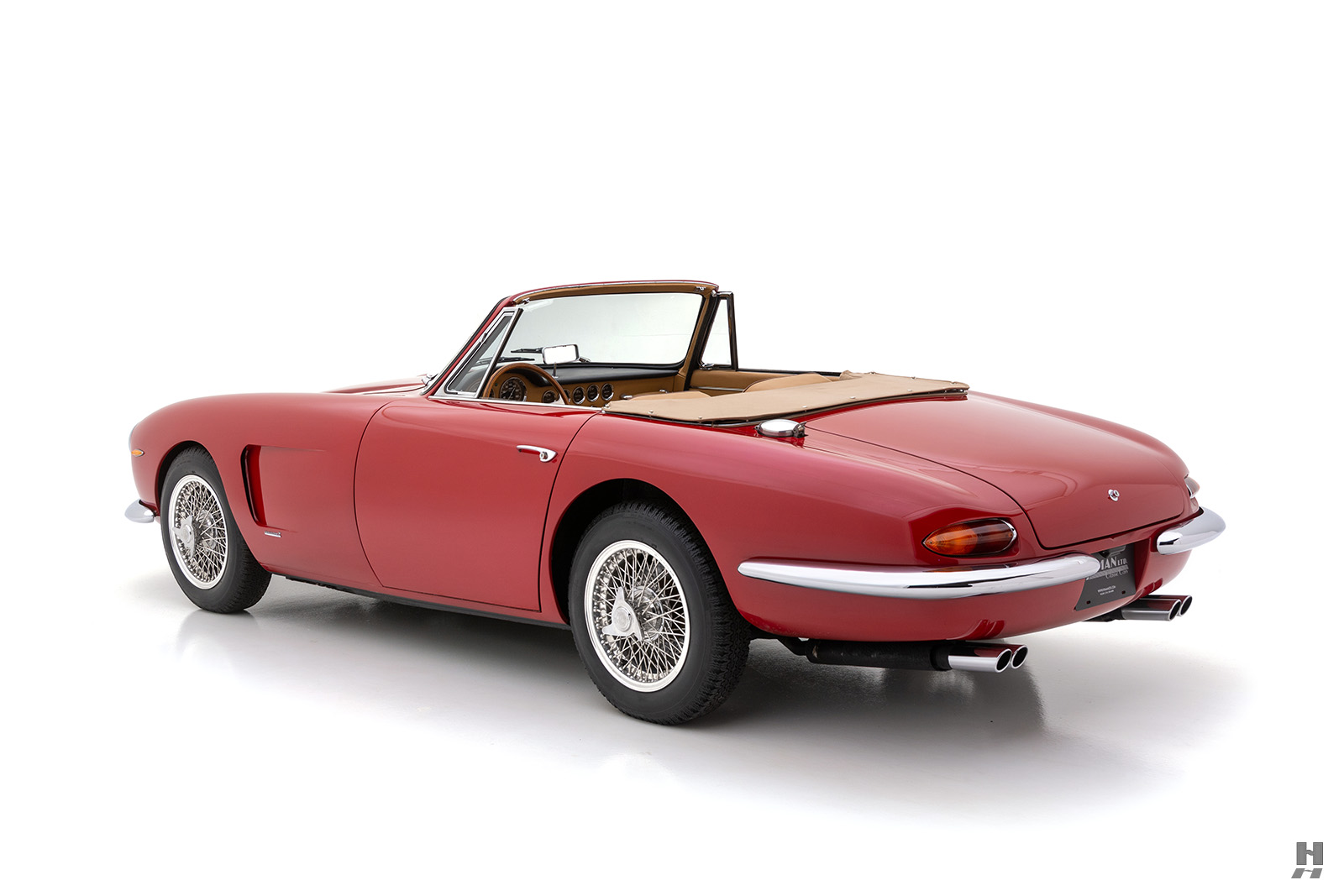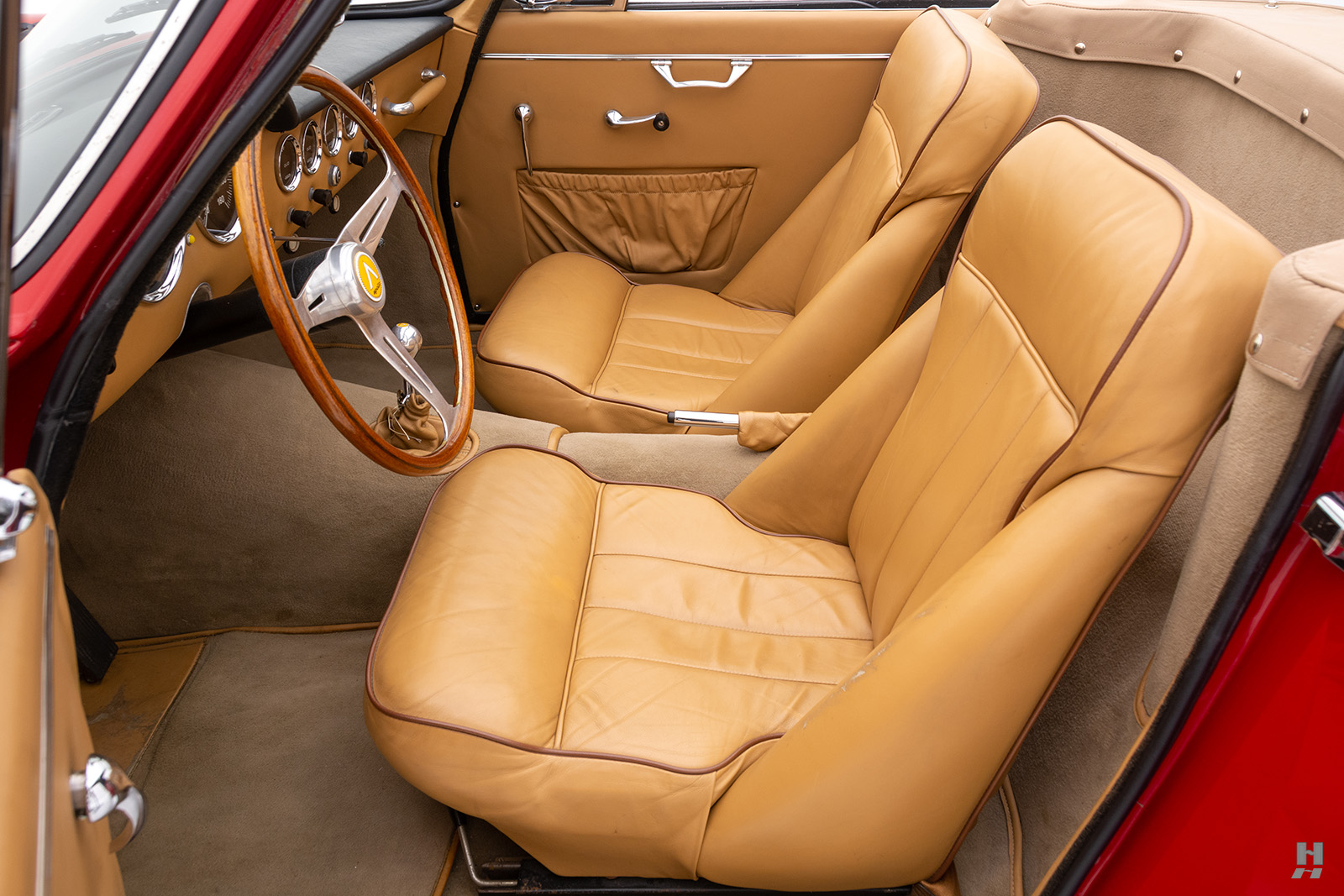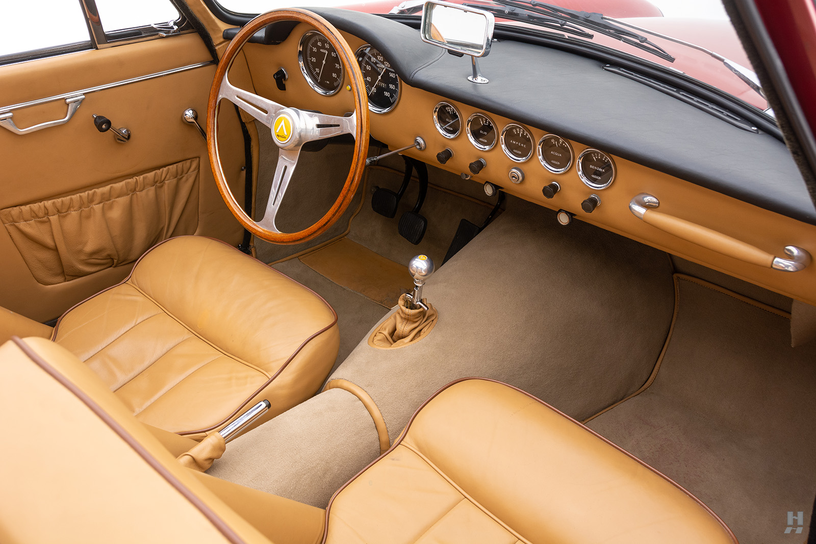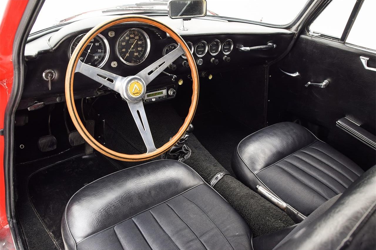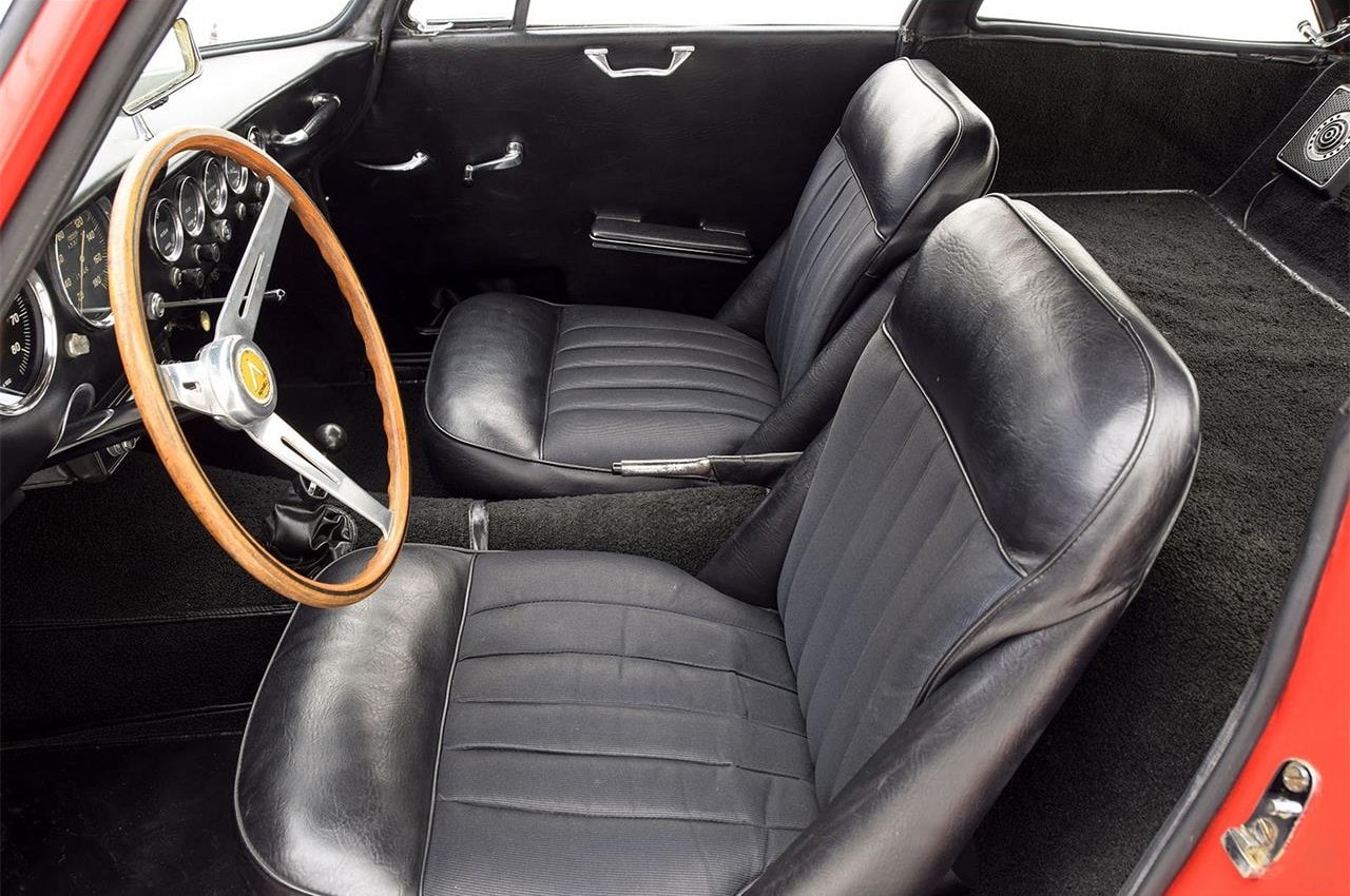 Les cabriolets se distinguaient par leurs ailes avant ventilées, améliorant le design déjà magnifique. Le chrome est utilisé avec parcimonie sur l’Apollo, principalement sur les pare-chocs et les garnitures de phares, qui sont tous en excellent état. Les détails appropriés incluent des phares Carello d’époque, des roues à fil Borrani 5 x 400 polies (estampillées RW 3796 tout autour), chaussées des pneus Pirelli Cinturato 165 x 400 corrects, un remplisseur de carburant de style Monza et des badges Carrozzeria IM discrets sur les flancs.