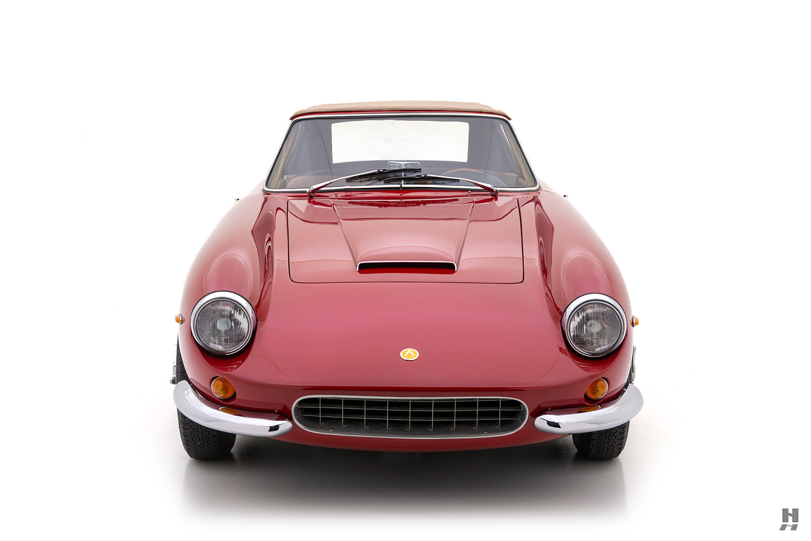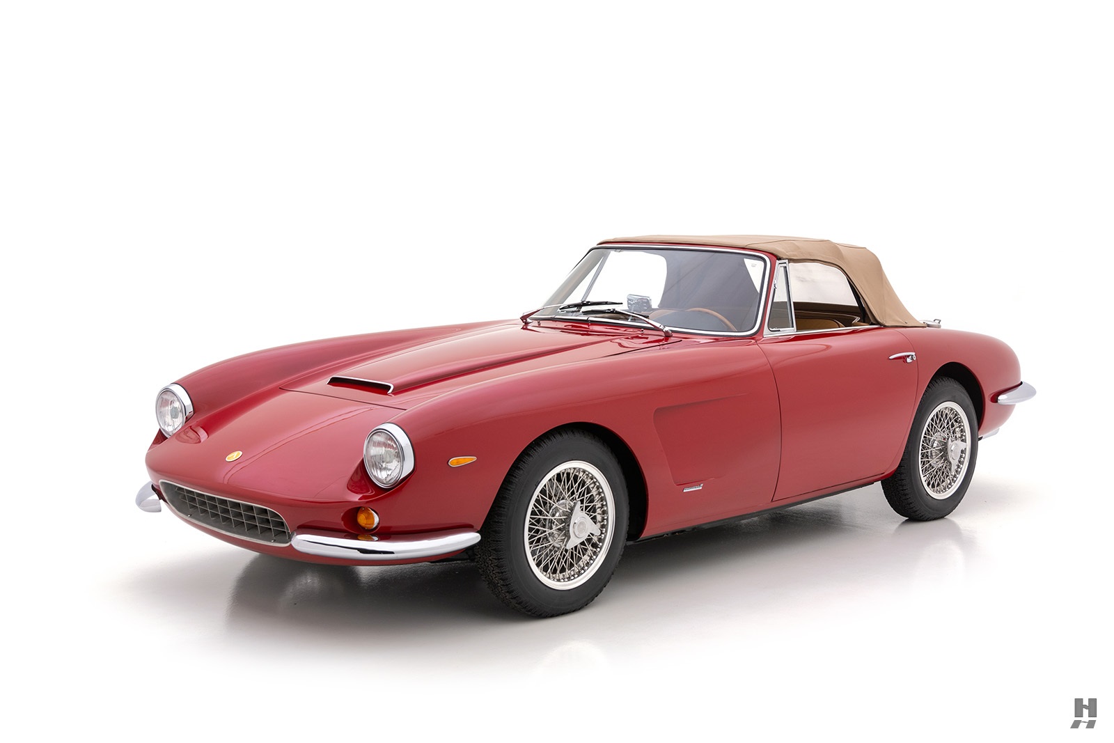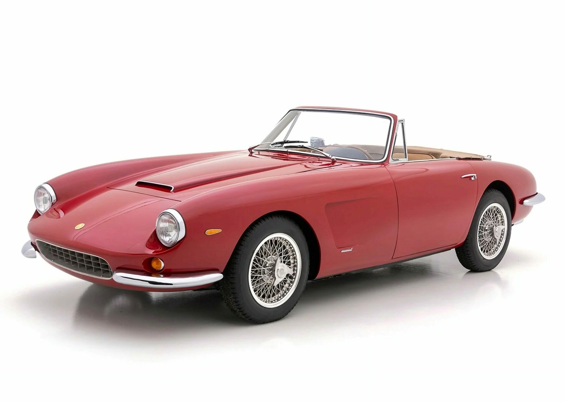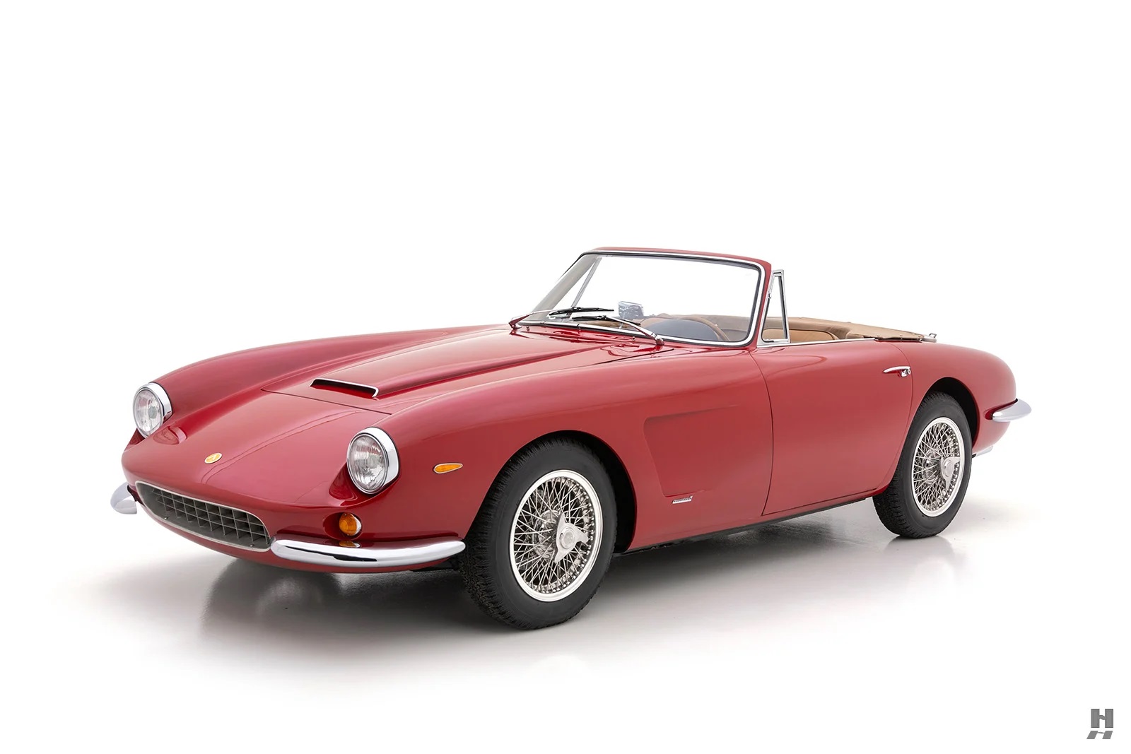 Les cabriolets se distinguaient par leurs ailes avant ventilées, améliorant le design déjà magnifique. Le chrome est utilisé avec parcimonie sur l’Apollo, principalement sur les pare-chocs et les garnitures de phares, qui sont tous en excellent état. Les détails appropriés incluent des phares Carello d’époque, des roues à fil Borrani 5 x 400 polies (estampillées RW 3796 tout autour), chaussées des pneus Pirelli Cinturato 165 x 400 corrects, un remplisseur de carburant de style Monza et des badges Carrozzeria IM discrets sur les flancs.