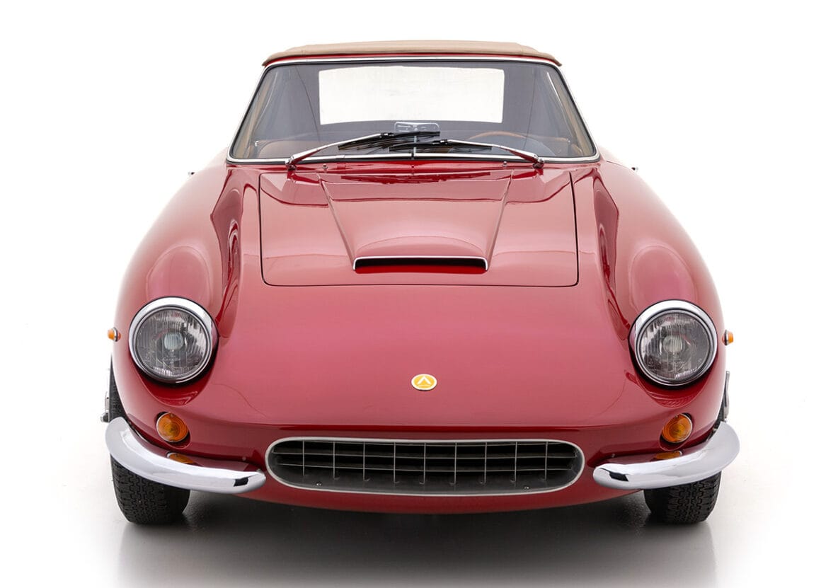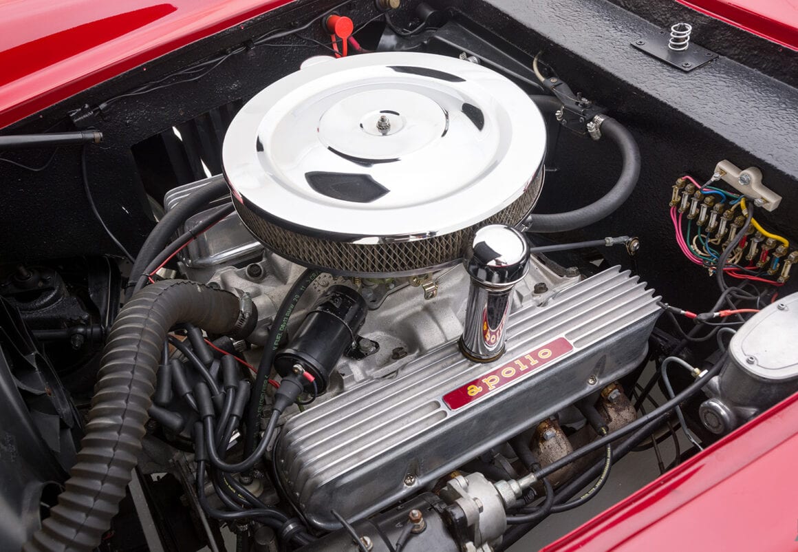 Cet Apollo de 1964 est un bel exemple qui a été entretenu et préparé avec amour pour les rallyes et les événements de route rapide. C’est l’un des 11 cabriolets connus, et il a été construit par Milt Brown à partir des restes de son cabriolet 5000 GT d’origine gravement endommagé, en utilisant une coque roulante 3500 Coupé jamais enregistrée comme base. Le cabriolet conçu par Scaglione partage très peu de panneaux en commun avec le coupé, ce qui fait d’une telle conversion une entreprise importante.