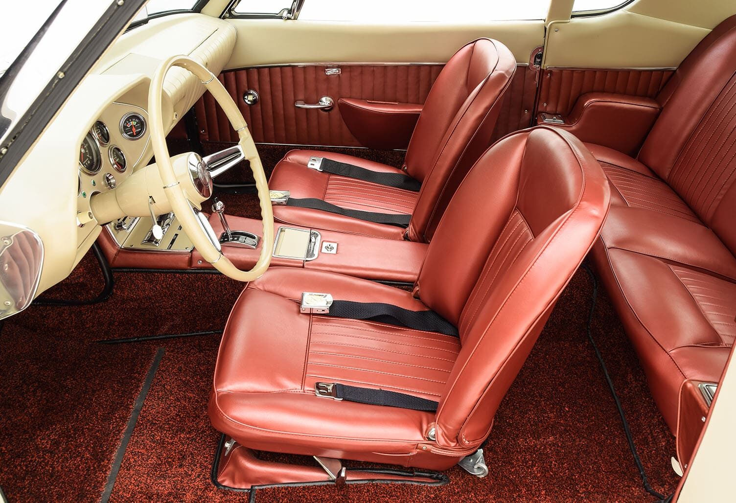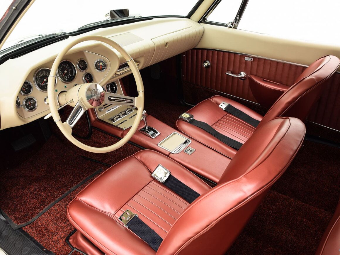En plus les clients pouvaient obtenir des rétroviseurs extérieurs “Stratovue” gauche et/ou droit, voire les deux en sus d’une foule d’autres articles de commodité (tout est relatif). Tous les intérieurs de 1963 étaient en vinyle bicolore, avec du fauve (un bronzage clair) sur le dessus et des couleurs telles que le noir, le turquoise, l’orange, l’élan (brun plus foncé) ou le rouge en dessous. Les tapis étaient de style smoking “sel et poivre” (pas d’origine GM, mais similaires à ceux de la Corvette C1). En 1964, quelques fonctionnalités ont été ajoutées : l’avant a reçu des lentilles en verre de phare carrées, remplaçant les lentilles rondes précédentes. À l’intérieur, un volant inclinable est devenu une option et l’intérieur en vinyle bicolore a été remplacé par une seule couleur.