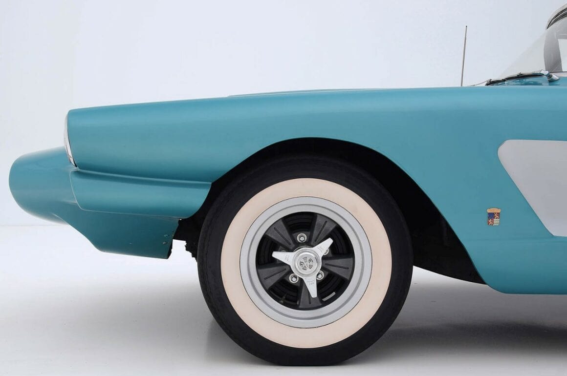 Vous noterez aussi le changement des retroviseurs. La verrière transparente était comme un miroir sans tain, les passagers pouvaient voir à l’extérieur. A l’origine peint en rouge, la version qui apparaît au cours de 1961 Chicago Auto Show a été repeinte en argent nacré pour correspondre au poste de pilotage. Les échappements latéraux ont été positionnés seulement à partir de la version 1959, comme ce fut le cas pour le Bodyline enveloppant l’arrière qui prédit la conception utilisée pour la production de la Corvette 1961-1962.