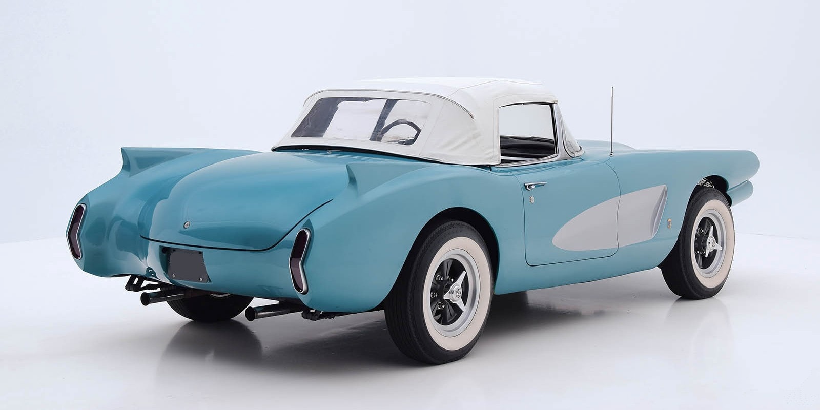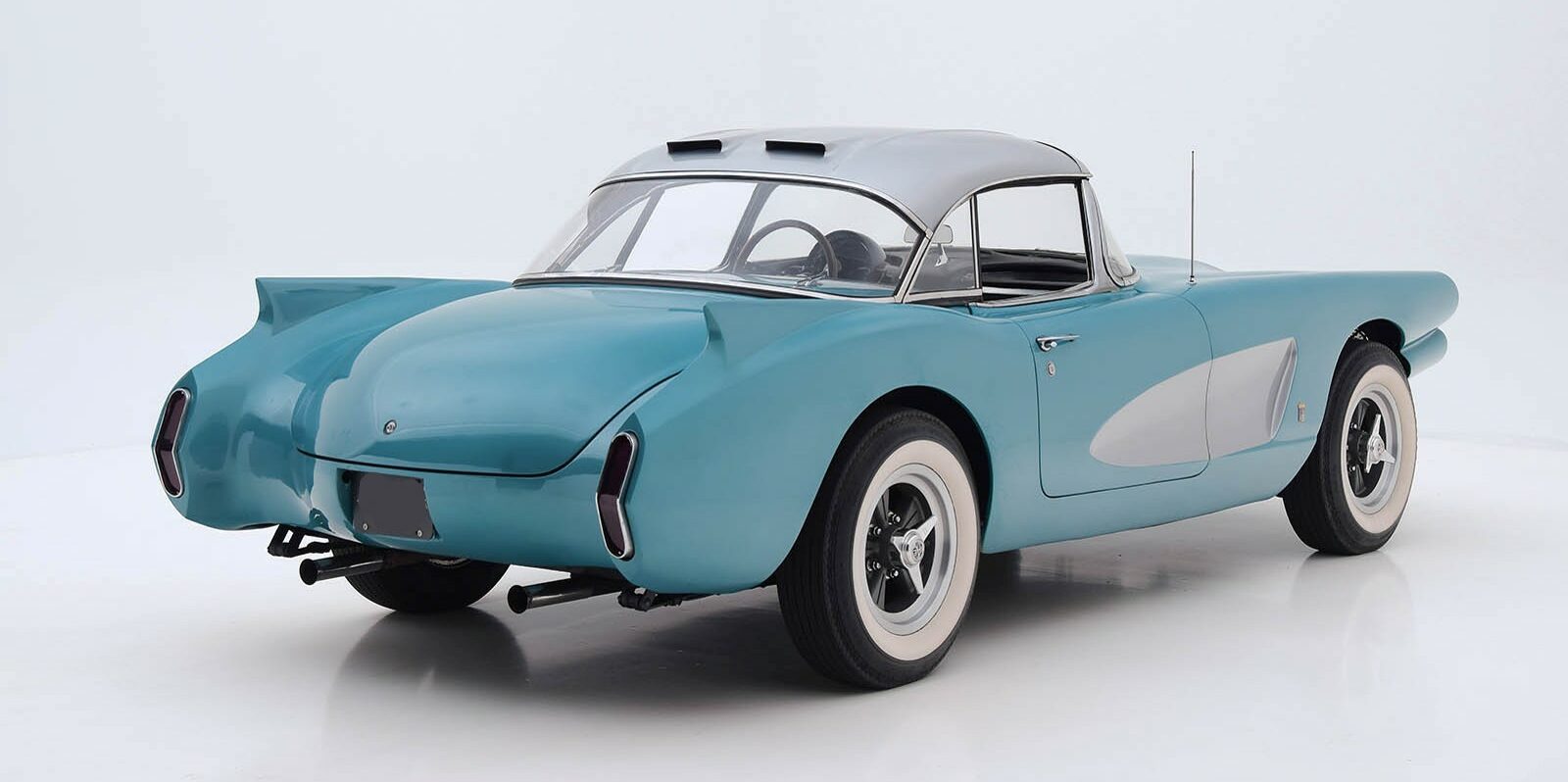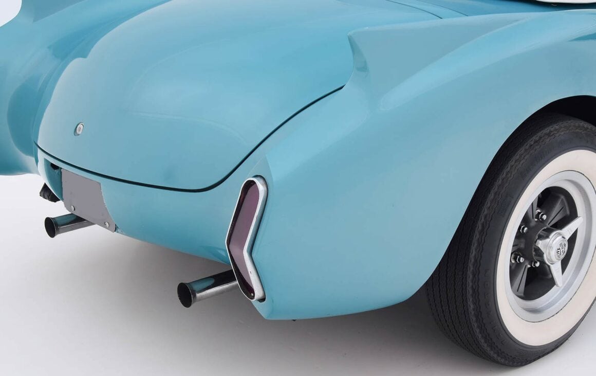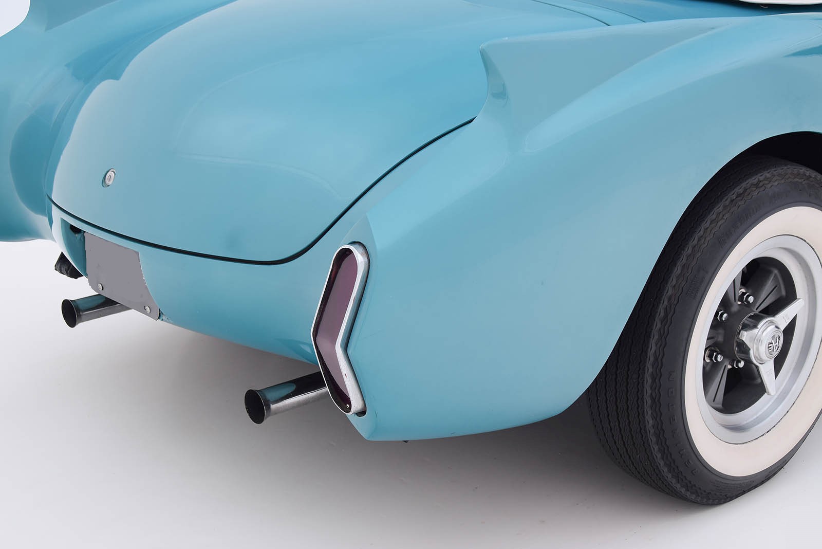 Pour la Corvette “Accessories International”, Barris a commencé par un restylage spectaculaire de l’extrémité avant, étendant les phares quadruples vers l’extérieur sur des “pods” plus prononcés. La calandre s’inspire directement de la XP 700, avec une forme ovale spectaculaire comprenant des écopes latérales intégrées. Une “pelle” de capot supplémentaire alimentant en air le carburateur, et des persiennes (fictives) en garnitures de capot façon Corvette de 1958 lissées. À l’arrière, la lourde garniture chromée a été retirée et des ailerons “Jet Age” prononcés façon Cadillac ont été greffés au sommet des ailes.