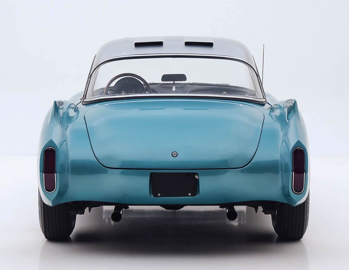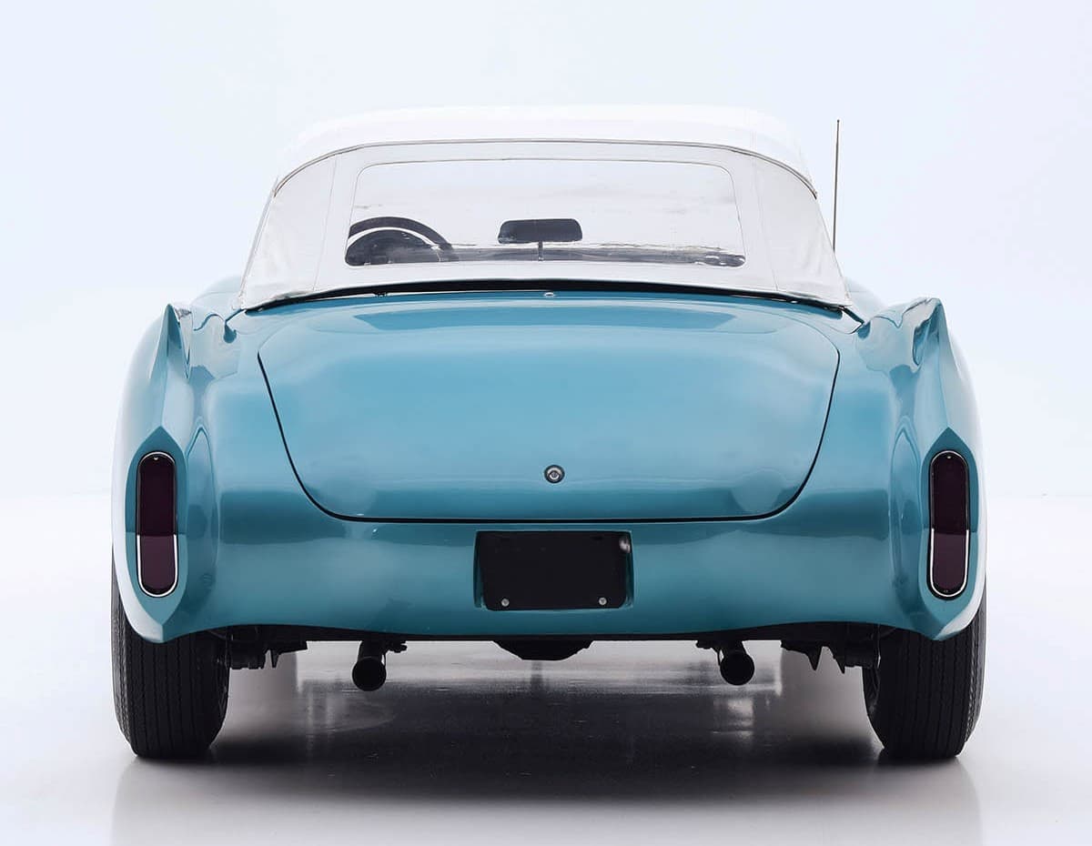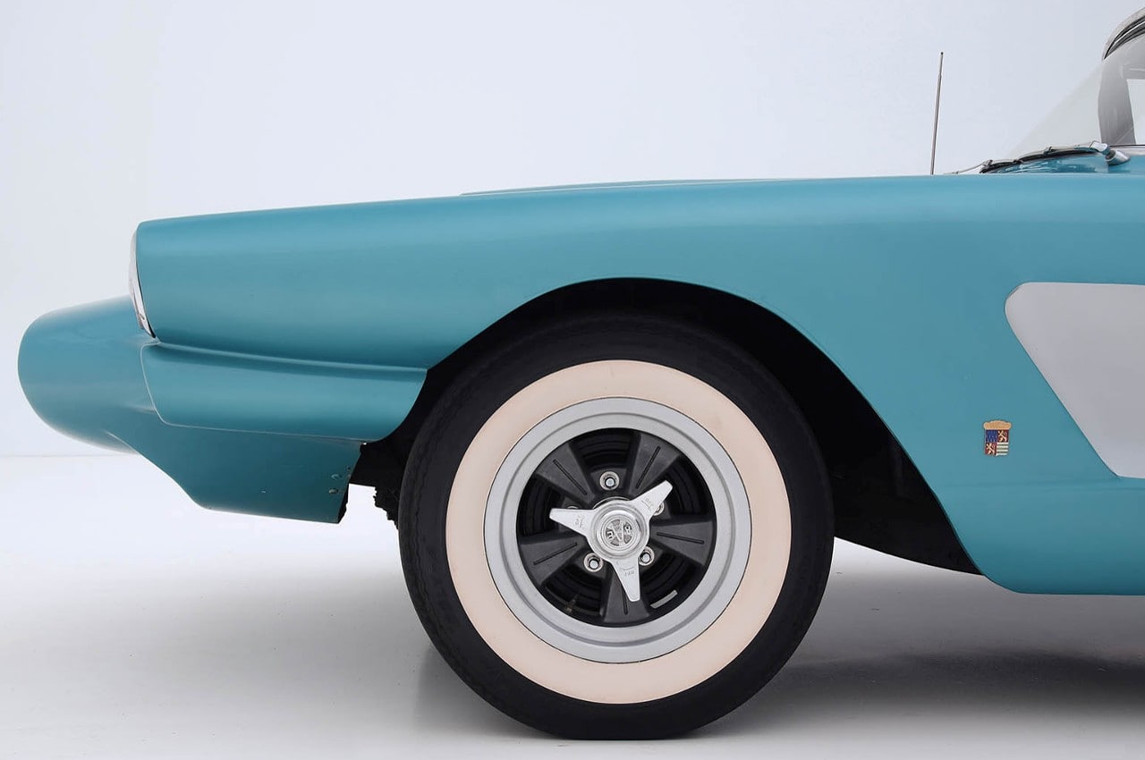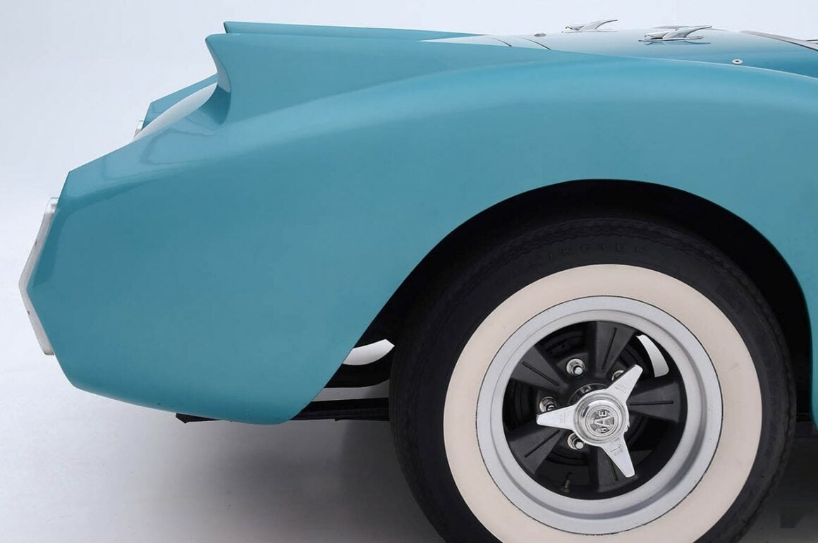Pour la Corvette “Accessories International”, Barris a commencé par un restylage spectaculaire de l’extrémité avant, étendant les phares quadruples vers l’extérieur sur des “pods” plus prononcés. La calandre s’inspire directement de la XP 700, avec une forme ovale spectaculaire comprenant des écopes latérales intégrées. Une “pelle” de capot supplémentaire alimentant en air le carburateur, et des persiennes (fictives) en garnitures de capot façon Corvette de 1958 lissées. À l’arrière, la lourde garniture chromée a été retirée et des ailerons “Jet Age” prononcés façon Cadillac ont été greffés au sommet des ailes.