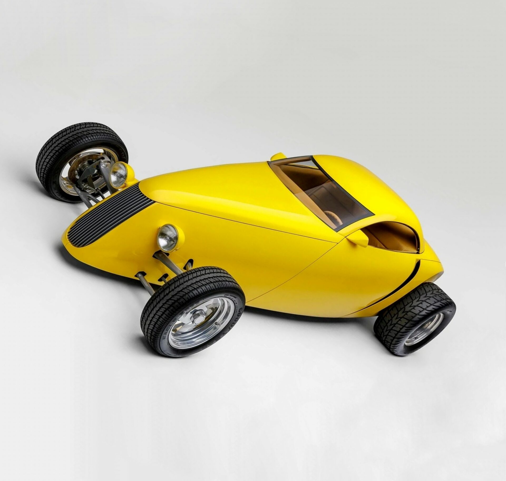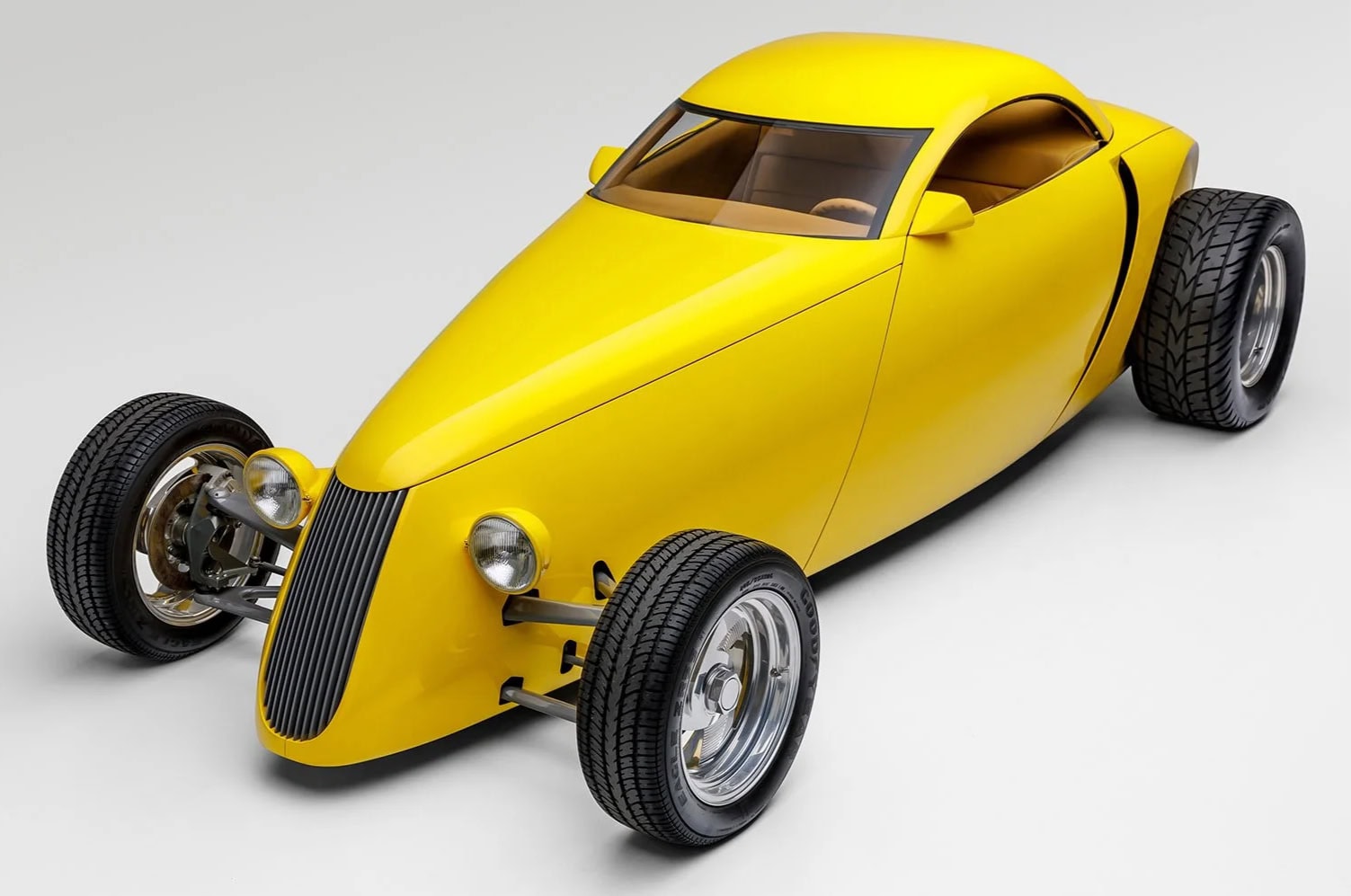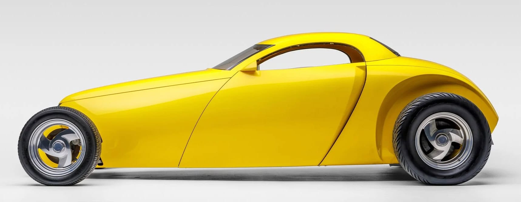 Propriétaire/constructeur d’origine : Boyd Coddington… Designer : Larry Erickson… Carrosserie : en aluminium personnalisée par Marcel DeLay… Calandre : façonnée à la main par Pelle Forsbert… Peinture : Laque acrylique perle appliquée par Greg Morrell… Habitacle : cuir Connolly beige par Ron Mangus… Châssis : Acier tubulaire… Mécanique : Moteur central reconstruit sur mesure au départ d’un Mitsubishi quatre cylindres turbocompressé de 1991