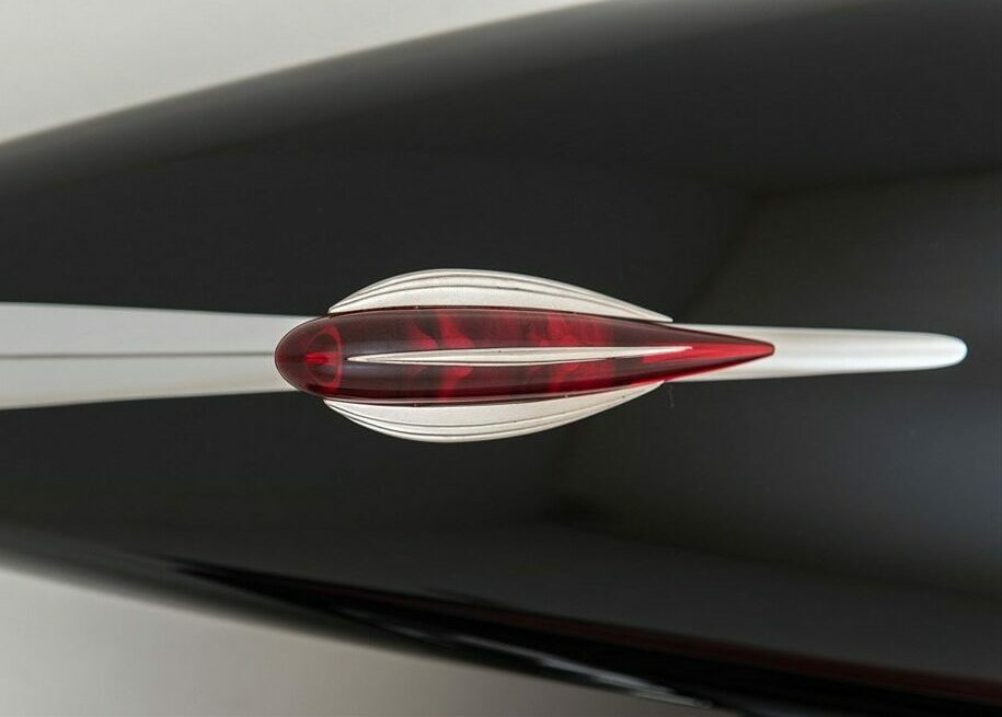 Les feux arrière de style fusée sont des ornements de capot Hudson de 1937 tournés à 180 degrés pour faire face à l’arrière, une sculpture appropriée pour capturer à la fois l’élégance et le sens de la vitesse. Les huit sorties d’échappement personnalisées qui s’étendent sous les deux ailes arrière font allusion aux possibilités de performance de la Bugnaughty. La voiture rend respectueusement hommage au nom Bugatti et au style intemporel de Figoni & Falaschi. La garniture en acier martelée à la main qui embrasse les ailes a été fabriquée par Tommy Caruso de Contour Metalshaping et Mark Barton de The Panel Shop.