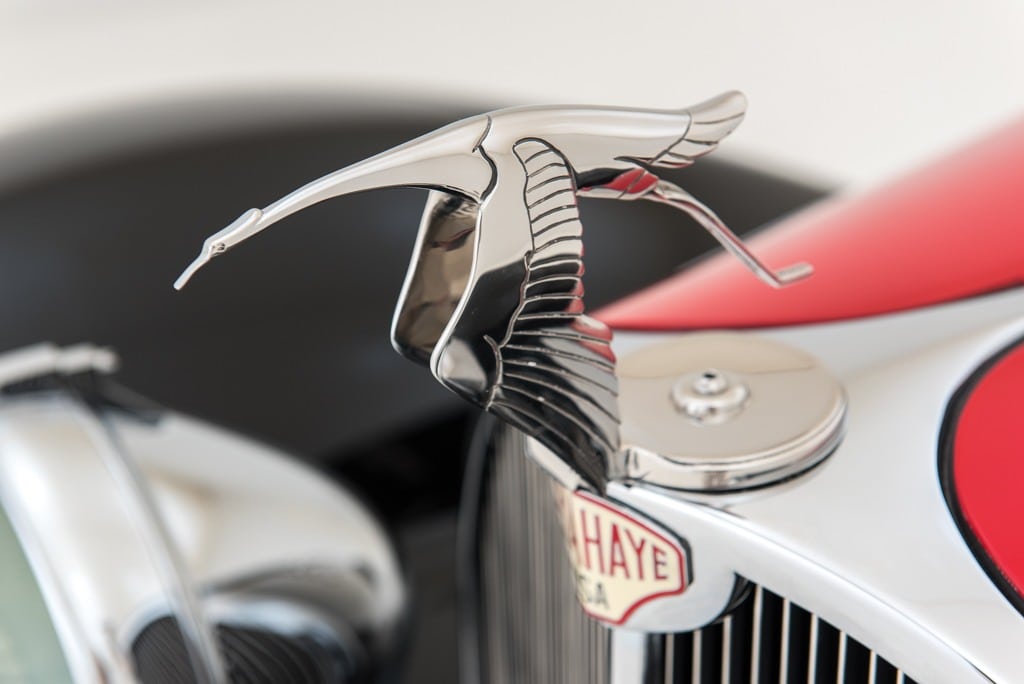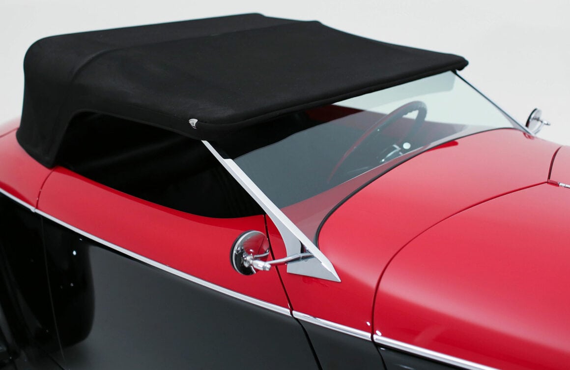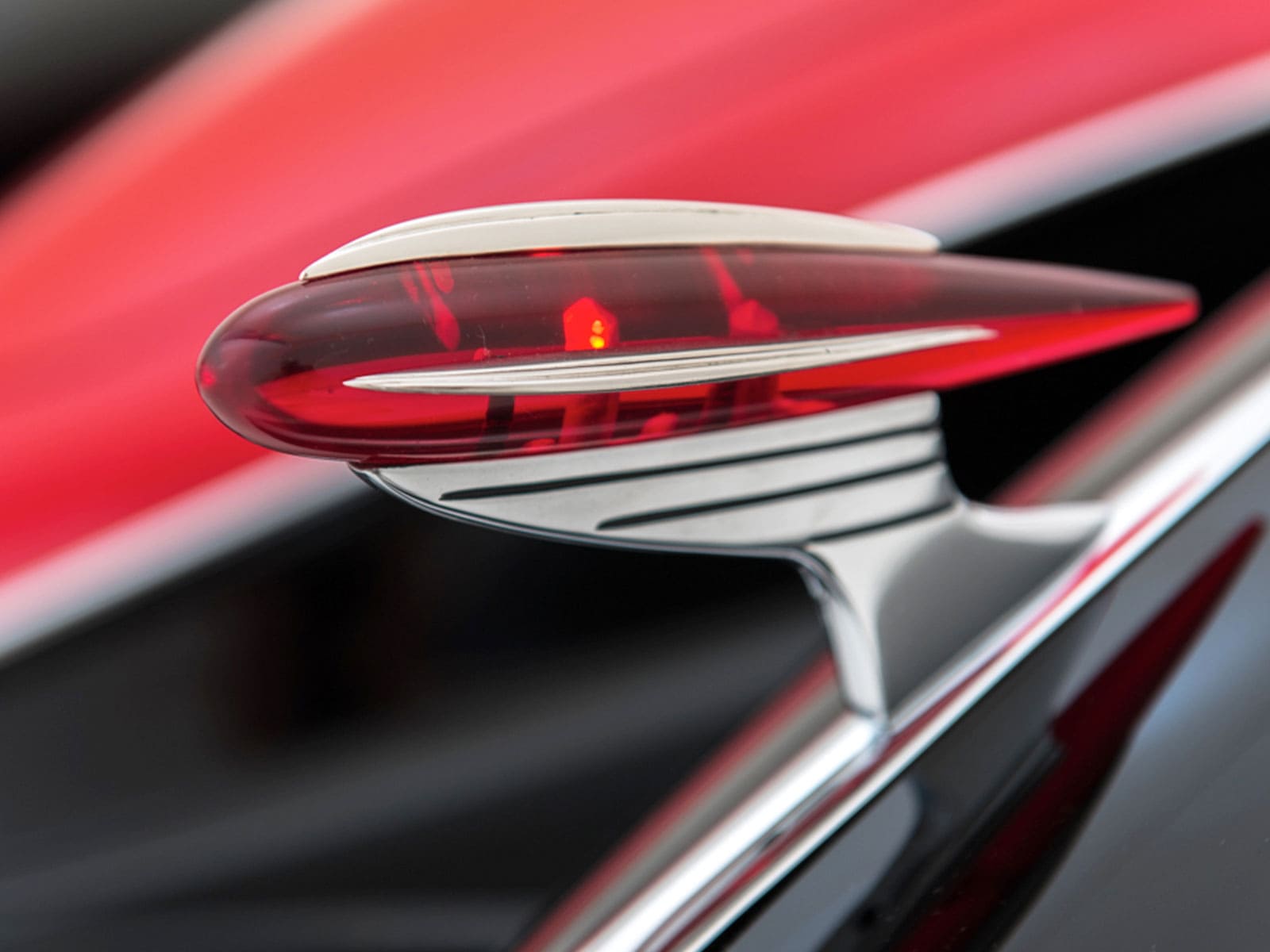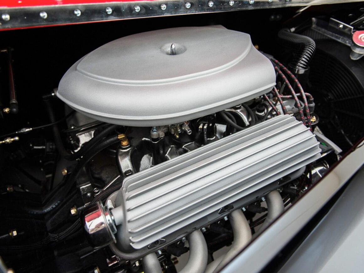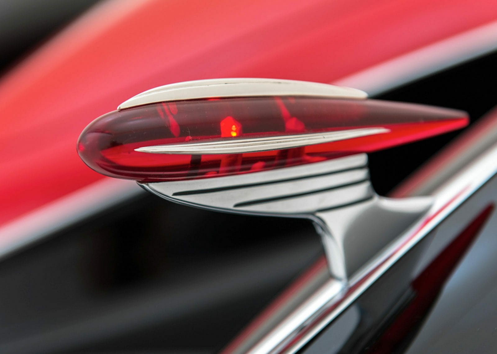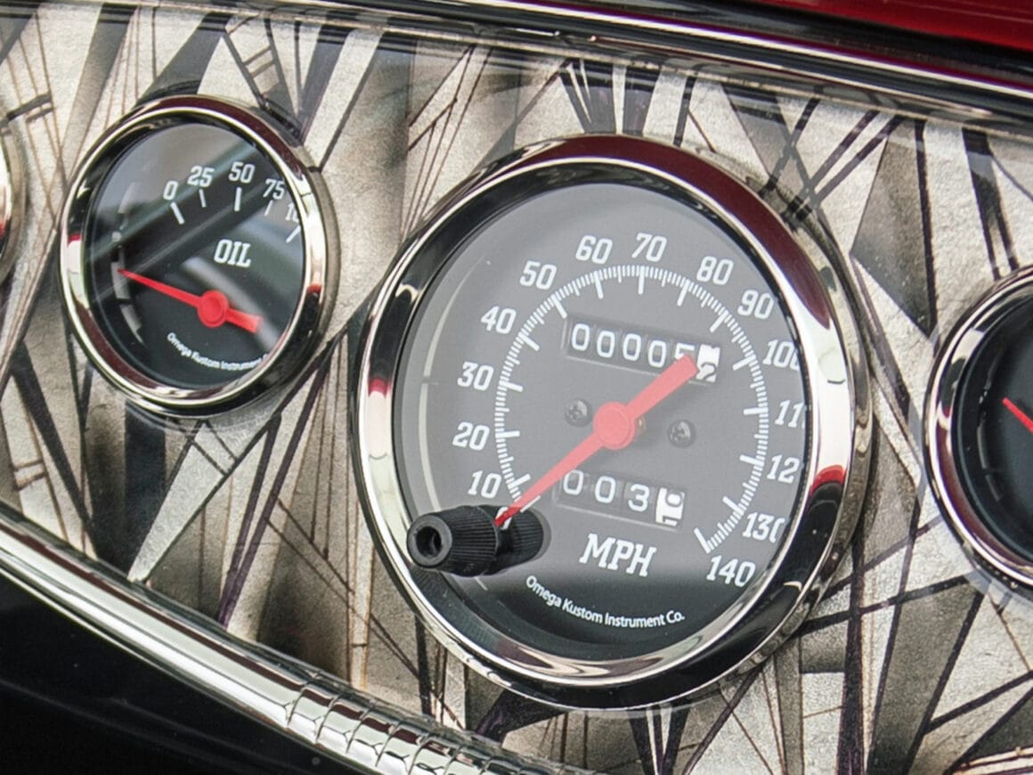 (Peinture par House of Kolor, Blueblood Red et S2BC25 jet black. Construit et peint par Brown’s Metal Mods, Port Leyden, NY. Placage chromé par Mark Silich de The Finishing Touch, Chicago, IL Intérieur en cuir par Murad de Dixie Auto Upholstery, Dayton OH. Châssis par Fat Man Fabrications, Mint Hill, Caroline du Nord. Tableau de bord par Don « The Egyptian » Boeke, Dayton, OH. Ornement de cigogne Hispano Suiza et feux arrière Hudson par American Arrow of Clawson, MI. Garniture d’aile arrière par Tommy Caruso de Contour Metalshaping de Plainfield, NJ)