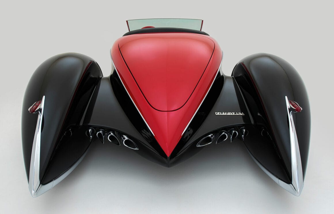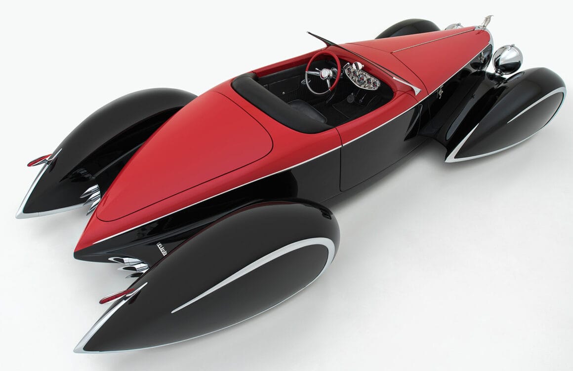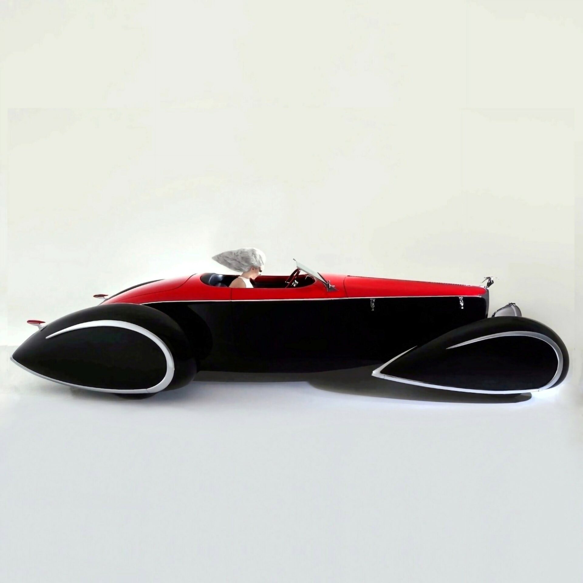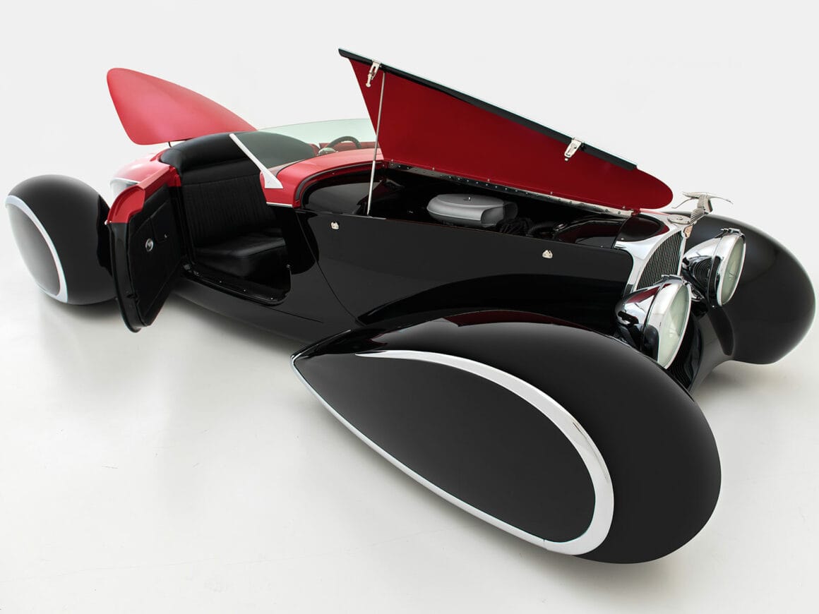 Les conceptions originales de la carrosserie Auburn Boat-tail Speedster de 1929-’36 provenaient d’Alan Leamy et de Gordon Buehrig, Vince Gardner…. Chip Foose s’en est inspiré pour concevoir la carrosserie en fibre de verre pour Deco Rides en 1999. Les ailes ponton entièrement fermées ont été inspirées de celles apparaissant à l’origine sur une Type 1935 Figoni & Falaschi Delahaye de 135. Ils sont issus du kit de queue de bateau Generation Two Deco Rides. La calandre et la coque en acier sont des répliques de la Type 1937S Bugatti de 57 coiffée d’un ornement de capot Hispano Suiza “cigogne volante”.