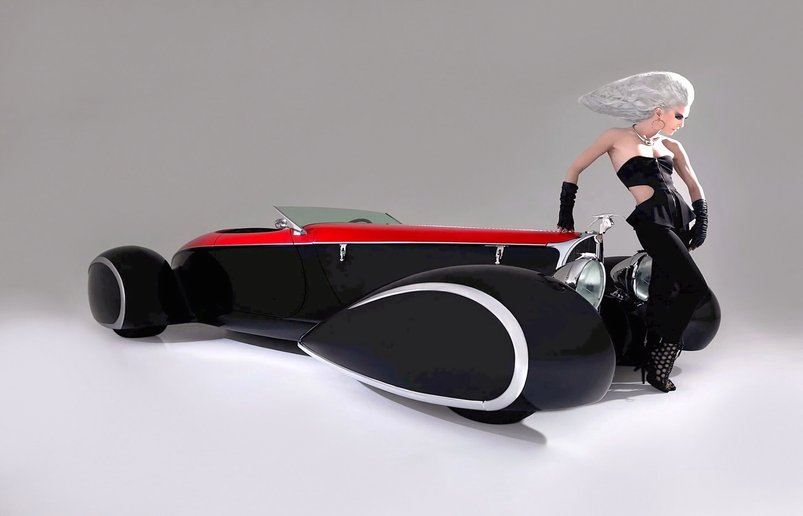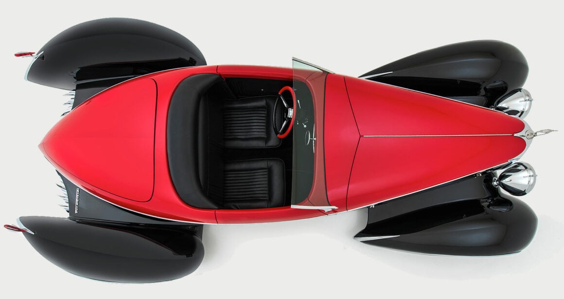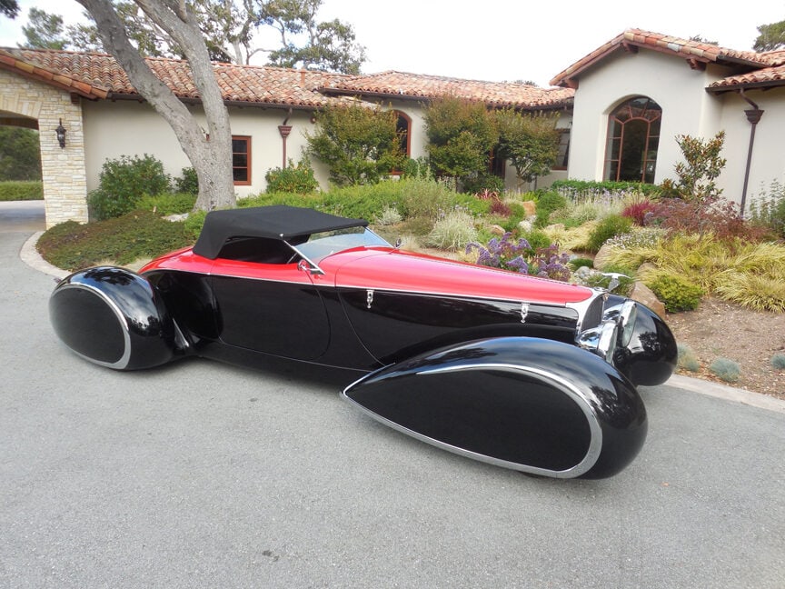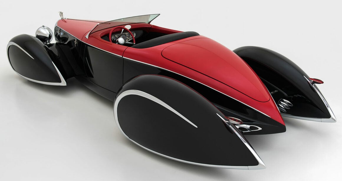 Les conceptions originales de la carrosserie Auburn Boat-tail Speedster de 1929-’36 provenaient d’Alan Leamy et de Gordon Buehrig, Vince Gardner…. Chip Foose s’en est inspiré pour concevoir la carrosserie en fibre de verre pour Deco Rides en 1999. Les ailes ponton entièrement fermées ont été inspirées de celles apparaissant à l’origine sur une Type 1935 Figoni & Falaschi Delahaye de 135. Ils sont issus du kit de queue de bateau Generation Two Deco Rides. La calandre et la coque en acier sont des répliques de la Type 1937S Bugatti de 57 coiffée d’un ornement de capot Hispano Suiza “cigogne volante”.