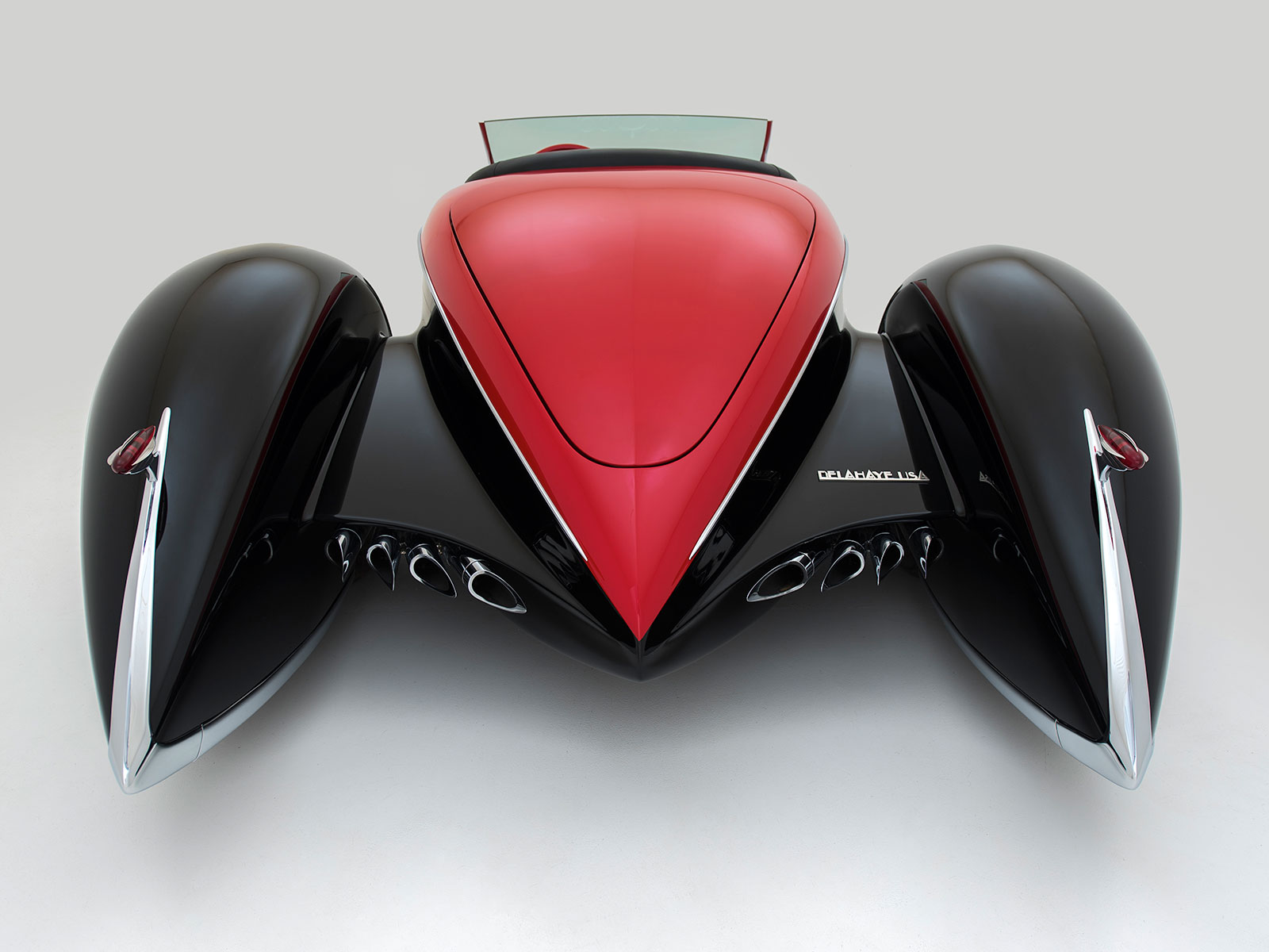 Peut-être la première voiture à ailes ponton fermée était la Mercedes 1935 500K profilée Erdman & Rossi. Les Allemands essayaient de rationaliser pour améliorer l’aérodynamique afin d’améliorer l’économie de carburant. Beaucoup sont totalement et désespérément accrochés et fascinés par les ailes pontons en tant que style. Par conséquent, pour Delahaye USA, les pontons joueraient un grand rôle. Alors que le Speedster original Generation One Deco Rides Boattail avait des passages de roue ouverts, un autre a été construit sur un châssis de Corvette C5 par Superior Custom Classics de Hudson, FL.