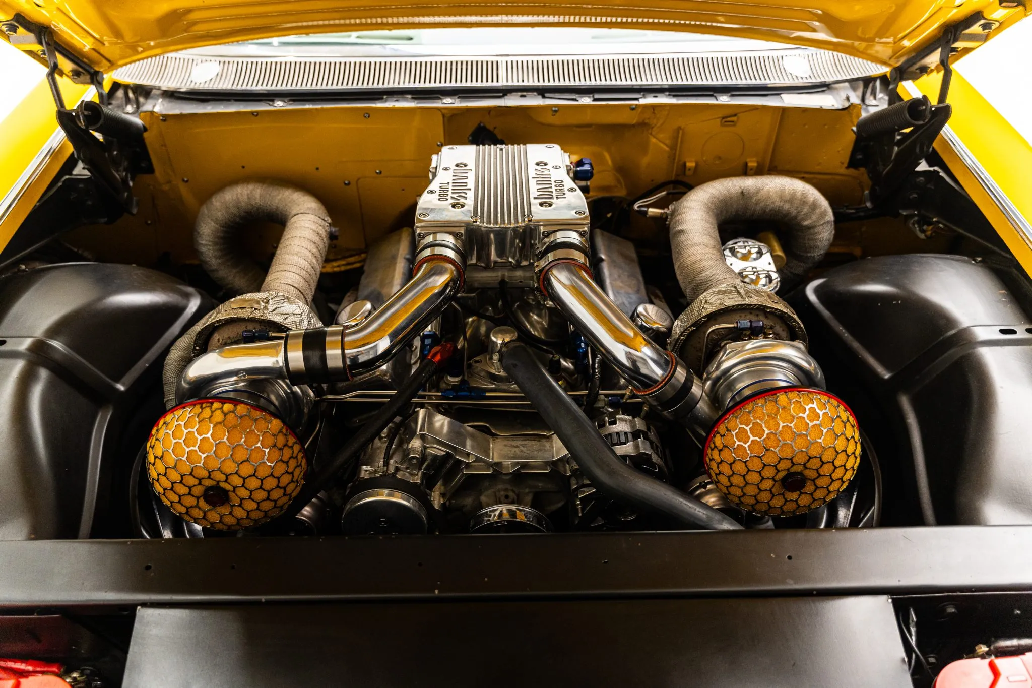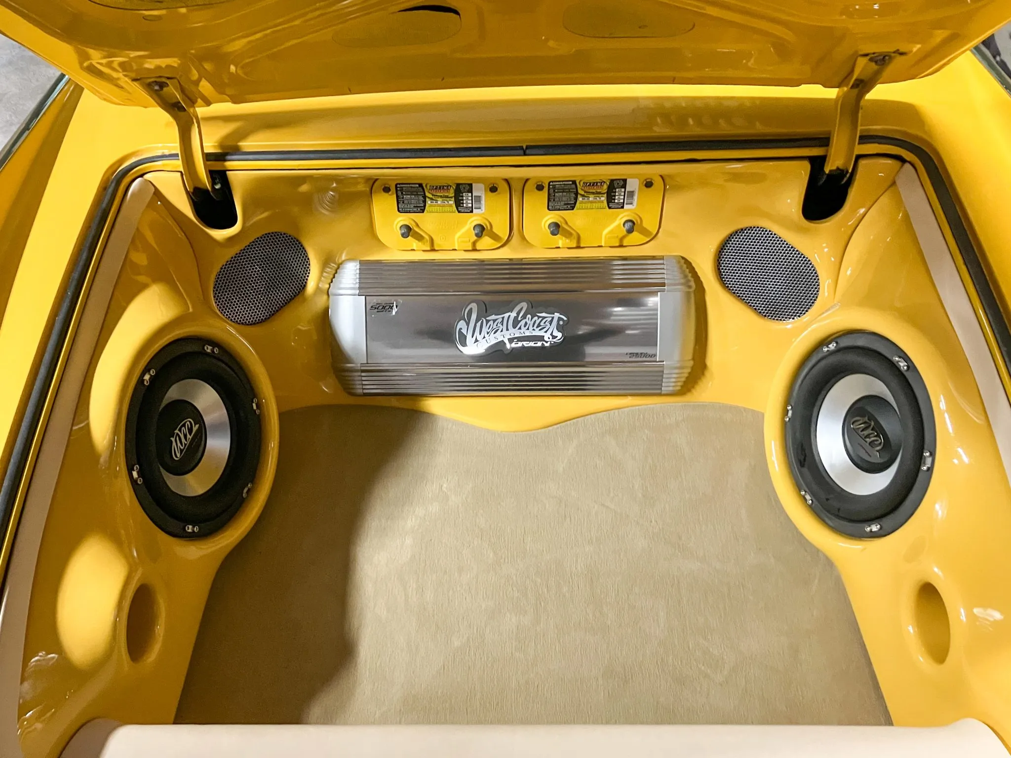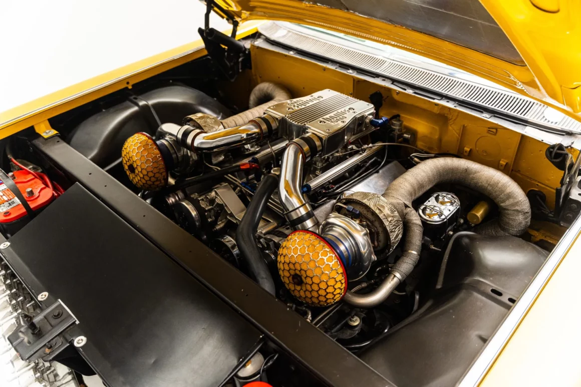 Son V8 Chevy small bloc est équipé d’un système biturbo Banks Power ainsi que d’un entraînement d’accessoires à courroie serpentine et de deux batteries Optima Red Top… Une transmission automatique à trois vitesses TH350 a été installés, l’ensemble assurant “le boulot” très correctement, donc très cool… La suspension a été abaissée et l’intérieur a été personnalisé et regarni d’une sellerie beige. Les points forts de la construction comprennent des portes “rasées”, des vrais tuyaux d’échappement (fonctionnels) à sorties latérales, des jantes de 20 pouces chaussées de pneus Yokohama AVS Sport 245/40 AV et 275/35 AR, des freins à tambours d’époque, des amortisseurs Bilstein, une unité principale infodivertissement McIntosh AM / FM / CD et une instrumentation AutoMeter.