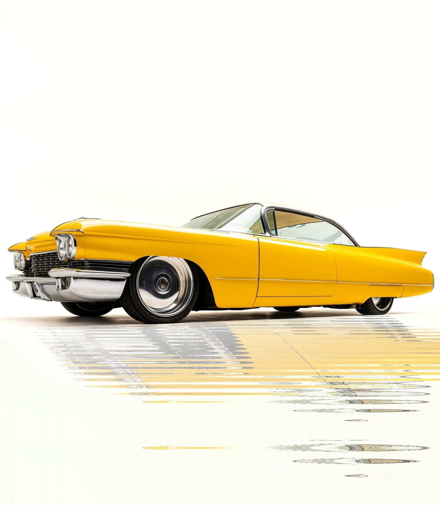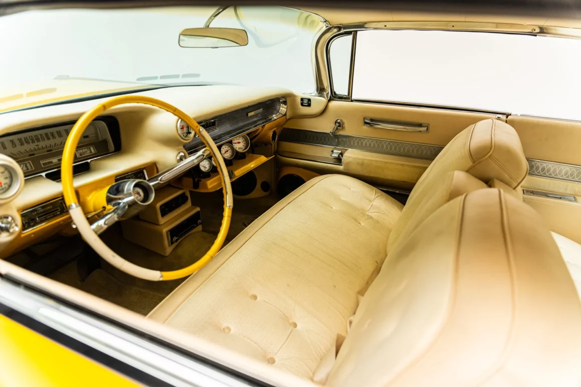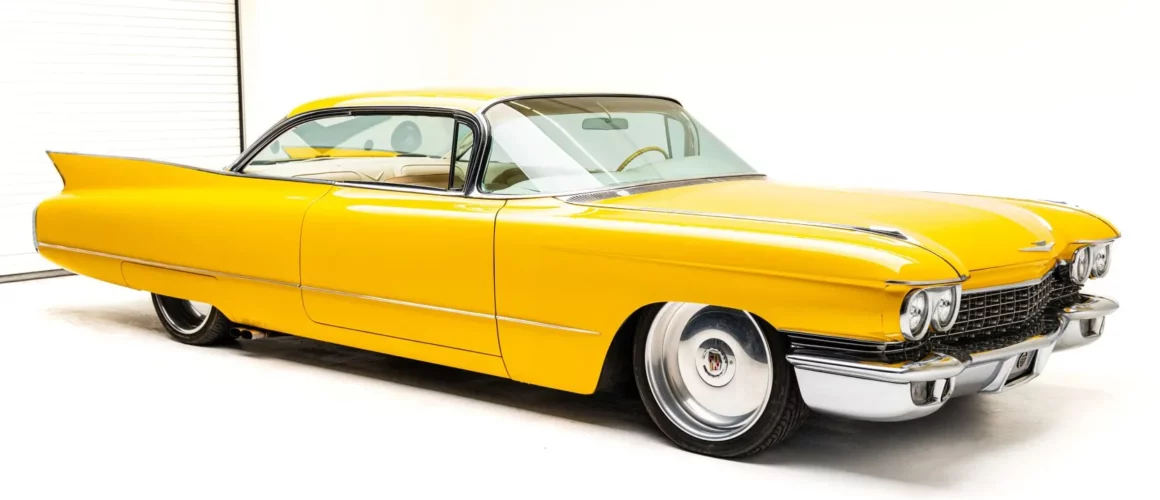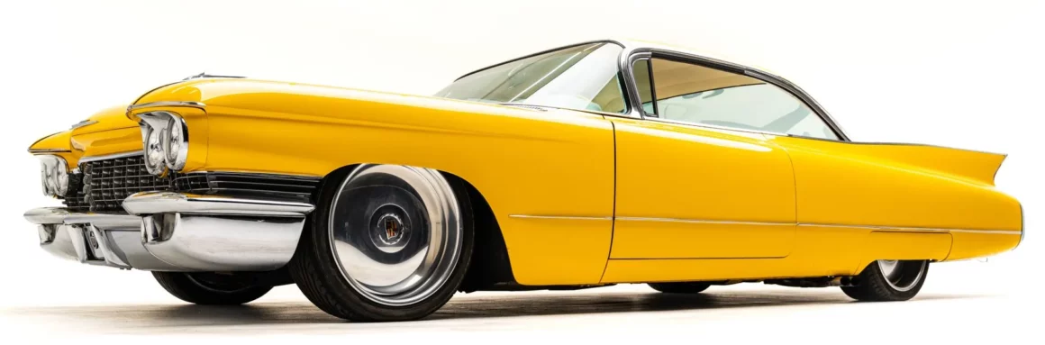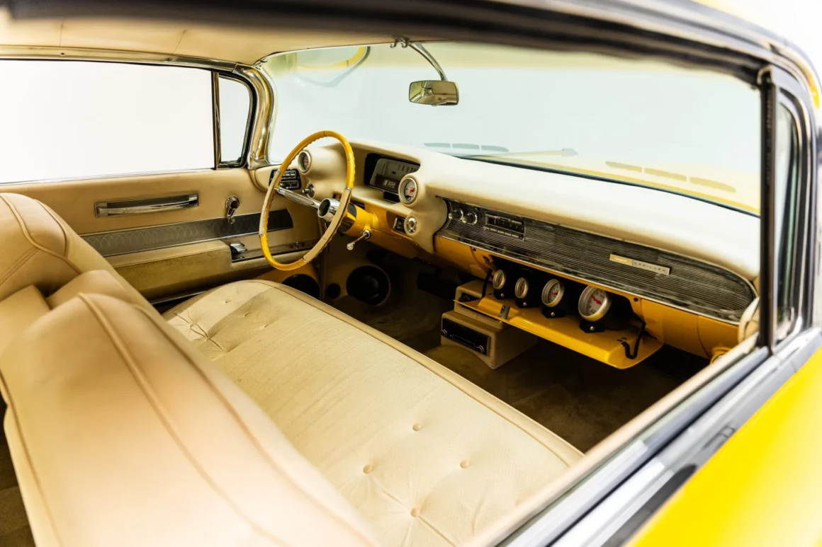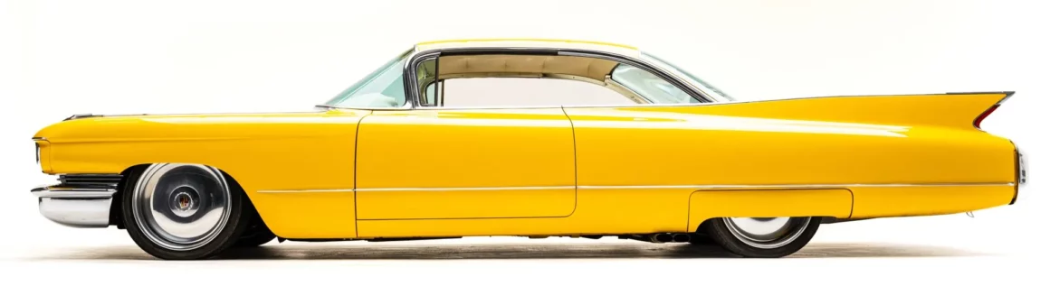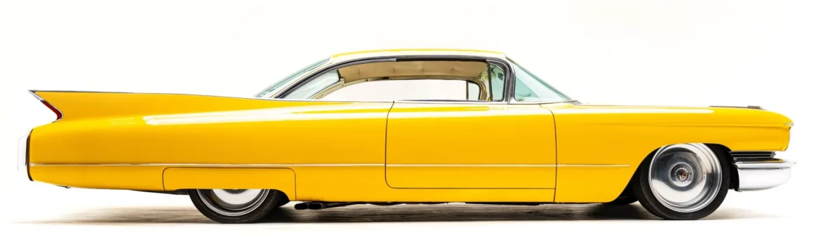 Cette Cadillac DeVille modifiée est réellement une auto de rêve… La voiture a quitté l’usine en 1960 finie en couleur sable persan (code 48), et les poignées de porte et autres objets “qui dépassent” ont été rasés avant la repeinture générale en jaune. Il y a la climatisation et les vitres sont électriques… Rouler dans cette Cadillac 60, c’est comme chevaucher un nuage, pas ces oreillers blancs gonflés, mais plutôt ces monstres qui précèdent un orage avec des tonnes de tonnerre et d’éclairs. La taille esbaudit la foule, éclipsant les autres voitures par son design, chaque centimètre étant le résultat de l’aérodynamique de la course à l’espace de l’époque. Pourtant, c’est la taille impressionnante qui renforce le style, créant un attrait général indéniable. C’est qu’en 1960, Cadillac avait encore le vent en poupe…