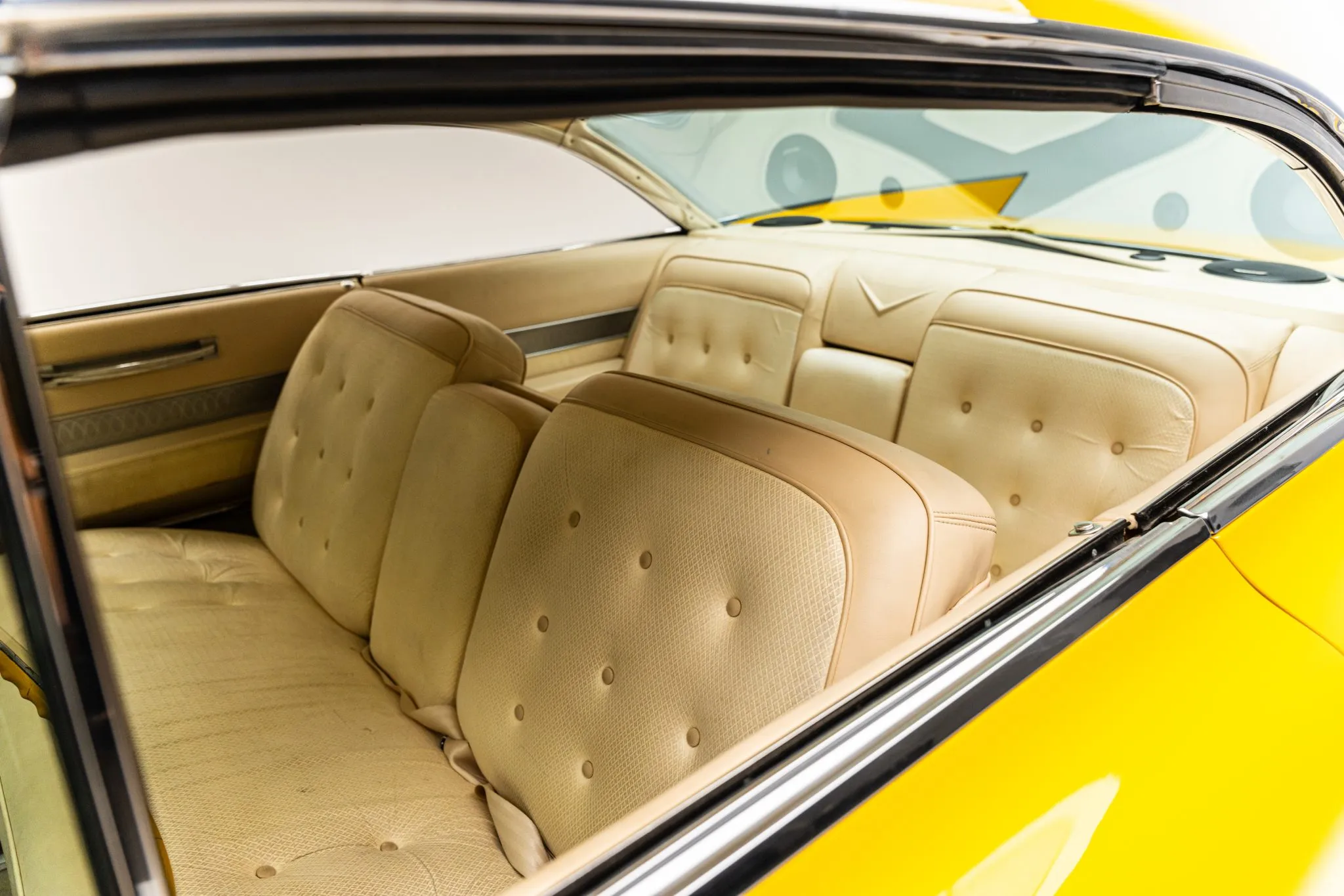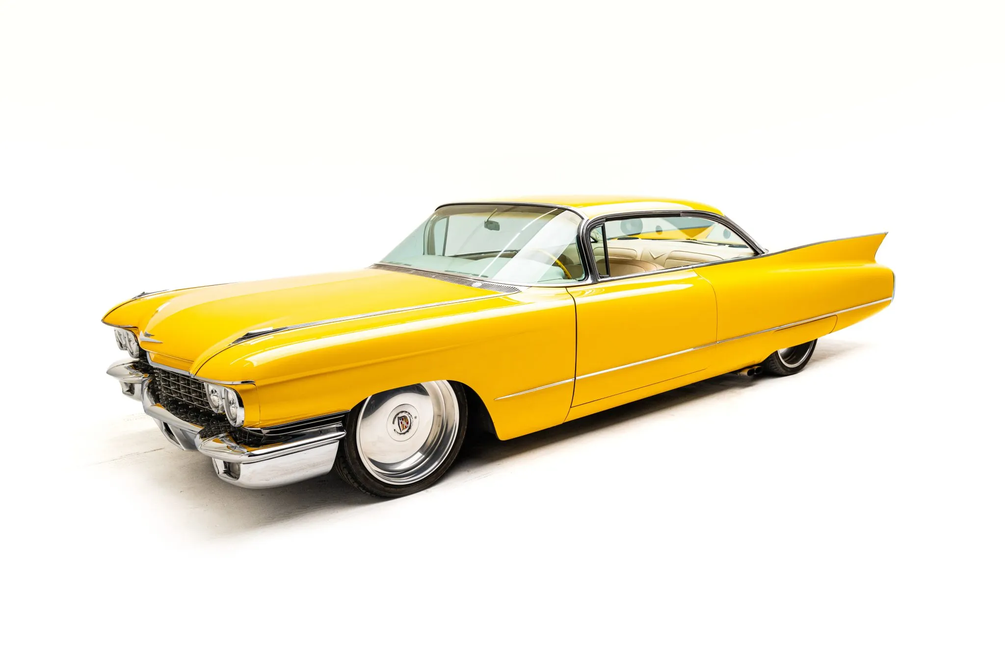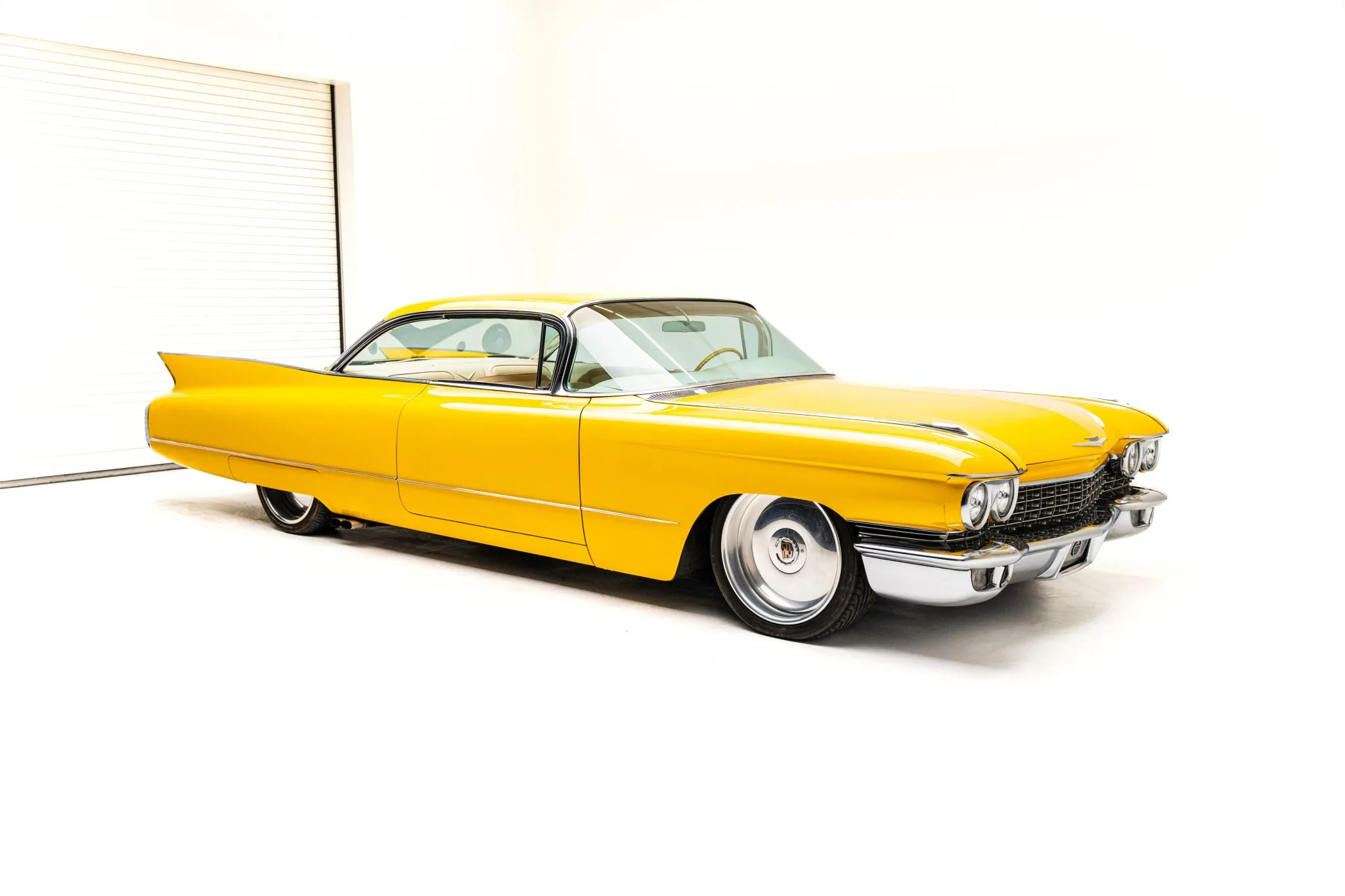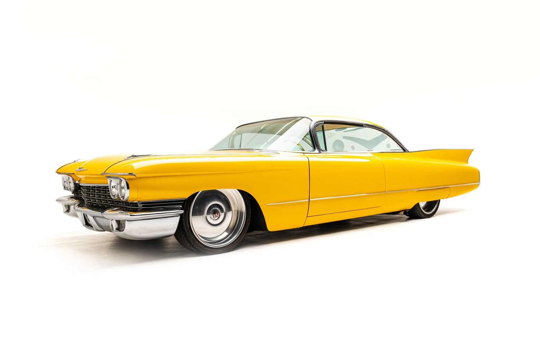 Cette Cadillac DeVille modifiée est réellement une auto de rêve… La voiture a quitté l’usine en 1960 finie en couleur sable persan (code 48), et les poignées de porte et autres objets “qui dépassent” ont été rasés avant la repeinture générale en jaune. Il y a la climatisation et les vitres sont électriques… Rouler dans cette Cadillac 60, c’est comme chevaucher un nuage, pas ces oreillers blancs gonflés, mais plutôt ces monstres qui précèdent un orage avec des tonnes de tonnerre et d’éclairs. La taille esbaudit la foule, éclipsant les autres voitures par son design, chaque centimètre étant le résultat de l’aérodynamique de la course à l’espace de l’époque. Pourtant, c’est la taille impressionnante qui renforce le style, créant un attrait général indéniable. C’est qu’en 1960, Cadillac avait encore le vent en poupe…