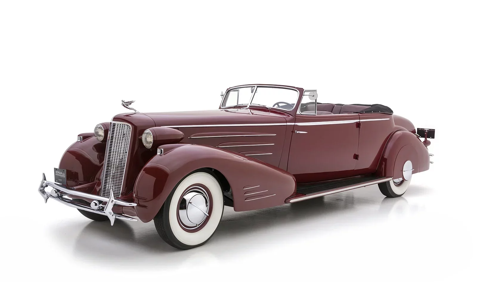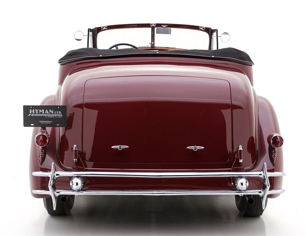 Cadillac voulait que le V16 reste au sommet du marché et le mettait à jour chaque année. Pour 1934, toute la gamme Cadillac avait été redessinée avec un magnifique nouveau style influencé par la période Art-Déco et Streamline-Moderne. Le nouveau design donnait l’illusion que les Cadillac étaient plus basses et plus longues qu’auparavant, avec des ailes ponton, des phares intégrés et des détails propres et linéaires. Des touches complexes comme les fabuleux pare-chocs biplan ont ensuite révélé l’inspiration de l’aviation. Mécaniquement, le V16 a été porté à 185 chevaux dans un châssis massif à empattement de 154 pouces. Pourtant, l’Amérique était encore en proie à la Grande Dépression, et malgré toute la splendeur visuelle et l’excellence de l’ingénierie, les ventes déclinaient. Cette V16 Cadillac unique à couper le souffle illustre l’élégance et la grandeur de l’ère classique et est une pièce étonnante du design précoce du Streamline. Selon les dossiers de construction et les recherches d’experts qui l’accompagnent, son châssis #51-44 a été commandé par le concessionnaire Randall-Donaldson Cadillac de Brooklyn, New York. La fiche de construction spécifie l’inspiration de Fleetwood pour la magnifique carrosserie du coupé convertible 2 portes Victoria-Fleetwood.