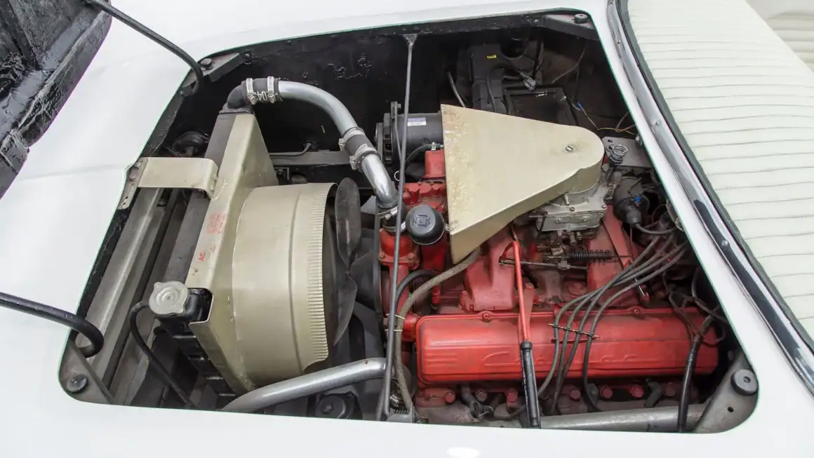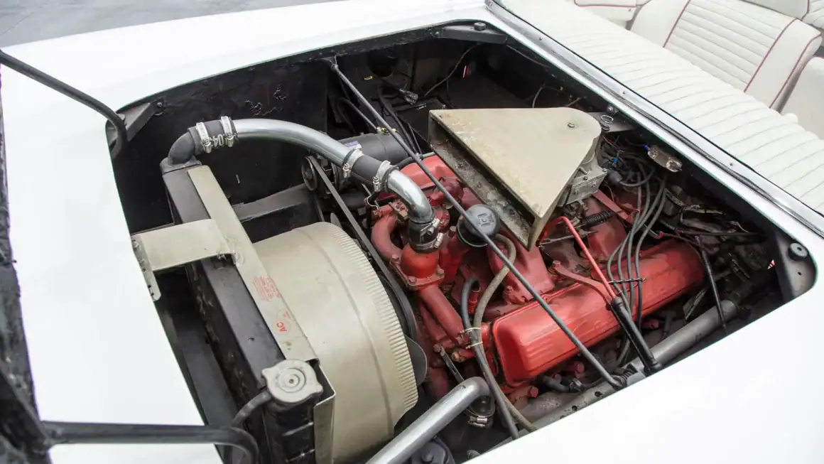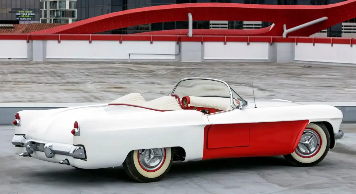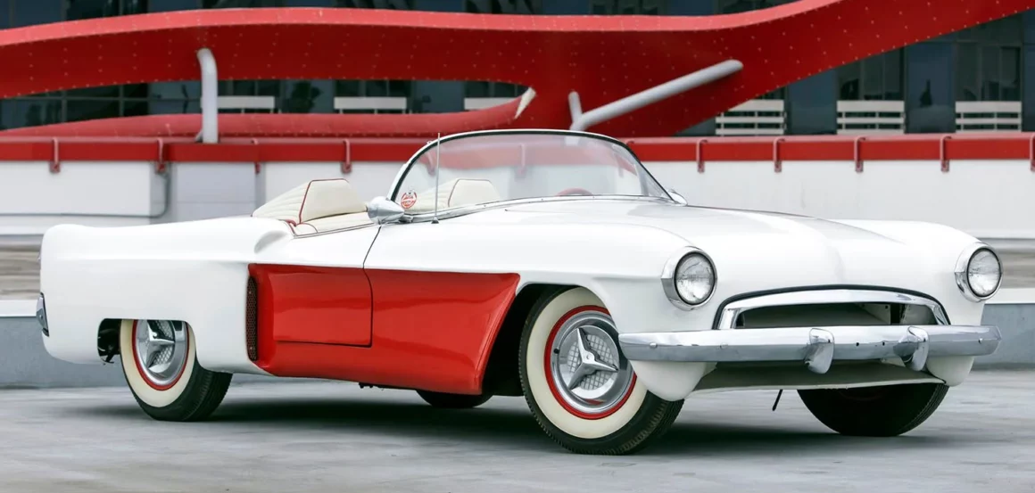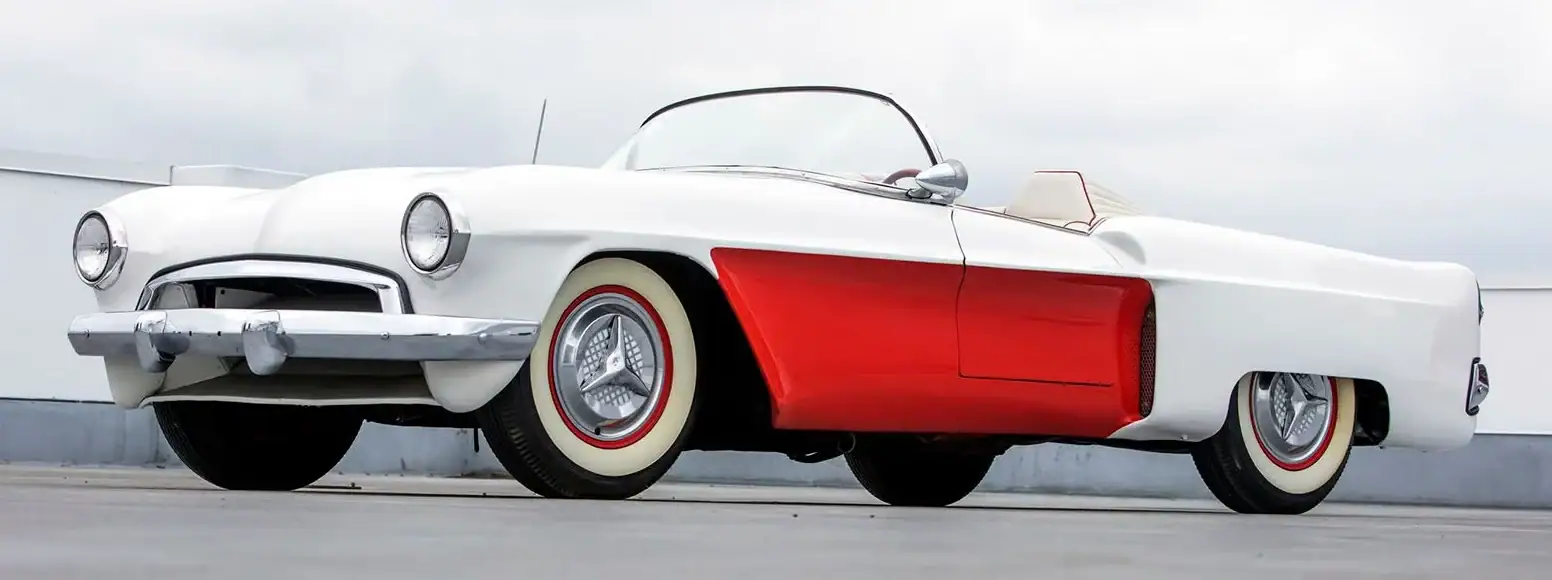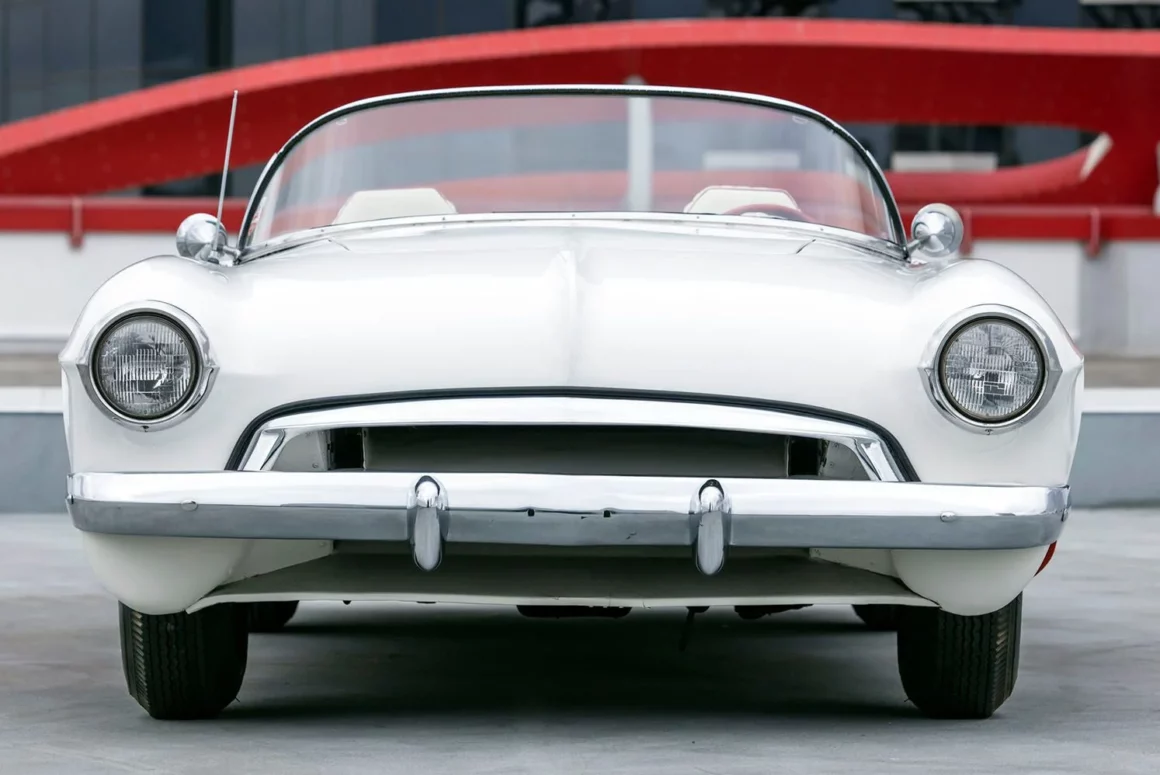Une fois le moule durci, il a été coupé en six sections pour faciliter la création des panneaux de carrosserie finaux. Les touches finales comprenaient les pare-chocs d’une Studebaker de 1953, les phares d’une Cadillac de 1953, la barre de calandre d’une Chevrolet de 1952, les feux arrière modifiés d’une Chevrolet de 1953 et, enfin et surtout, le pare-brise, qui était en fait la lunette arrière d’une Studebaker de 1953, à l’intérieur d’un cadre de Chevrolet Corvette.
