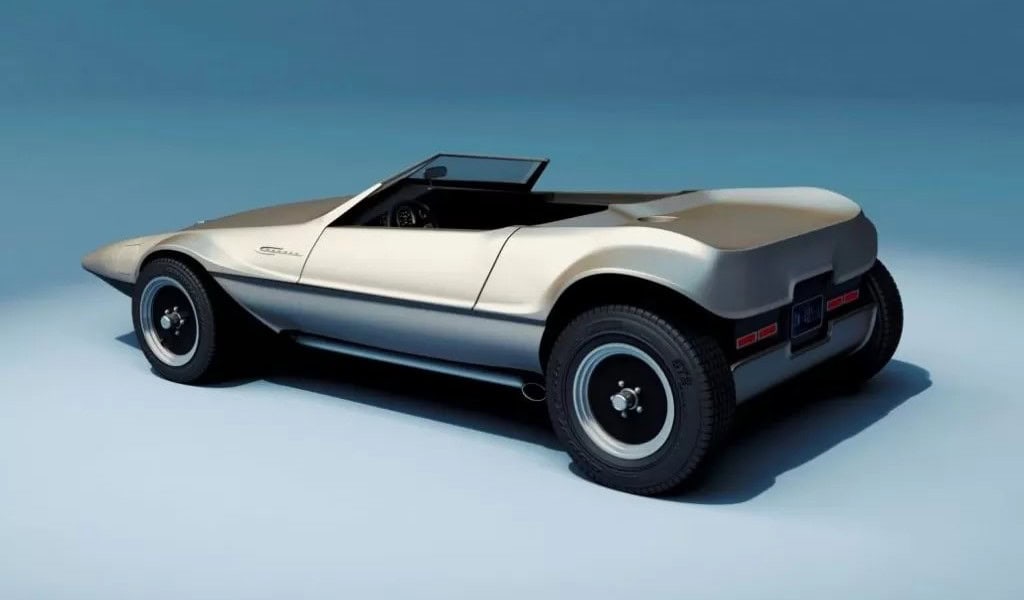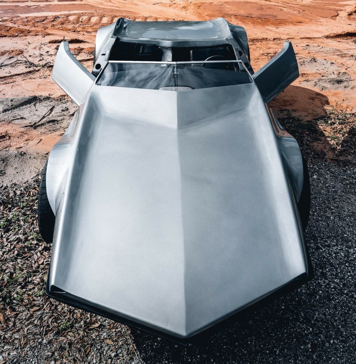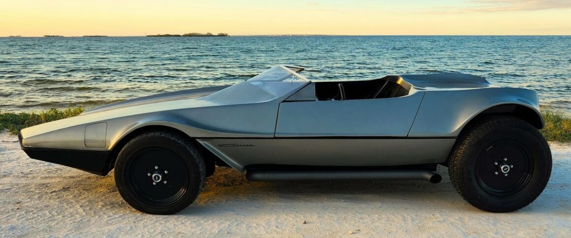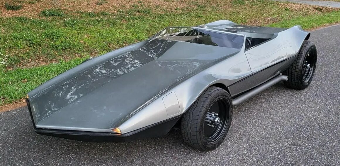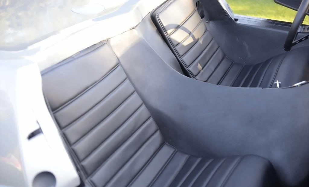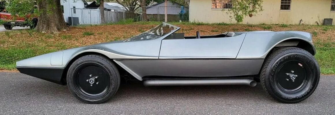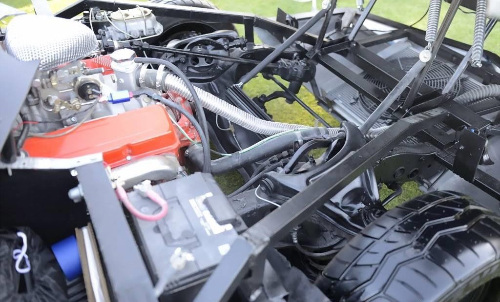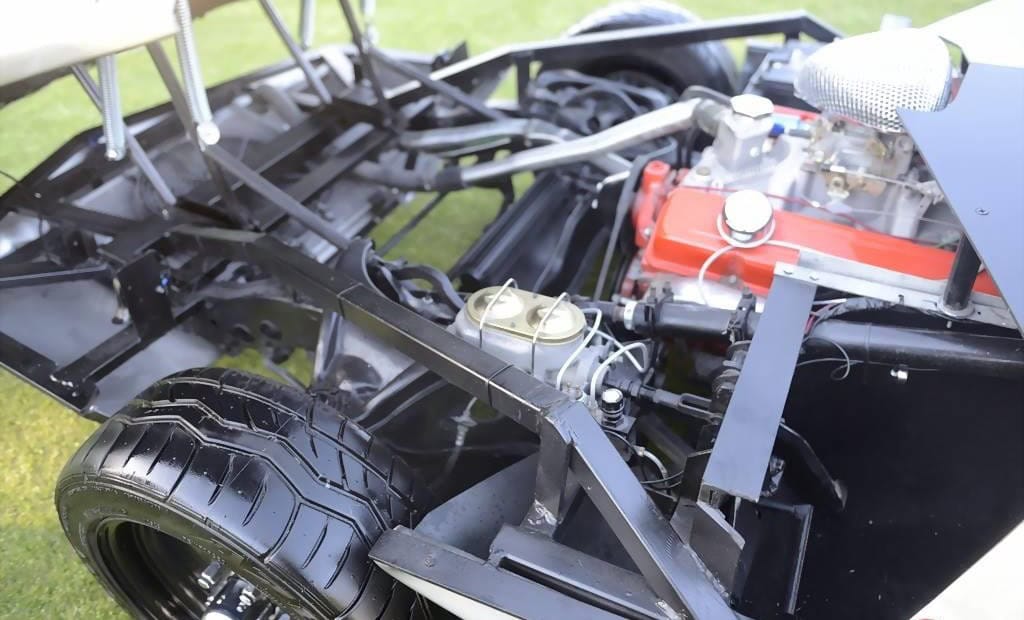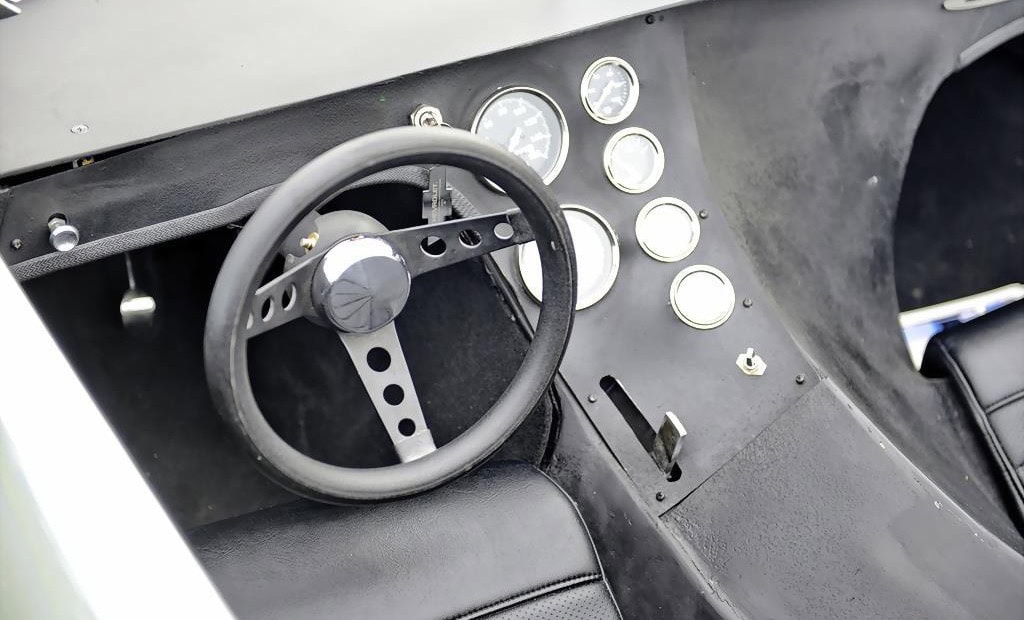 Voilà, on arrive au bout de l’affaite… Voici un p’tit résumé technique. La puissance est fournie par un small bloc Chevrolet V8 283ci (4,6 litres) équipé d’un carburateur Edelbrock quatre corps 650 CFM. Le Hot Rod est bon pour 280cv et 290 lb-pi de couple, une quantité considérable compte tenu du poids à sec de seulement 2 100 lb (952 kg). La puissance était envoyée aux roues arrière via une transmission automatique à trois vitesses et un essieu différentiel avec un rapport de démultiplication final de 3,55:1. Une paire de phares escamotables discrets sortent de trappes/portillons de chaque côté du capot, une caractéristique de conception unique que nous n’avons jamais vue utilisée sur des voitures de sport produites en série. Il a l’avantage supplémentaire de ne pas “gâcher” l’avant de la voiture avec les découpes pour des phares escamotables plus standard. La carrosserie est très légère car elle est en grande partie fabriquée en fibre de verre avec un peu d’aluminium, elle présente un profil cunéiforme saisissant avec des passages de roues légèrement incurvés.