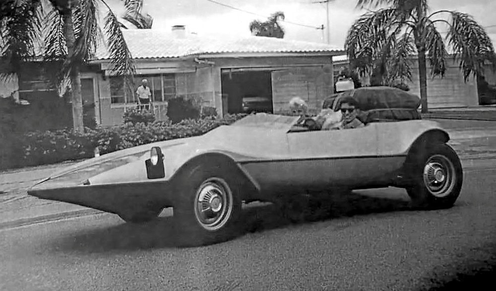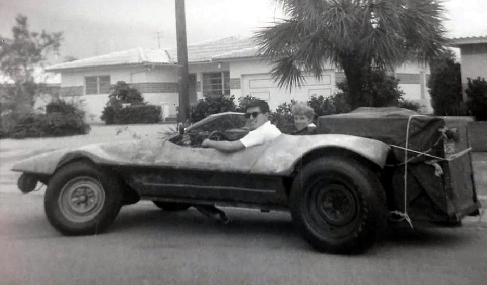 Voici l’incroyable histoire de Ray Cannara qui est né et a grandi à St Petersburg, en Floride et s’est intéressé très tôt à tout ce qui concernait l’automobile. A l’âge de 15 ans, en 1962 il a remporté la bourse gagnante de la “Fisher Body Guild” pour sa soumission de conception d’une voiture miniature qui était déjà le projet qu’il avait d’en faire une vraie. Ray Cannara a reçu 4.000 $ (environ 40.000 $ en argent d’aujourd’hui) et il a utilisé cette somme pour aider sa mère et en partie pour construire sa “Cannara Wedge”. Une fois terminée, il a fêté cela en partant en voyage avec sa mère ( Ici, ci dessous vous voyez Ray Cannara et sa mère en Floride alors qu’ils s’apprêtent à embarquer pour leur incroyable voyage à travers le pays avec leur Cannara, de Saint-Pétersbourg en Floride à Los Angeles en Californie, soit une distance de 2.547 milles. Notez les bagages attachés à l’arrière de la voiture et les phares escamotables déployés dans la seconde image. La voiture n’ayant pas de toit rabattable, on peut affirmer sans risque que Ray et sa mère ont voyagés plus qu’un peu balayés par le vent.