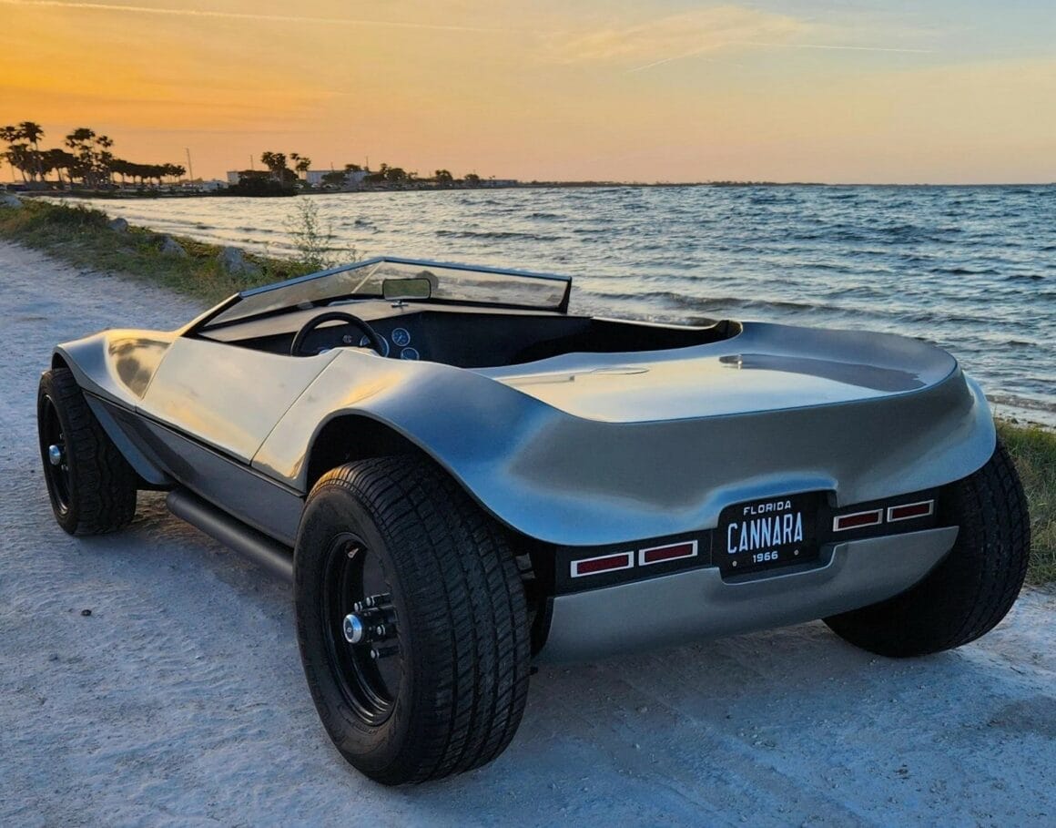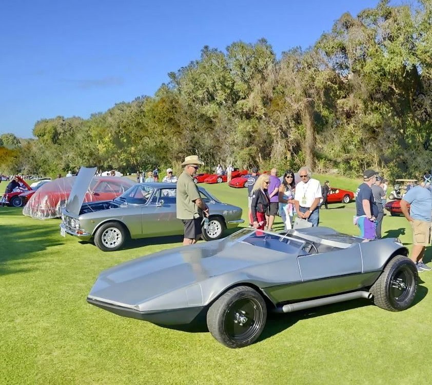 Le pare-brise en deux parties fait partie de la carrosserie (qui n’existait pas au départ lors du premier voyage). Il est intéressant de noter que l’admission du carburateur est montée du côté passager pas loin du pare-brise, c’est dire à quel endroit le moteur est positionné fort en arrière dans le châssis afin d’offrir un équilibre optimal. La vitesse maximale du Cannara est de 131 mph, bien que je soupçonne que cela puisse être limité par l’engrenage choisi plus que par la puissance, le poids ou l’aérodynamisme. Le temps de 0 à 60 mph n’est que de 5,0 secondes, ce qui en fait une véritable fusée selon les normes du milieu des années 1960. Le Hot Rod Cannara Wedge 1966 a été STAR de ce qui est certainement l’événement de concours de voitures anciennes le plus prestigieux au monde, le Concours d’élégance de Pebble Beach en classe Wedge 2024 dédiée aux concept-cars wedge uniques très influents, apparaissant aux côtés de l’Aston Martin Bulldog, de la Ghia Gilda, de la Ferrari Modulo, de la Lancia Stratos HF Zero et de quelques autres dont une Vector W2…