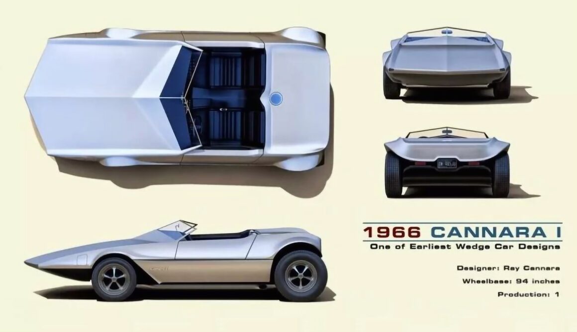 Toutes seront copiées par l’emblématique “Lamborghini Countach 1974 Bertone” puis par la “Vector W2 de Jerry Wiegert 1978”, qui, de surcroit copiait/plagiait plus qu’elle s’inspirait de la Bertone Carabo… La “Cannara Wedge 1966” présentait un style tout à fait unique, motorisée d’un small bloc V8 Chevrolet et sa carrosserie légère était en fibre de verre. Ray Cannara a conduit sa création de Floride en Californie pour s’inscrire et suivre des cours au prestigieux “Art Center for Transportation Design”. C’est de là, à l’insu de Ray Cannara, que sont parties des photos et commentaires à destination de divers designers situés dans toutes les parties du monde. L’institut cherchait à démontrer être à l’origine de l’inspiration (ce qui était un mensonge puisqu’elle datait d’avant son inscription) pour nouer des contacts qui n’ont jamais eu lieu… La bassesse humaine est sans limite… Cela n’a donc pas permis au créateur Ray Cannara de bénéficier de son génie créatif et d’en être rémunéré…