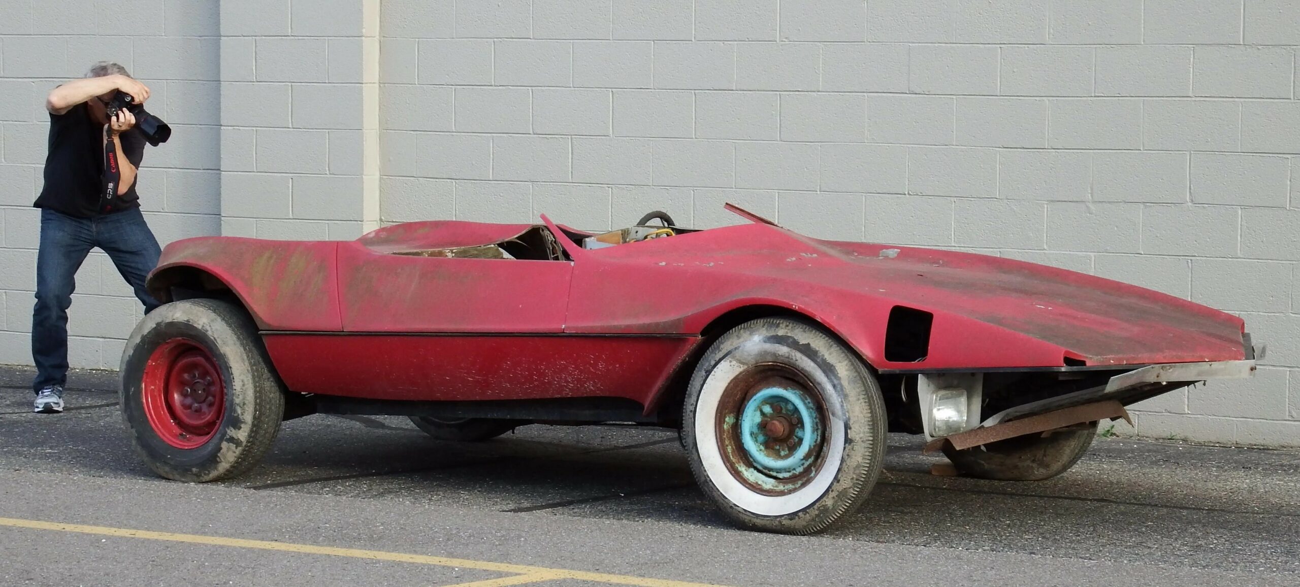 Malheureusement, Ray Cannara n’a pas reçu le crédit pour son influence sur l’avenir du design automobile dans le monde, il a gardé son chef d’œuvre dans le box garage ou il avait été construit jusqu’à la fin des années 1970, date à laquelle il l’a vendu par besoin de liquidités. Après une utilisation dans des conditions inconnues, le Hot Roadster “Cannara Wedge” finira ensuite stocké sur un terrain vague pendant de nombreuses années jusqu’à ce qu’il soit redécouvert par Geoff Hacker de Undiscovered Classics en 2016. Le principal problème rencontré par Geoff Hacker était que, lorsqu’il a découvert l’épave du Cannara Wedge, personne ne savait ce que c’était. Il a échangé un kit Cimbria pour avoir la propriété de cette épave et est retourné à son garage à Tampa, en Floride, puis a commencé à tenter d’en retracer l’histoire. Il avait remarqué le point de pivot inhabituel des portes et avait deviné qu’elles avaient été conçues et construites par un professionnel, et non par un amateur de jardin. Il s’est avéré qu’il avait plus raison qu’il n’aurait pu l’imaginer.