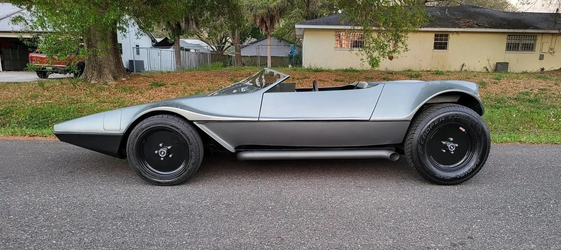 Voilà, on arrive au bout de l’affaite… Voici un p’tit résumé technique. La puissance est fournie par un small bloc Chevrolet V8 283ci (4,6 litres) équipé d’un carburateur Edelbrock quatre corps 650 CFM. Le Hot Rod est bon pour 280cv et 290 lb-pi de couple, une quantité considérable compte tenu du poids à sec de seulement 2 100 lb (952 kg). La puissance était envoyée aux roues arrière via une transmission automatique à trois vitesses et un essieu différentiel avec un rapport de démultiplication final de 3,55:1. Une paire de phares escamotables discrets sortent de trappes/portillons de chaque côté du capot, une caractéristique de conception unique que nous n’avons jamais vue utilisée sur des voitures de sport produites en série. Il a l’avantage supplémentaire de ne pas “gâcher” l’avant de la voiture avec les découpes pour des phares escamotables plus standard. La carrosserie est très légère car elle est en grande partie fabriquée en fibre de verre avec un peu d’aluminium, elle présente un profil cunéiforme saisissant avec des passages de roues légèrement incurvés.