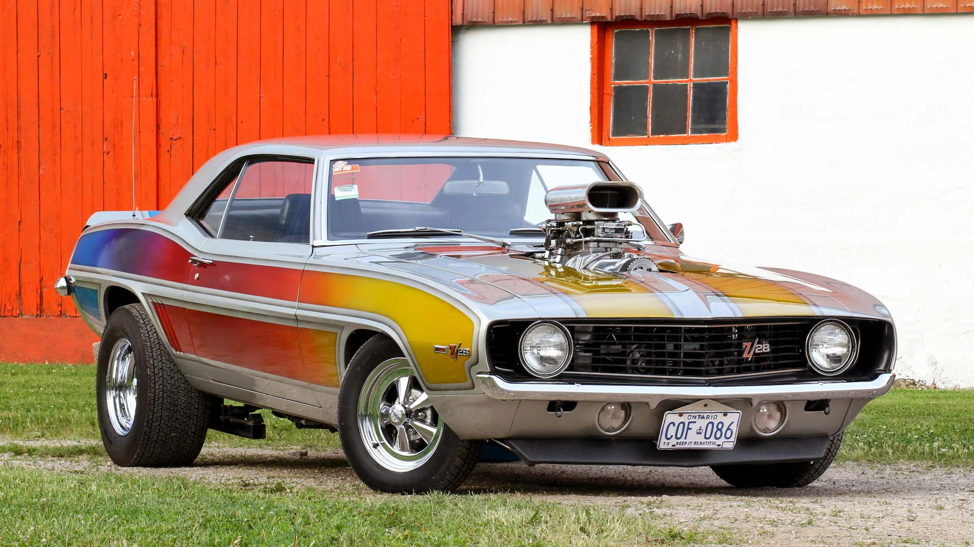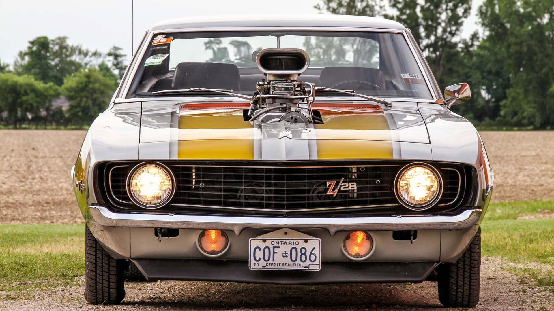 Aaaarghhhhhhhh ! Retour aux grandes années Chromes&Flammes avec une Chevrolet Camaro Z/28 Blower 1969 avec un sérieux “râteau” des années ’70 et des graphismes multicolores qui étaient aussi corrects qu’une veste de baseball en satin avec une tache de fondue sur la manche. Il fut un temps où un Blower GMC 6-71 passant en force au travers du capot d’une Camaro de première génération était un choc visuel.