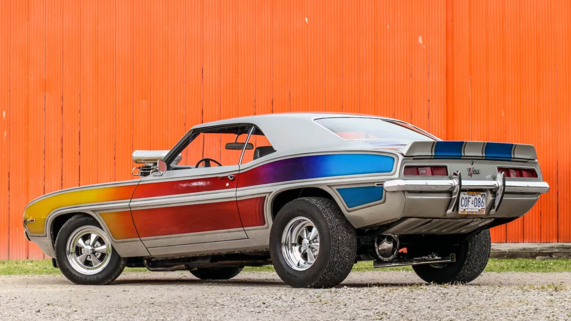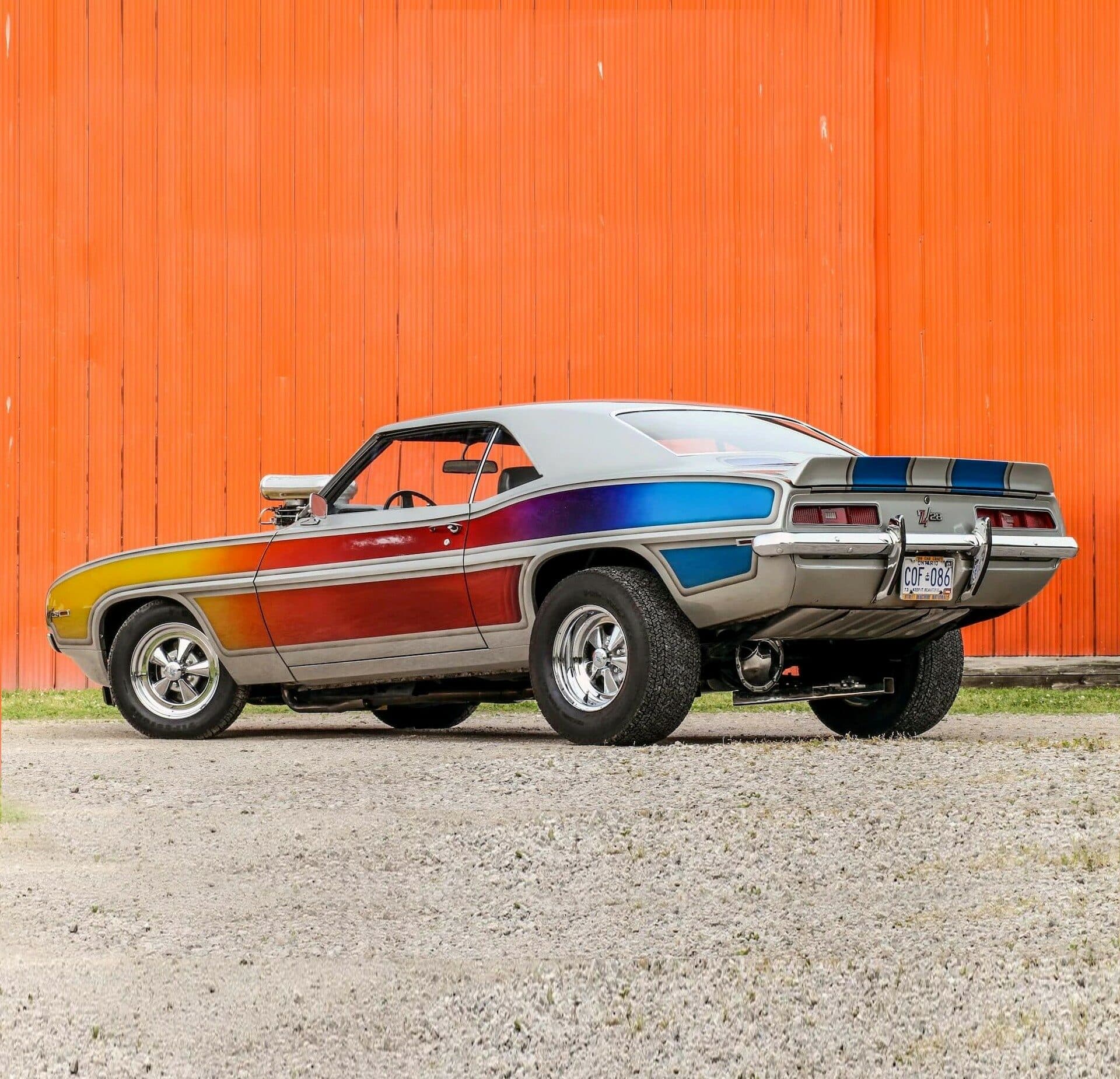 En fait, elle avait été customisée, avec des silencieux Cherry Bomb le cul surélevé incliné et les barres de traction, un 327 avec un compresseur Paxton et une boite quatre vitesses Muncie. Elle a participé aux NSRA Street Machine Nationals, à Des Moines, dans l’Iowa, en 1975 et en 1978 première repeinture y compris les graphismes, que la voiture porte encore aujourd’hui. Oui, une partie de la laque s’est fissurée et décolorée au fil des ans…