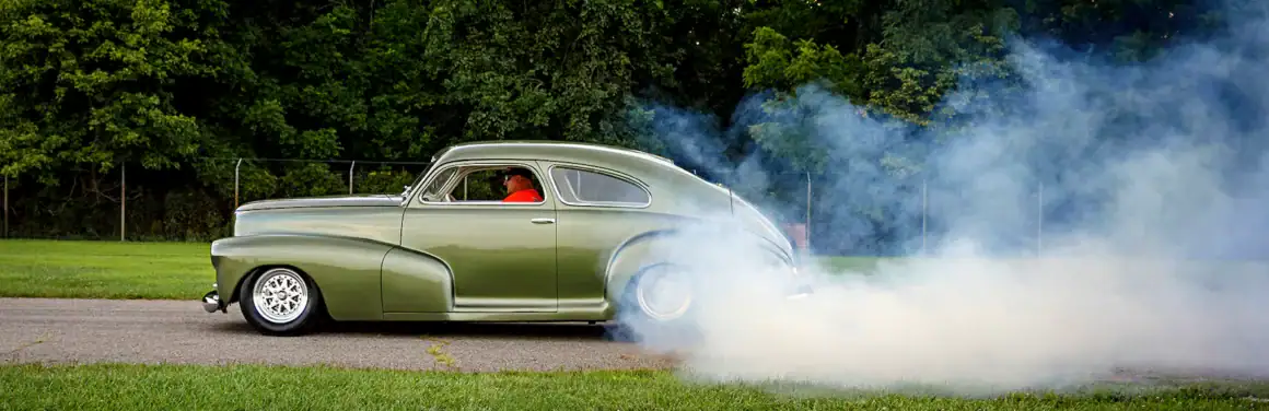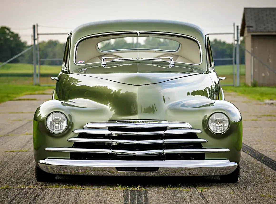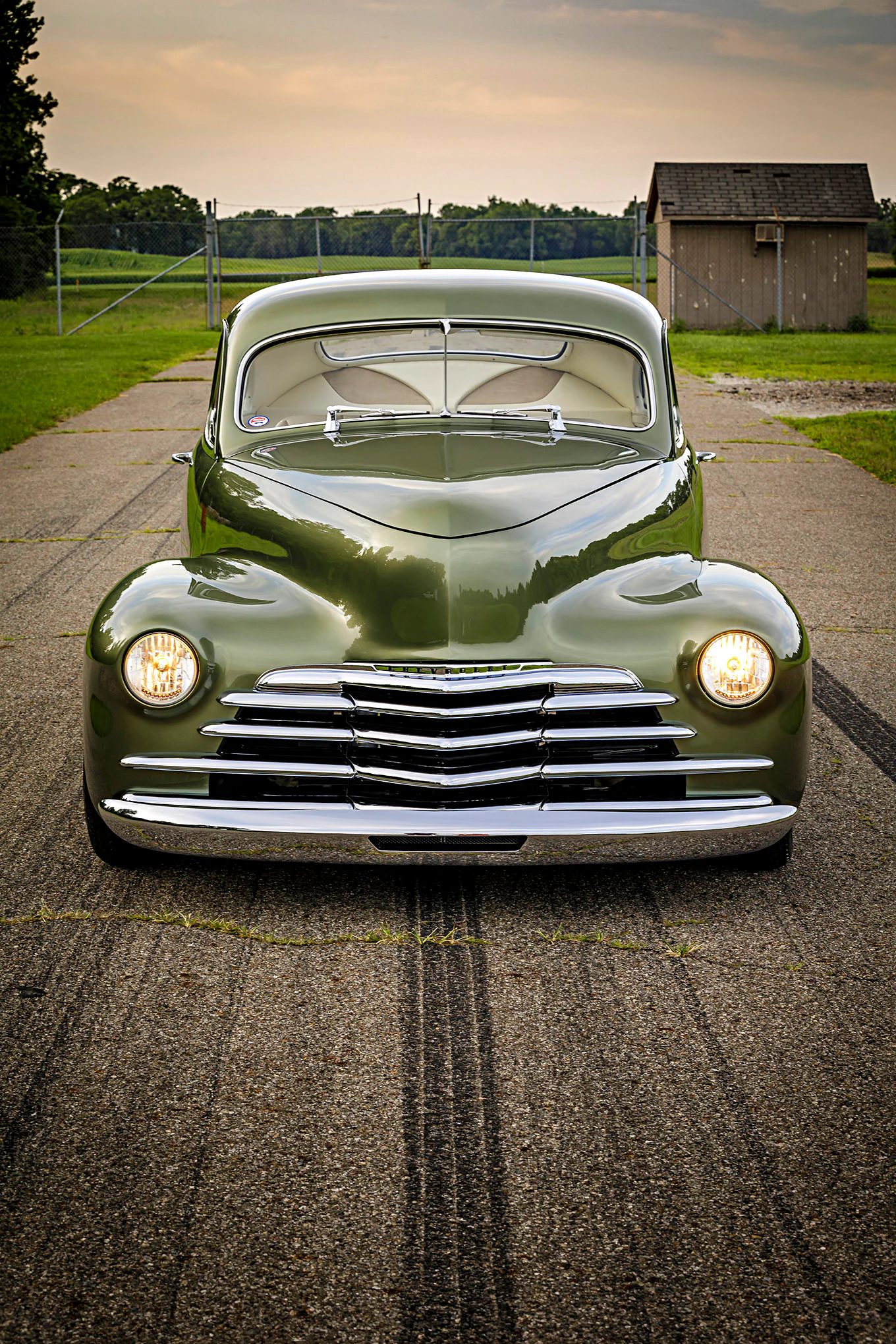 Je tiens à affirmer que ce fut un drame que l’Aerosedan sera abandonnée en 1949 avec l’introduction de la Fleetline de deuxième génération… Alors, la première fois que j’ai posé les yeux sur l’interprétation de George Pavell qui est cette grosse beauté verte, eh bien, je ne savais pas trop quoi penser. N’ayant jamais été un fan du look Pro Street sur 99 % des voitures portant ce traitement, je me suis gratté d’abord la tête, les couilles c’est pour d’autres occasions !