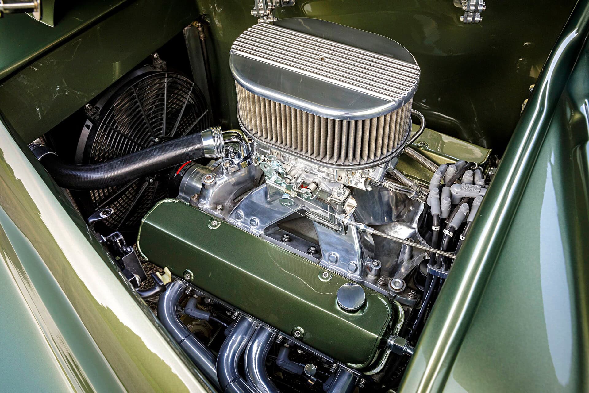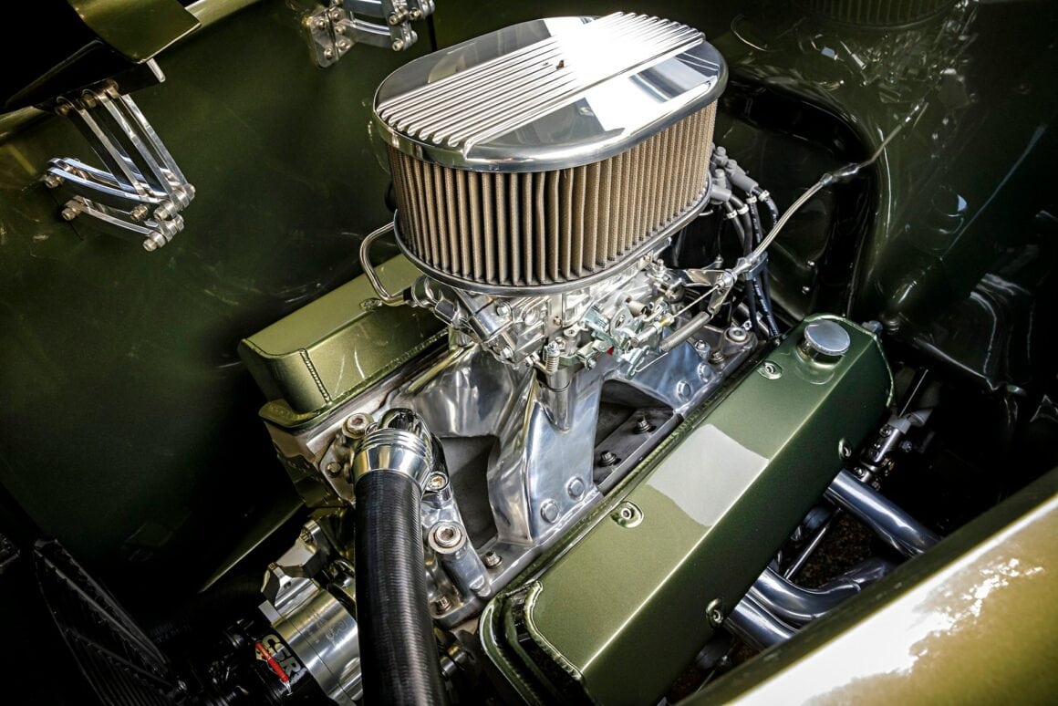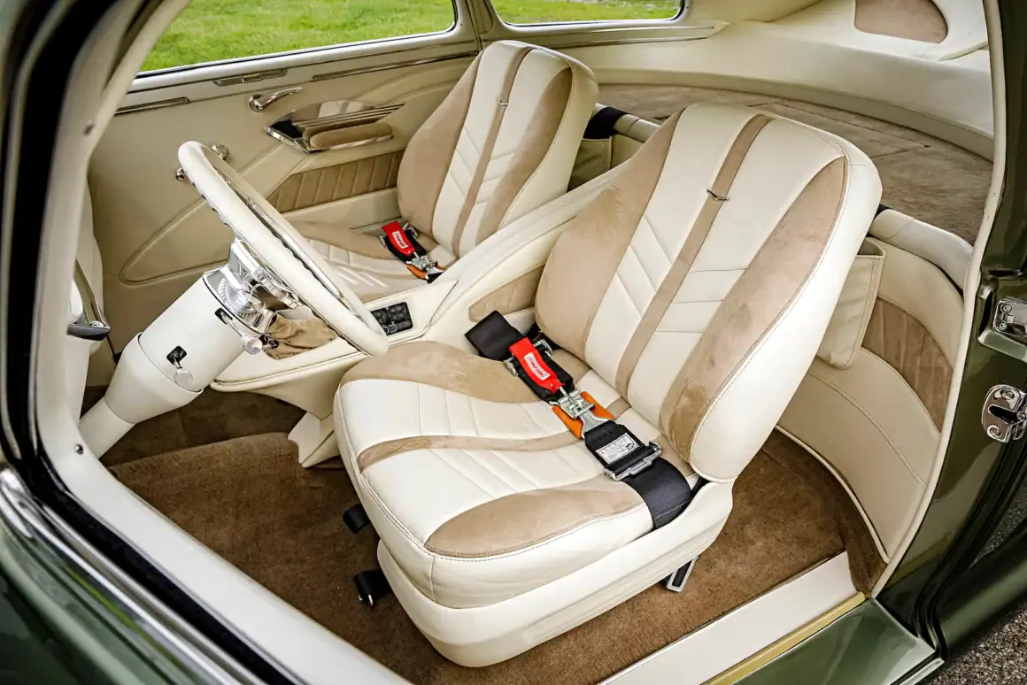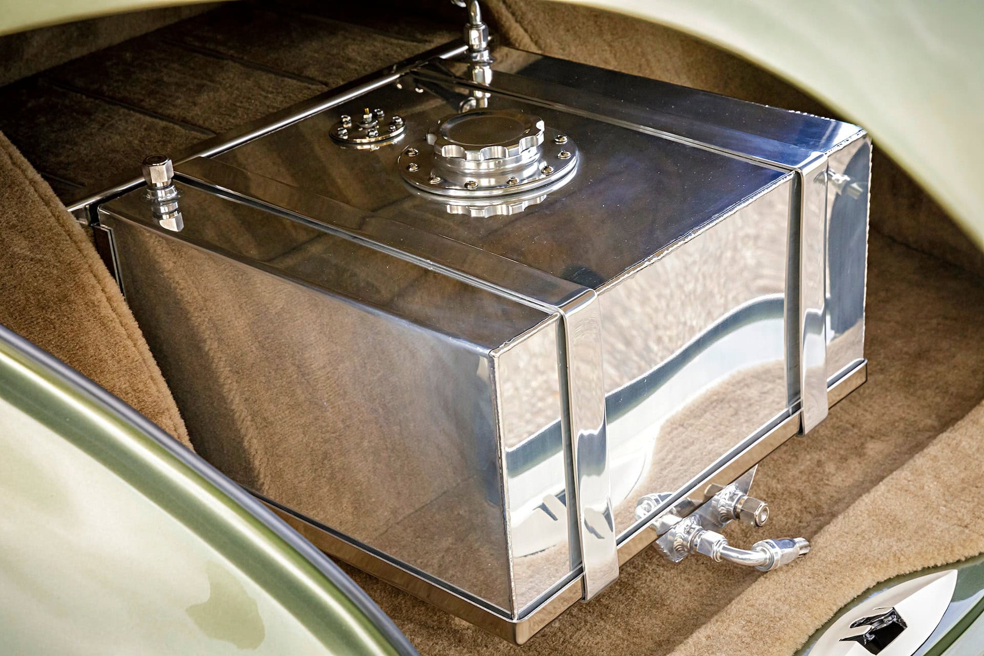 Et bien qu’il semble que seule une petite quantité de personnalisation ait été effectuée, en réalité il y a une longue, longue liste de modifications qui ont été effectuées de la proue à la poupe, notamment le capot, qui est maintenant facile à ouvrir à l’envers (sic !) avec des charnières latérales, ou la mise à niveau du tableau de bord entièrement lissé avec une lunette de pick-up Chevrolet 1957 et un seul tachymètre AutoMeter.