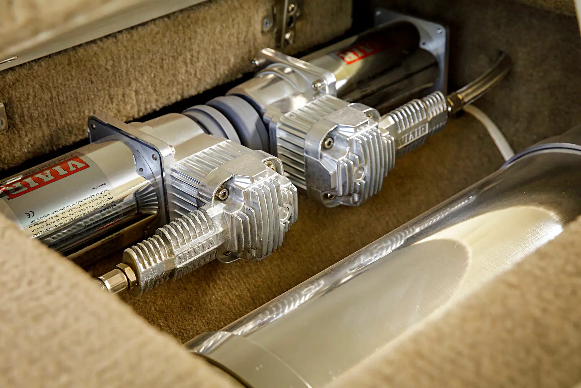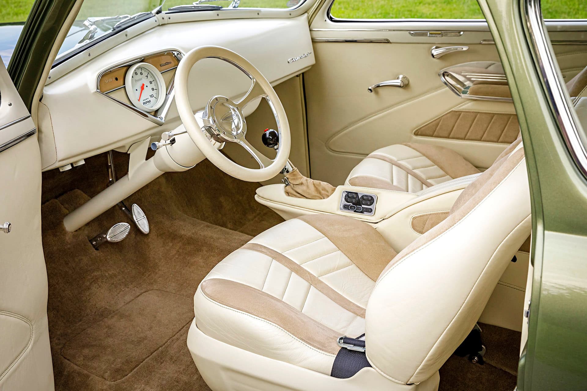 Lorsque j’ai remarqué les pneus 33×19,5 M/T rangés sous les ailes arrière de cette Fleetline, j’ai sursauté, cela expliquait son total manque d’aménagements pour les passagers arrière ! La couleur, cependant, une belle nuance de PPG Green Tea Metallic (par Eric Bee de l’Ohio) était plutôt complémentaire, surtout en rupture avec l’intérieur deux places susmentionné recouvert de cuir couleur os (par DJ’s Upholstery).