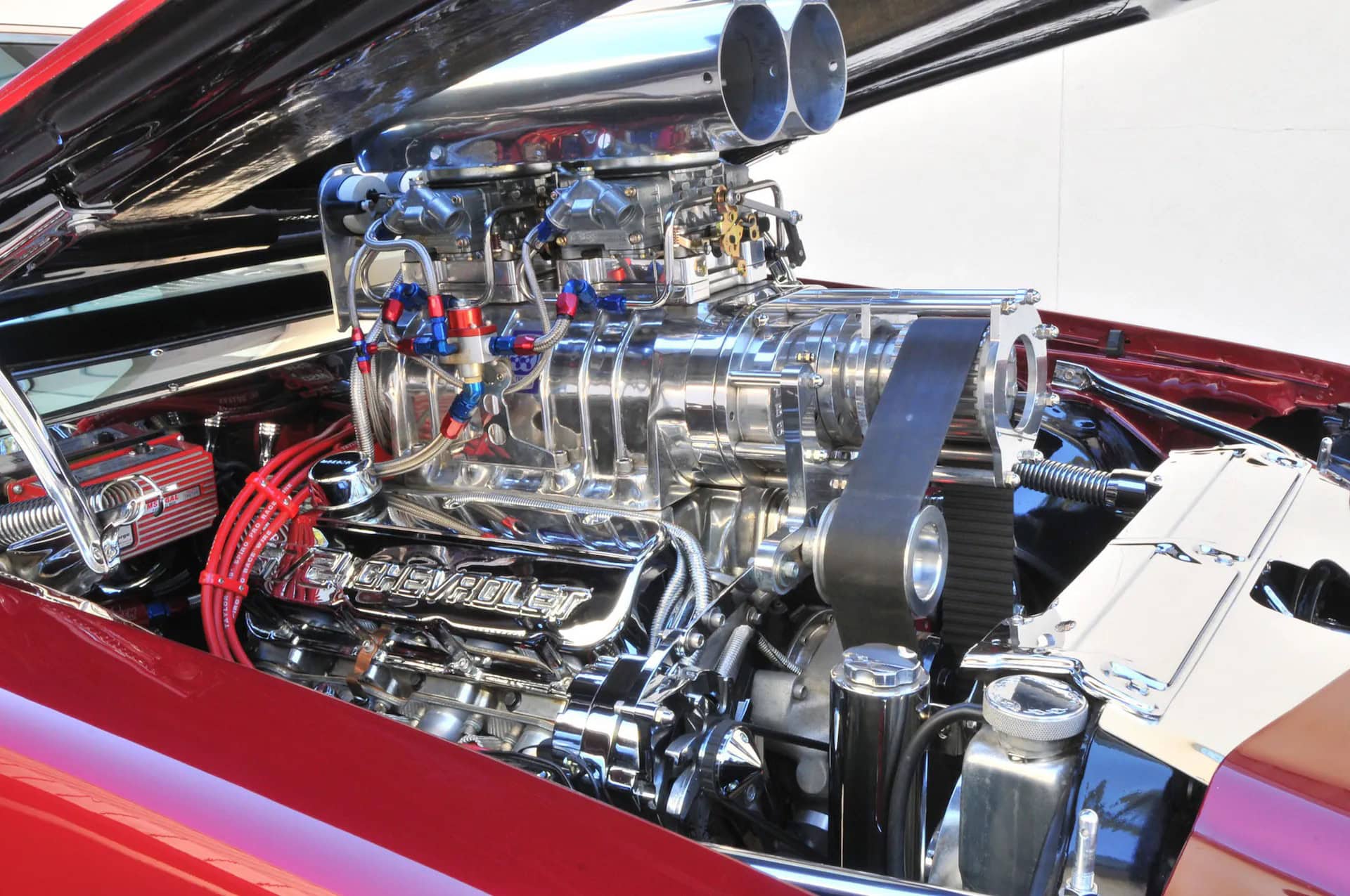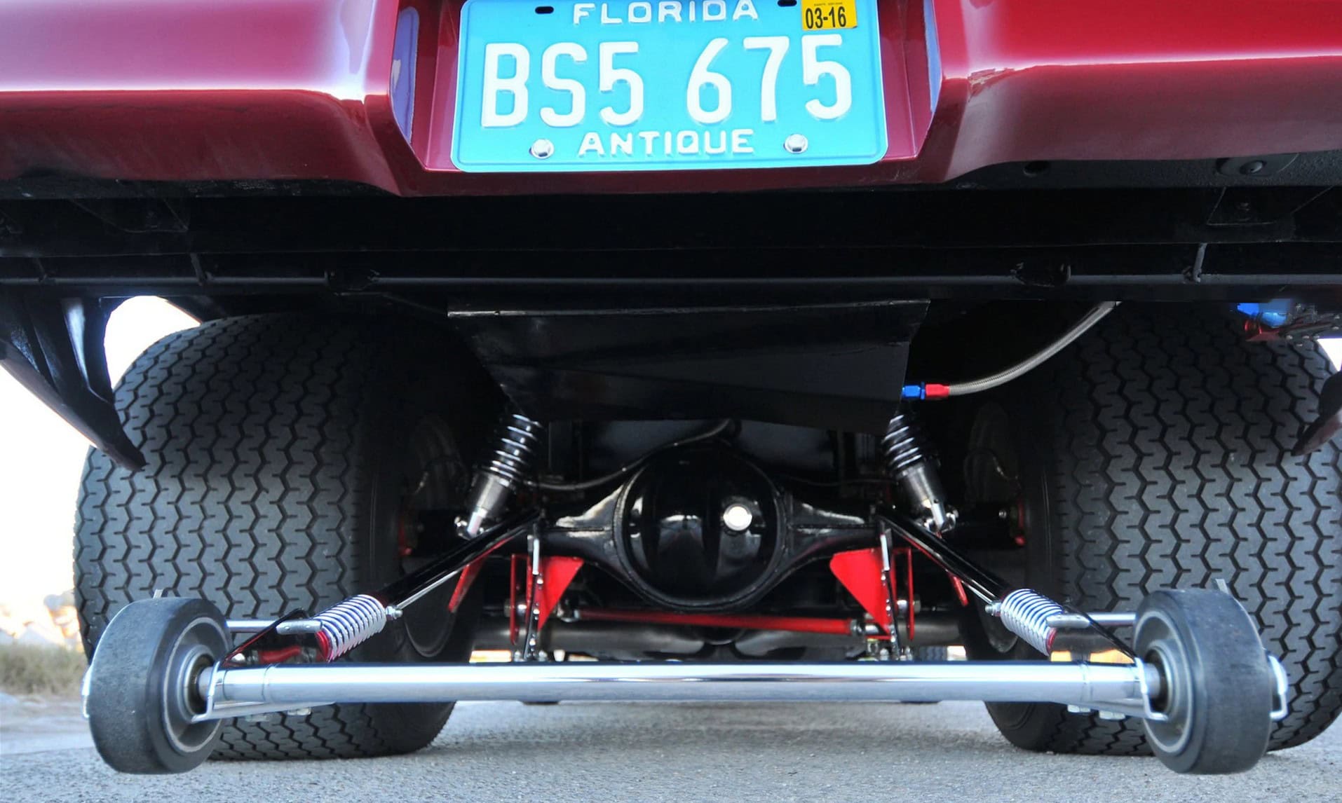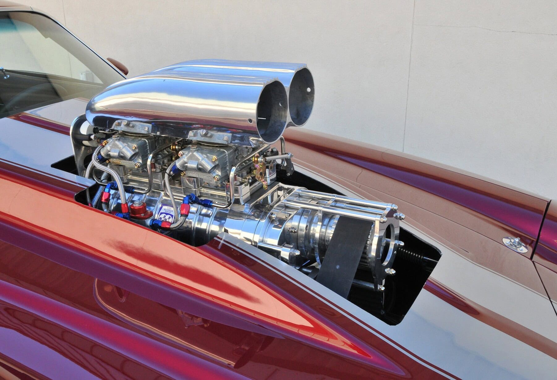 La grande gorgée d’air sous pression mélangée à un indice d’octane 112 Sunoco est fournie par un Blower BDS 8-71 poli et une paire de carburateurs Holley 850 filtrés par un purificateur d’air Shogun. L’allumage électronique MSD fournit des étincelles chronométrées avec précision grâce à des embases Hooker de 3 pouces, recouvertes de céramique, qui récupèrent les gaz résiduaires et les déversent dans une paire de Flowmaster Super 44. Cette brute envoie une puissance stupéfiante de 1000cv et 800 lb-pi de couple à la transmission Turbo 400 à soupapes inversées, équipée d’un convertisseur de couple Hughes 3800, d’un frein trans, d’un verrou de ligne et d’un levier de vitesses Hurst Pro… Big Al’s a fait le travail du moteur et Transmax à Ocala, en Floride, a mis à niveau la transmission. Ed a en finale tout mis en place lui-même. À l’intérieur, la voiture utilise un arceau de sécurité à cinq points de 2,5 pouces et des harnais Simpson à cinq points qui maintiennent le conducteur et le passager en toute sécurité dans les sièges JAZ Products.