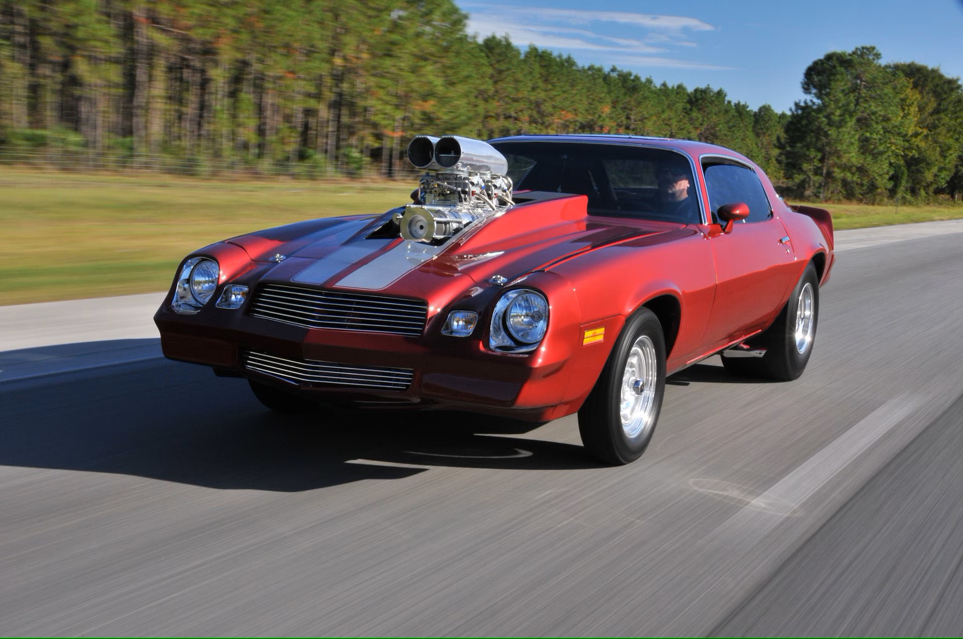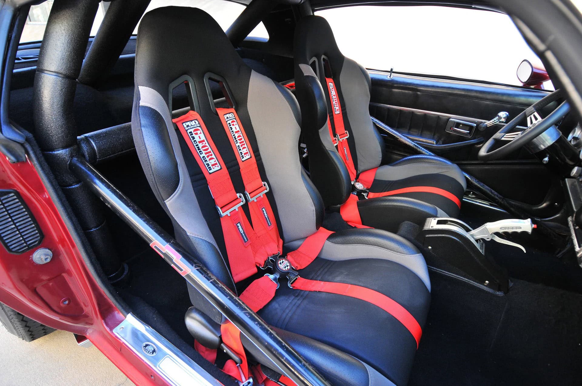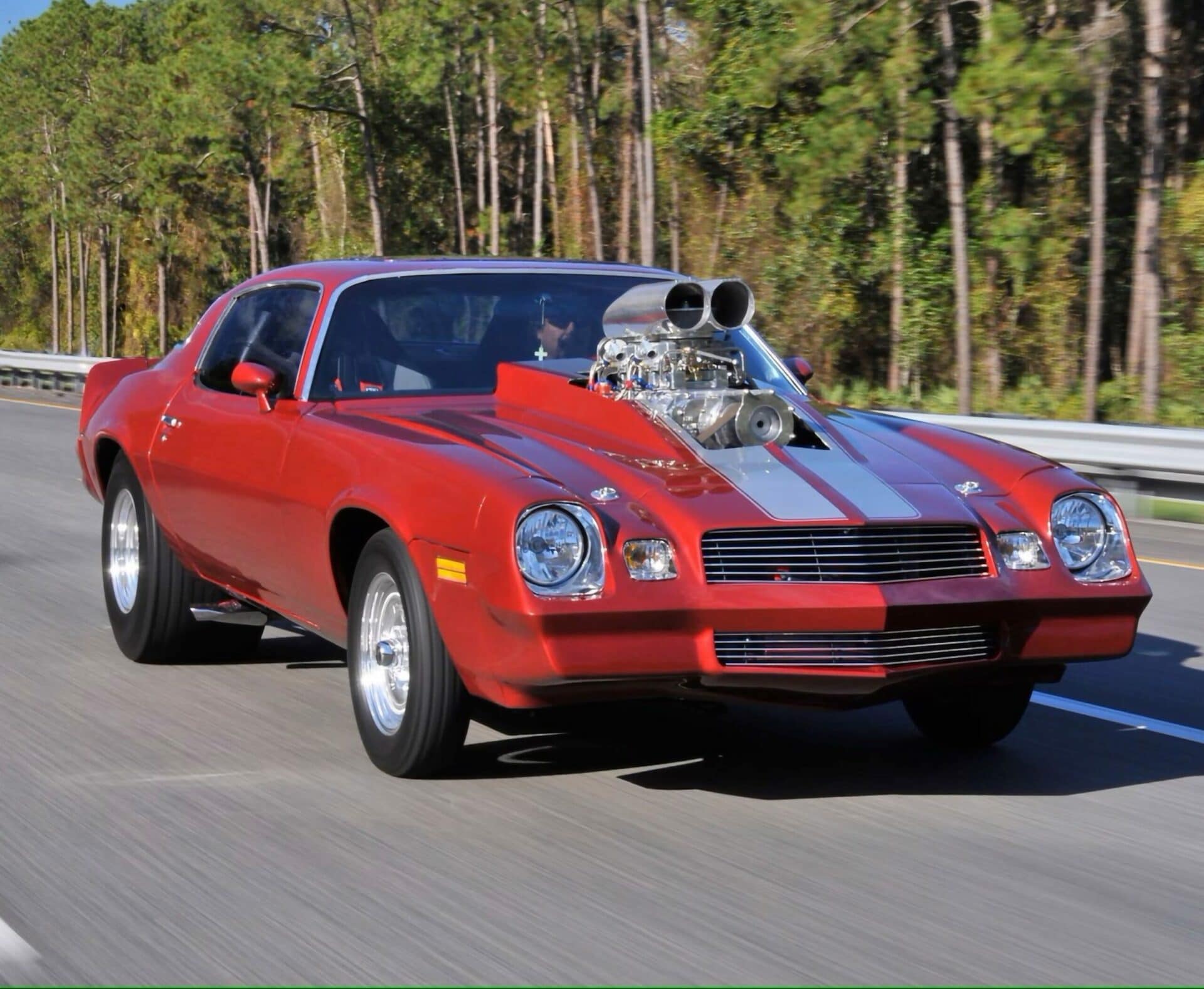 La grande gorgée d’air sous pression mélangée à un indice d’octane 112 Sunoco est fournie par un Blower BDS 8-71 poli et une paire de carburateurs Holley 850 filtrés par un purificateur d’air Shogun. L’allumage électronique MSD fournit des étincelles chronométrées avec précision grâce à des embases Hooker de 3 pouces, recouvertes de céramique, qui récupèrent les gaz résiduaires et les déversent dans une paire de Flowmaster Super 44. Cette brute envoie une puissance stupéfiante de 1000cv et 800 lb-pi de couple à la transmission Turbo 400 à soupapes inversées, équipée d’un convertisseur de couple Hughes 3800, d’un frein trans, d’un verrou de ligne et d’un levier de vitesses Hurst Pro… Big Al’s a fait le travail du moteur et Transmax à Ocala, en Floride, a mis à niveau la transmission. Ed a en finale tout mis en place lui-même. À l’intérieur, la voiture utilise un arceau de sécurité à cinq points de 2,5 pouces et des harnais Simpson à cinq points qui maintiennent le conducteur et le passager en toute sécurité dans les sièges JAZ Products.