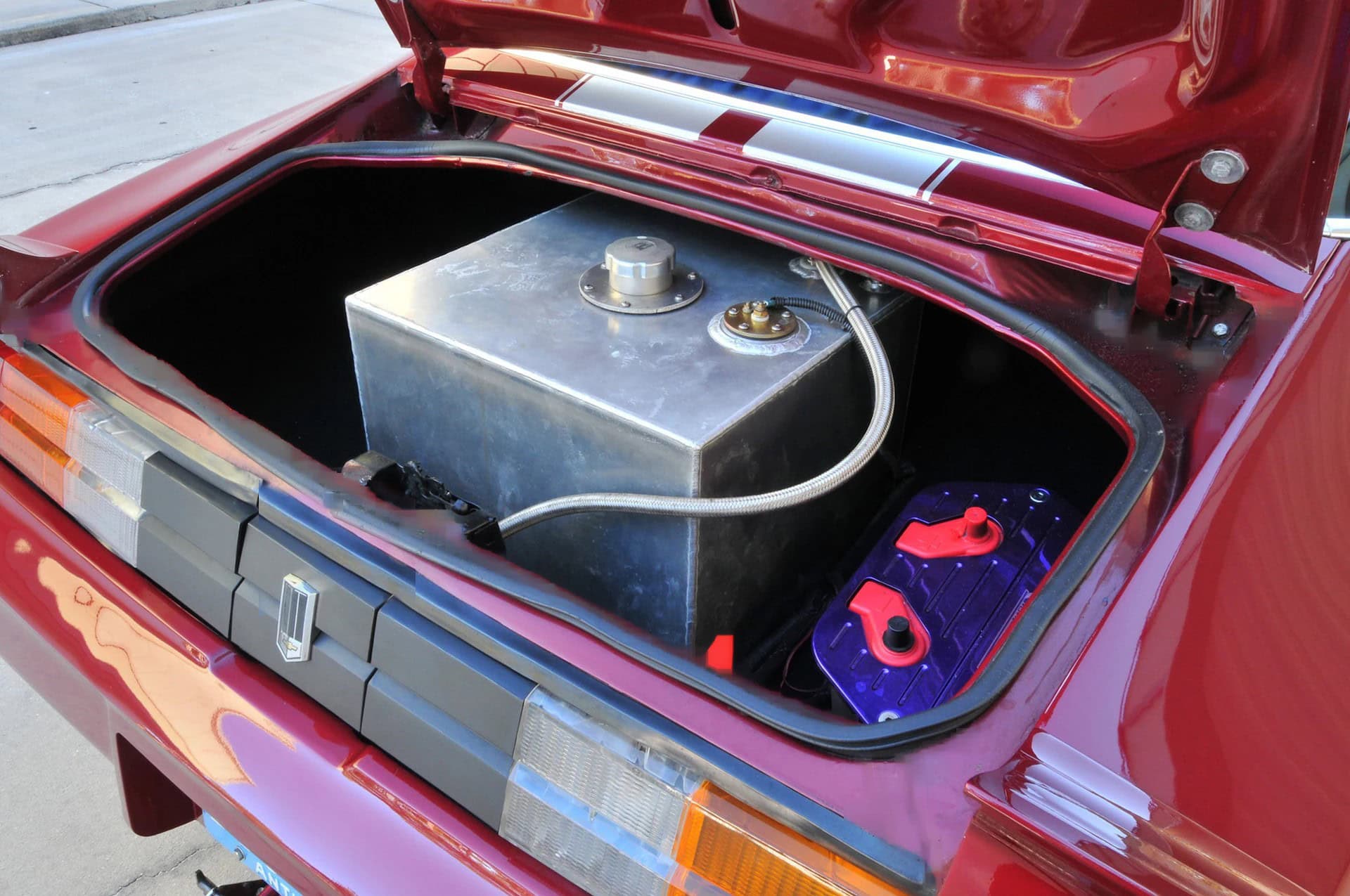 Une colonne ididit et un volant Lecarra permettent au conducteur de rester en contact étroit. Une unité principale stéréo Alpine avec un amplificateur de 1000 watts et quatre haut-parleurs Memphis offrent un divertissement lorsque le puissant Merlin est silencieux. Dans le coffre, la pile à combustible de 21 gallons partage l’espace avec une batterie Optima Red-Top. L’atelier de tapisserie “Big “O” qui s’occupe d’ameublement à Ocala, en Floride, a fait le travail de couture à l’intérieur et Ed s’est occupé des touches finales, lissant la carrosserie, ajoutant une calandre en billette personnalisée de chez “Classic Industries” ainsi qu’un capot à induction en fibre de verre Harwood… Chris Shuhart d’Ocala a pulvérisé la peinture Brandywine. Ed nous a dit que tout au long de la construction, son objectif était de créer un look d’usine, plutôt que quelque chose qui a été simplement assemblé. Comment la voiture maintenant finie est-elle à vivre ? Ed ne l’a fait courir sur un strip qu’une seule fois, tournant dans les 9 secondes.