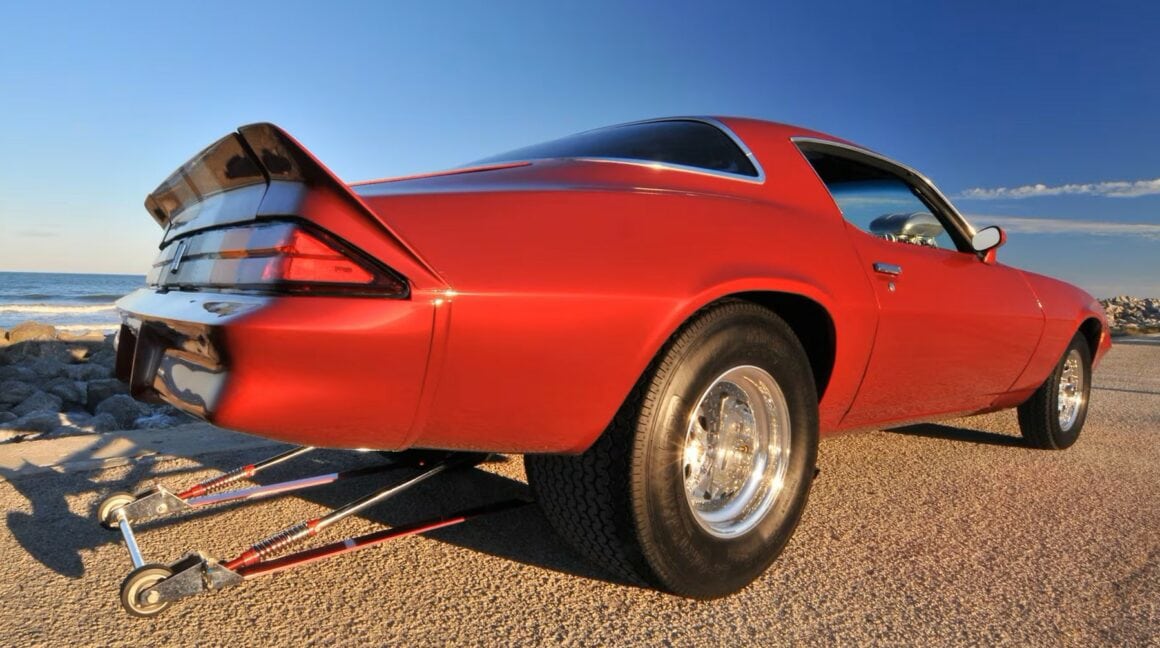 Ed a commencé le projet en évaluant qu’il lui prendrait huit ans en fabriquant son propre châssis, en utilisant une combinaison de tubes d’acier rectangulaires de 2 x 3 pouces soudés à la tôle de la Camaro et augmentés de composants de suspension de chez son ami qui possède le garage “Chassis Engineering”. Les mises à niveau ont commencé avec des bras triangulaires tubulaires à l’avant et un 4 bras à l’arrière tenant un pont avec différentiel Ford de 9 pouces avec un rapport de 3,73 et un essieu Strange à 35 cannelures. Les freins à disques à assistance électrique et étriers double Wilwood s’associent à des ressorts hélicoïdaux réglables QA1 pour aux quatre roues. La Camaro est devenue sérieuse grâce aux jantes Centerline Warrior de 15 x 6 pouces à l’avant et 15 x 10 pouces à l’arrière… Ed a choisi les pneus avec soin, voulant remplir les passages de roue sans avoir l’air caricatural. Il a opté pour les caoutchouc’s Mickey Thompson en 15×6 pouces Sportsman Pro à l’avant et lee plus gros Mickey Thompson Sportsman Pro 29×18,5 pouces à l’arrière.
