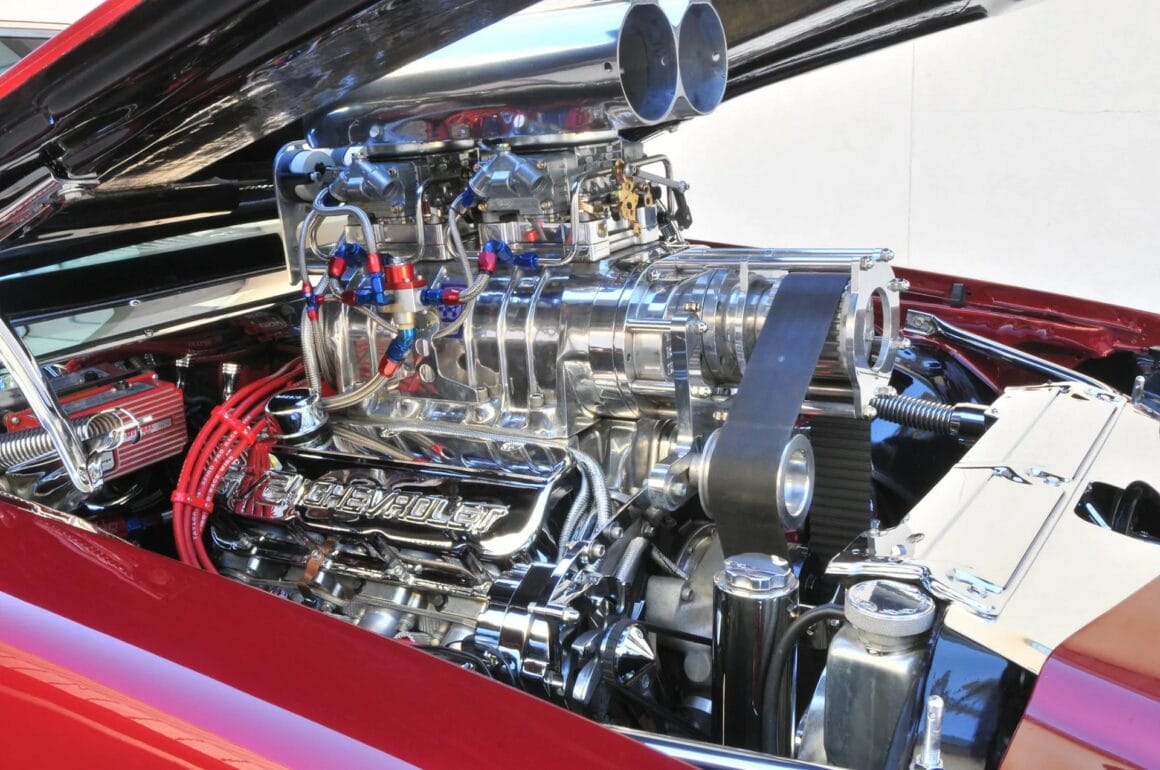 Un ensemble de Wheelie-bar’s a aidé à planter la puissance sans retournement. Tous ces lours et couteux changements (lourds en coûts d’achat) étaient nécessaires puisque la voiture devait recevoir un V8 572ci suralimenté dun Blower, un moteur capable de tordre une monocoque standard en tire-bouchon. Les modifications de tôlerie ont été peu nombreuses, Ed remplaçant la cloison pare-feu d’origine par un panneau en aluminium et en le déplaçant vers l’arrière de même que les supports moteur pour faire place au radiateur plus épais. Une fois le châssis et la suspension terminés, le moteur pouvait arriver… Ed a donné à Al Lombardo de “Big Al’s Toy Shop” à Gaylordsville, dans le Connecticut, une liste de ses besoins. Leur bloc V8 Merlin 572ci a été équipé d’un villebrequin “Callies Performance Products”, de tiges en H et de pistons Ross fonctionnant avec une compression de 10,5:1 et utilisant une came à rouleaux COMP pour activer les soupapes dans les culasses en aluminium Brotherix.
