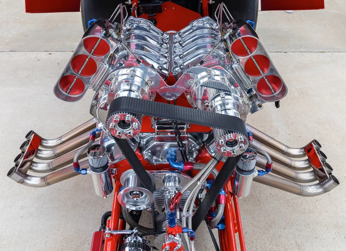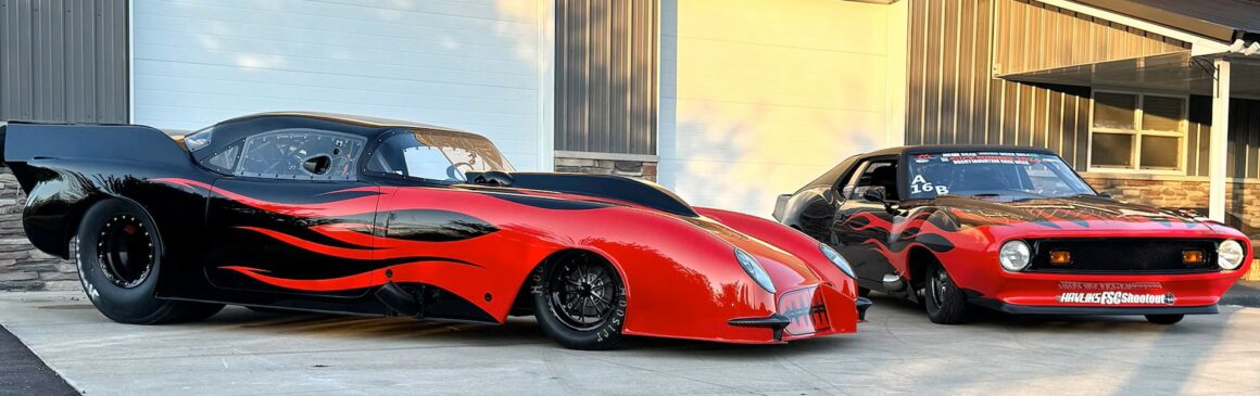 Plusieurs projets tout aussi fous et méchants ont suivi, y compris un pick-up Chevy C10 de 1965 doté d’un compresseur centrifuge alimentant un autre compresseur Roots… Et il y a eu aussi la Mustang de 1965 de sa femme propulsée par un moteur LSX 427ci et boosté par un compresseur 8-71 ainsi qu’une paire de Blower’s 144. Bradley avait deux autres projets Pro Street en préparation lorsqu’il a entamé une conversation avec son ami Jason Pipher : “Je pensais qu’il n’y avait pas grand-chose que l’on puisse faire de nos jours qui n’ait pas été fait alors que je voulais aller vers le super Funny Car”, m’explique Bradley, qui s’est également quelque peu inspiré du film “Fast Company” de 1979.