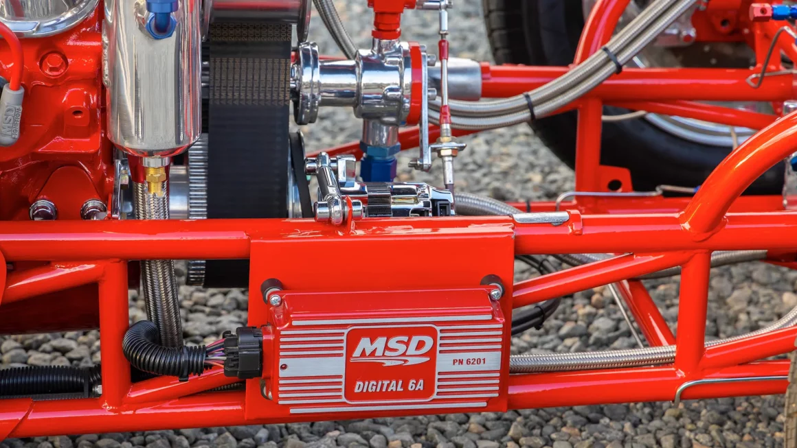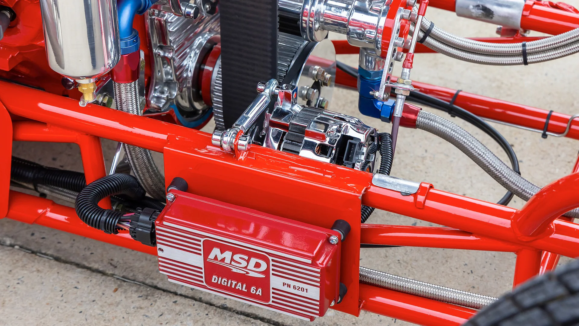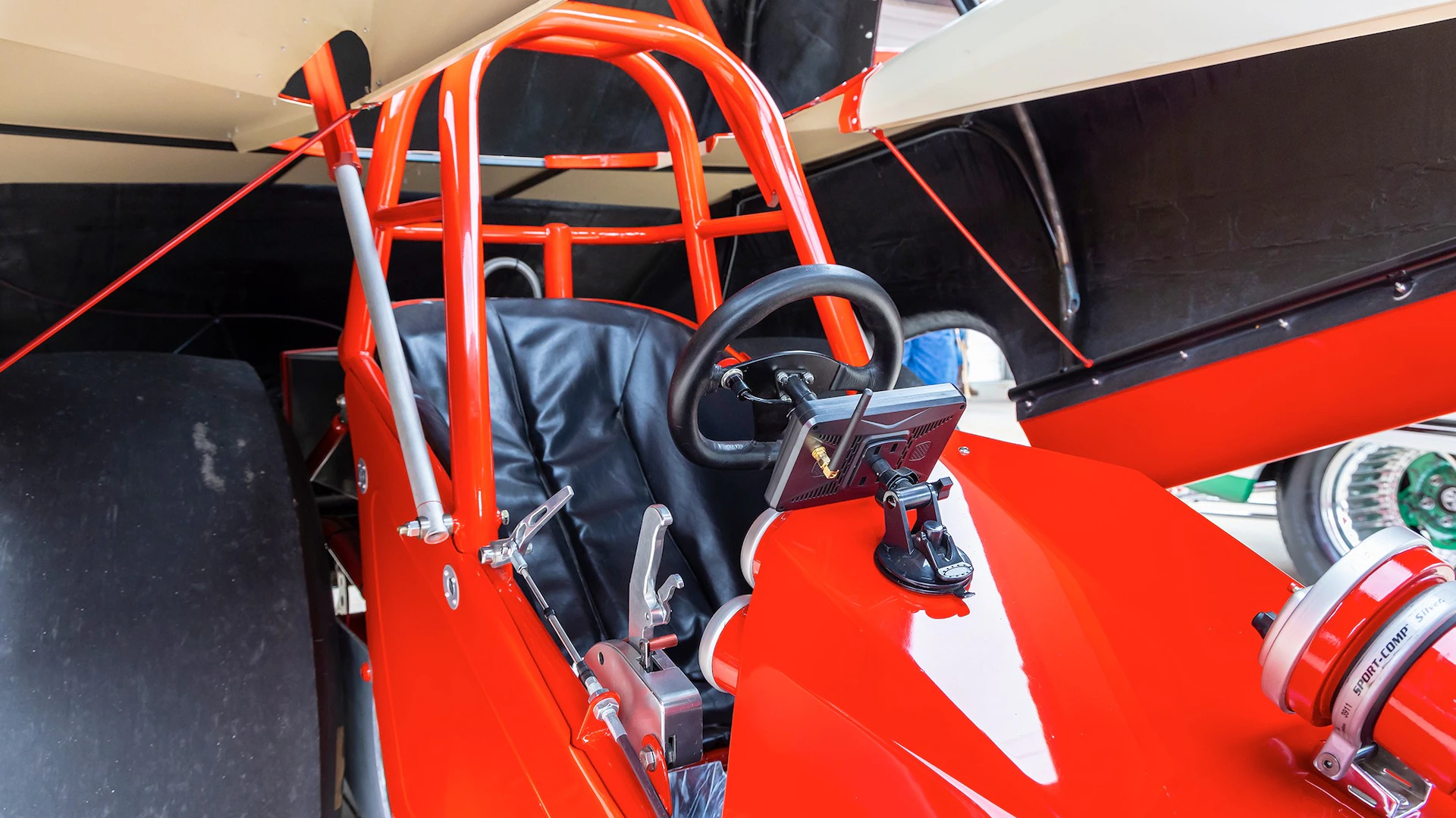 Il m’a ensuite indiqué : “J’avais besoin du pneu le plus haut possible pour réduire le rapport de vitesse”... Bradley m’a fait noter que Wilson Racing Chassis a joué un rôle déterminant dans sa construction et a été impliqué dans l’ensemble du processus. Mais il s’est empressé de me resouligner qu’il y avait beaucoup de pièces réutilisées, y compris les jantes Weld et les en-têtes zoomie en acier inoxydable d’origine. La carrosserie est 6 pouces plus étroite que celle d’origine et, bien qu’elle soit en fibre de verre, c’est quand-même assez lourd en raison des renforts supplémentaires. C’était devenu un travail de quatre hommes pour l’enfiler et l’enlever. Pour remédier à cela, Gray a installé des actionneurs électriques pour soulever la carrosserie de haut en bas et de bas en haut.