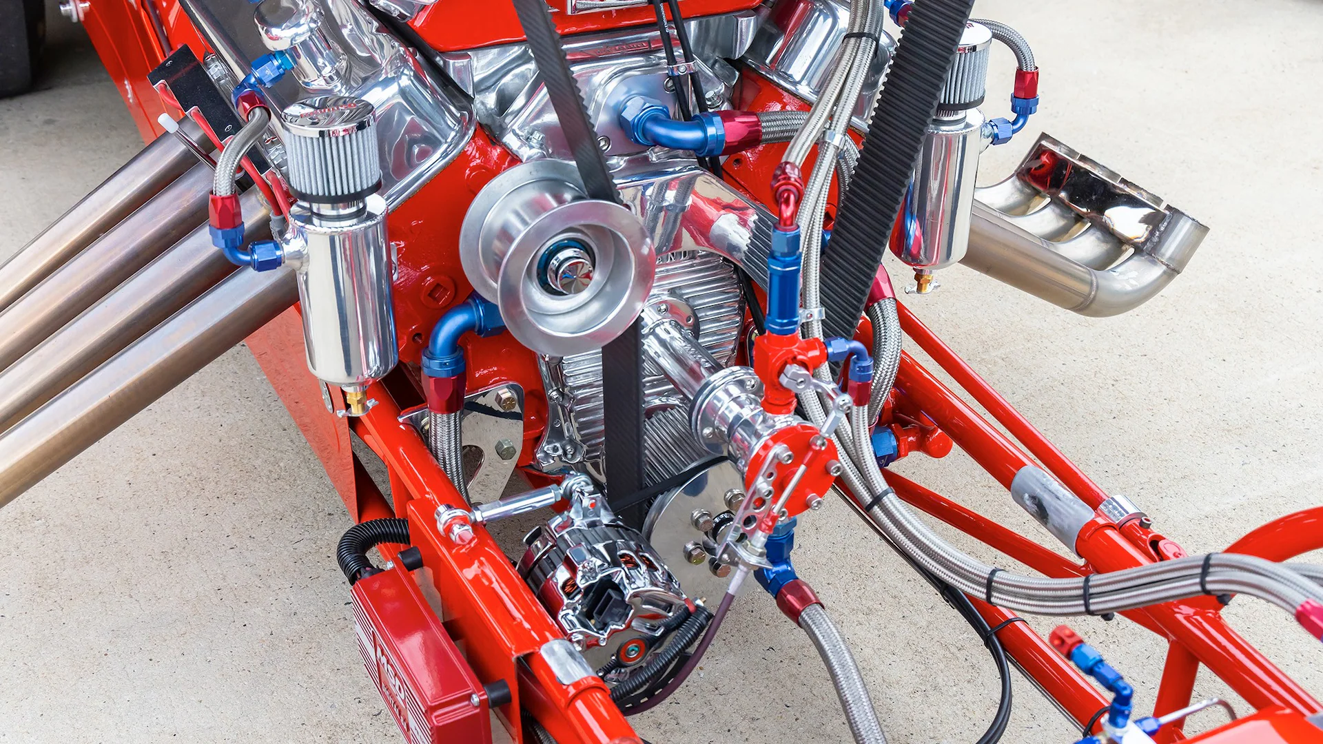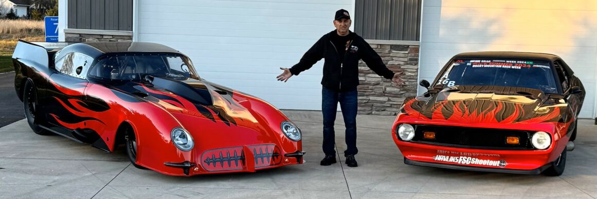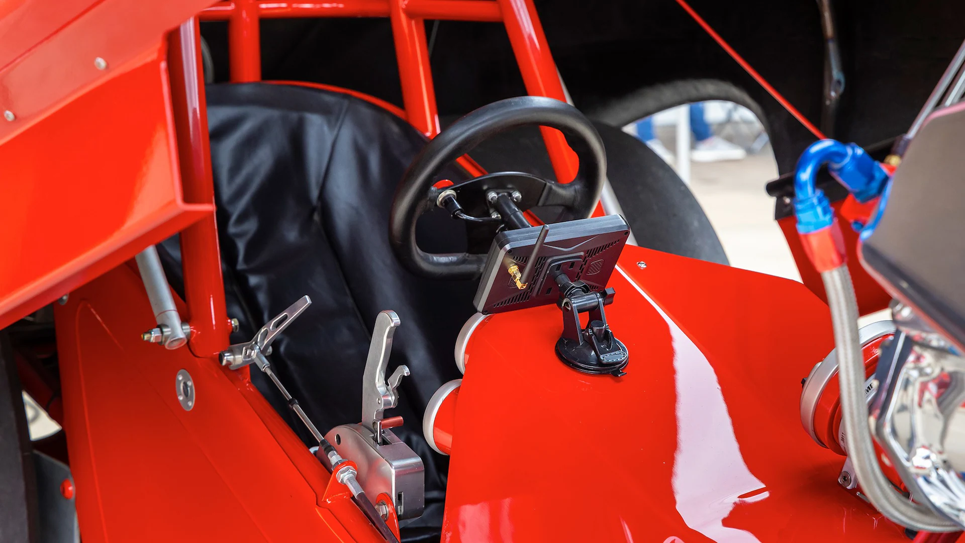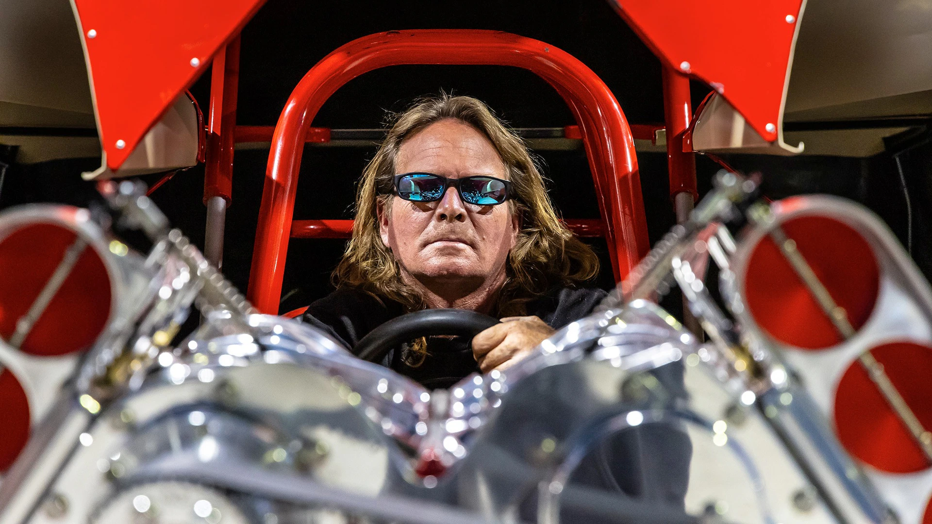 Il m’a ensuite indiqué : “J’avais besoin du pneu le plus haut possible pour réduire le rapport de vitesse”... Bradley m’a fait noter que Wilson Racing Chassis a joué un rôle déterminant dans sa construction et a été impliqué dans l’ensemble du processus. Mais il s’est empressé de me resouligner qu’il y avait beaucoup de pièces réutilisées, y compris les jantes Weld et les en-têtes zoomie en acier inoxydable d’origine. La carrosserie est 6 pouces plus étroite que celle d’origine et, bien qu’elle soit en fibre de verre, c’est quand-même assez lourd en raison des renforts supplémentaires. C’était devenu un travail de quatre hommes pour l’enfiler et l’enlever. Pour remédier à cela, Gray a installé des actionneurs électriques pour soulever la carrosserie de haut en bas et de bas en haut.