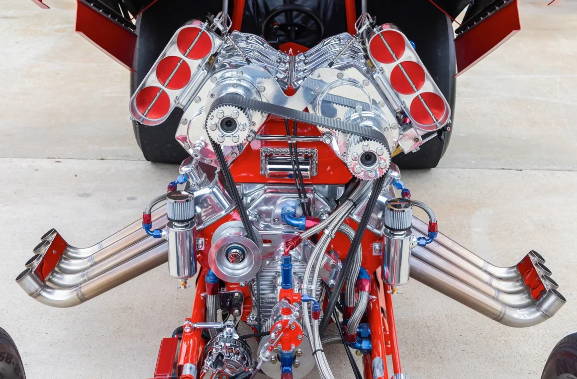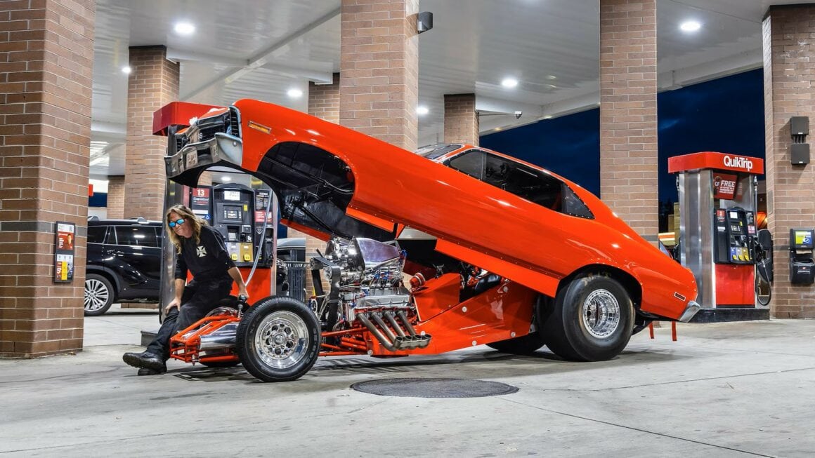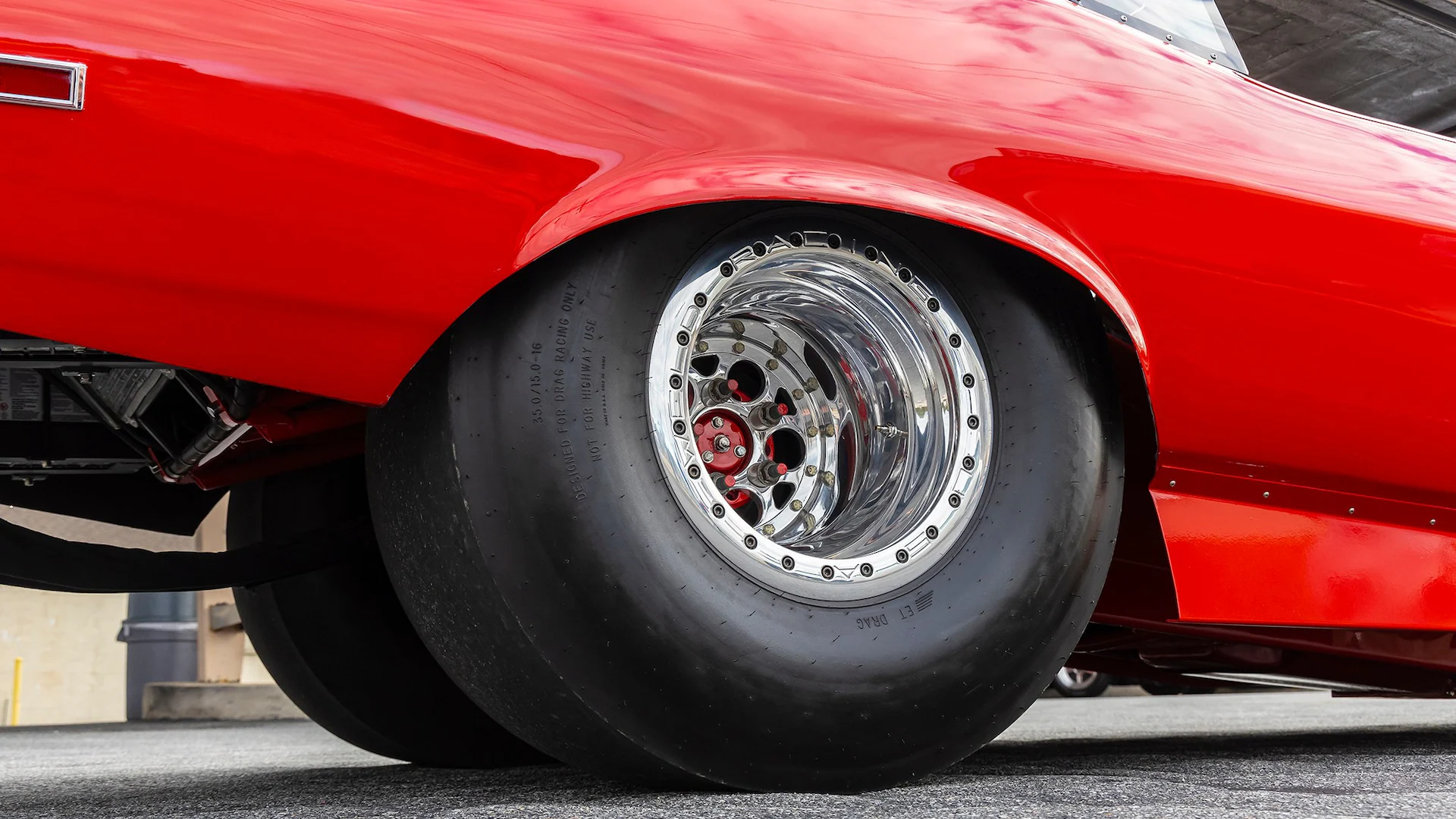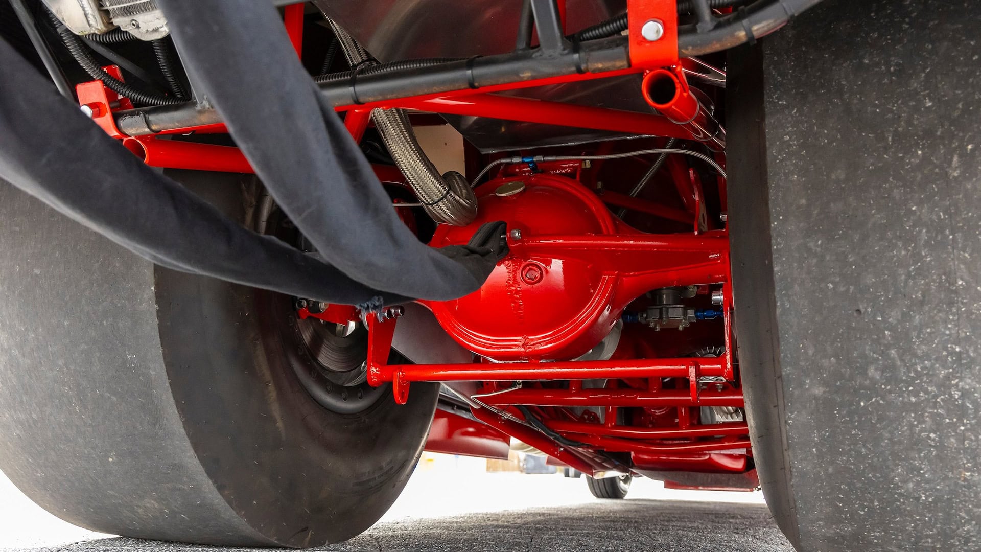 “À l’origine, il n’avait pas de verre de montant A ou C. Un jour, j’ai remarqué qu’il se fissurait au niveau du pilier C. La voiture était déjà peinte, nous avons donc dû revenir en arrière et ajouter de la structure pour la trianguler pour le support et ajouter les fenêtres en Lexan. Il ne s’est pas fissuré à nouveau. Pour cela, je gonfle à 11,5 psi dans les pneus arrière. Il y a juste un léger rebond sur l’autoroute”, m’a dit ensuite Gray à propos des pneus arrière Mickey Thompson Big Bubba 35x15x16. “J’avais besoin des pneus les plus haut possible pour réduire le rapport de vitesse. À l’avant se trouve une paire de pneus radiaux de 165 mm adaptés à la route plutôt que les coupe-pizza d’origine que l’on attendrait d’une Funny Car… Les Frenchies qui te lisent vont adorer ton reportage, Patrice”…