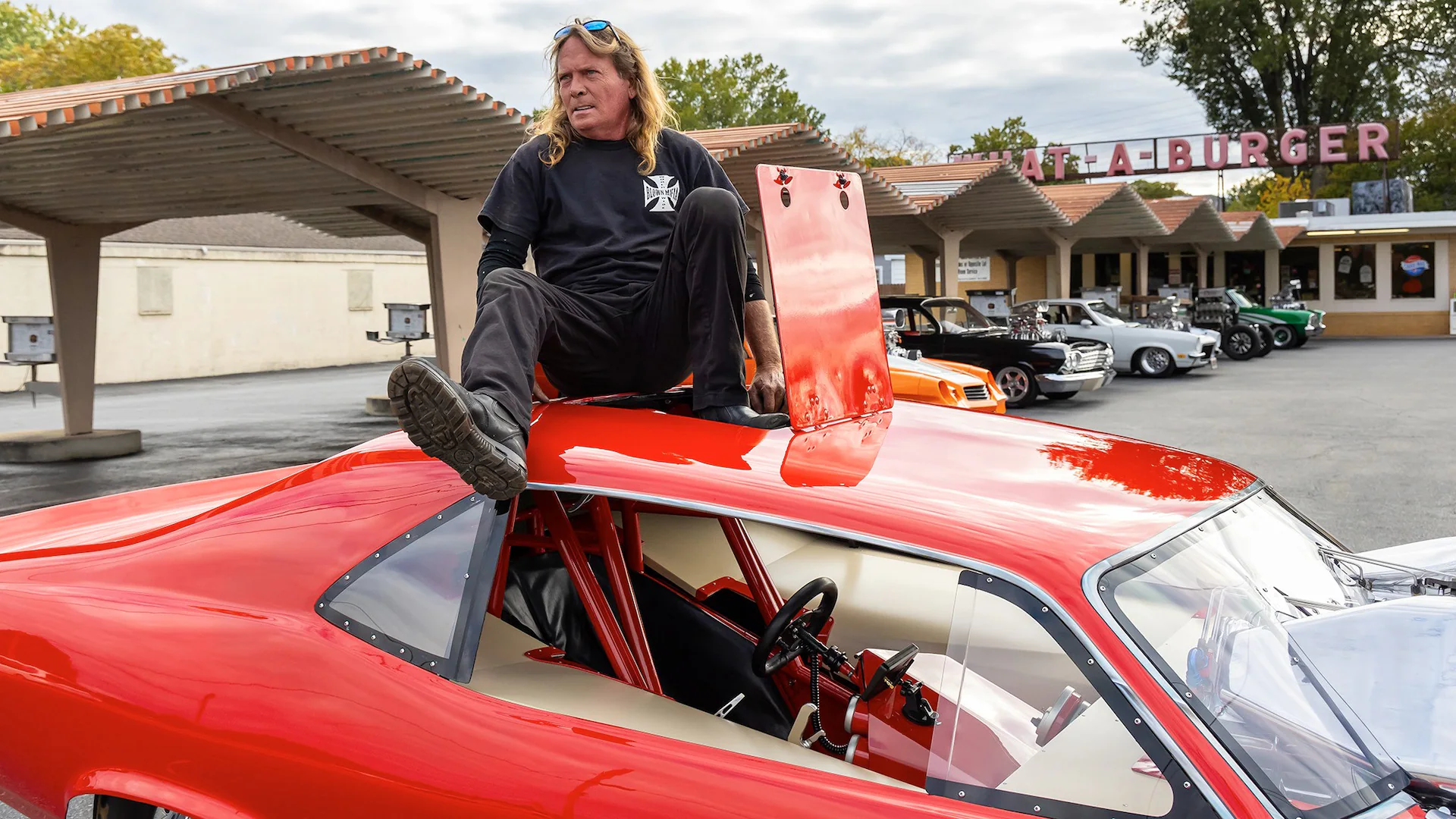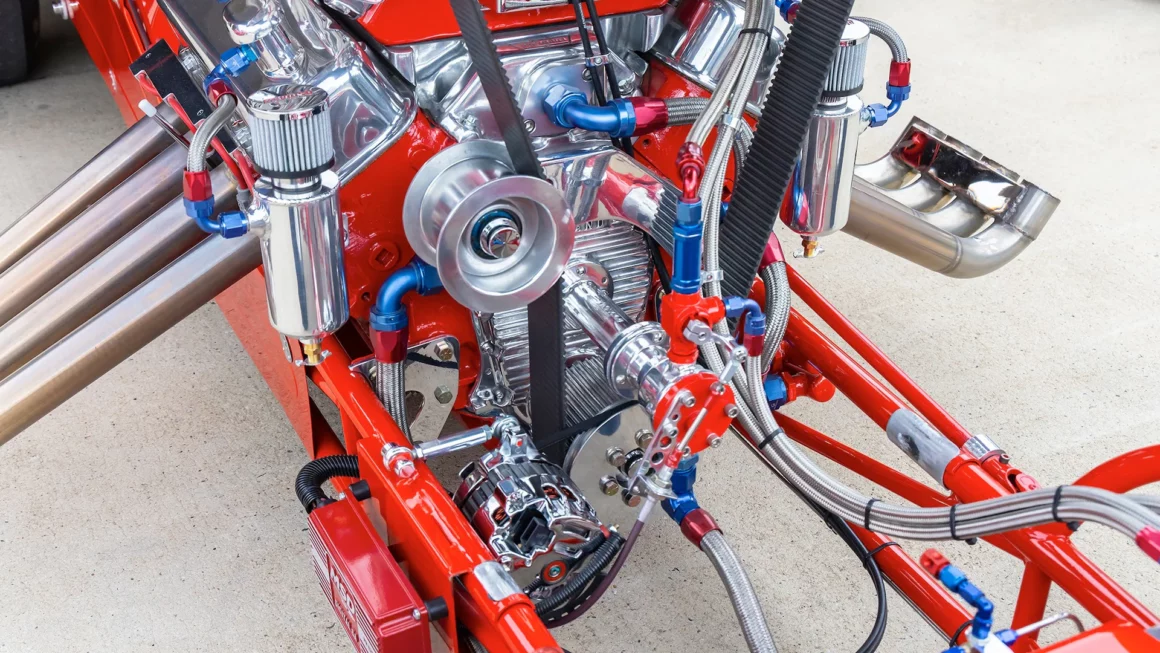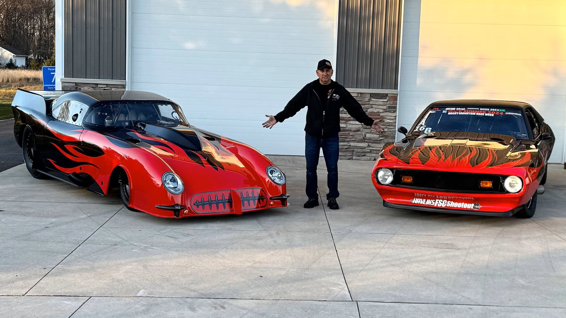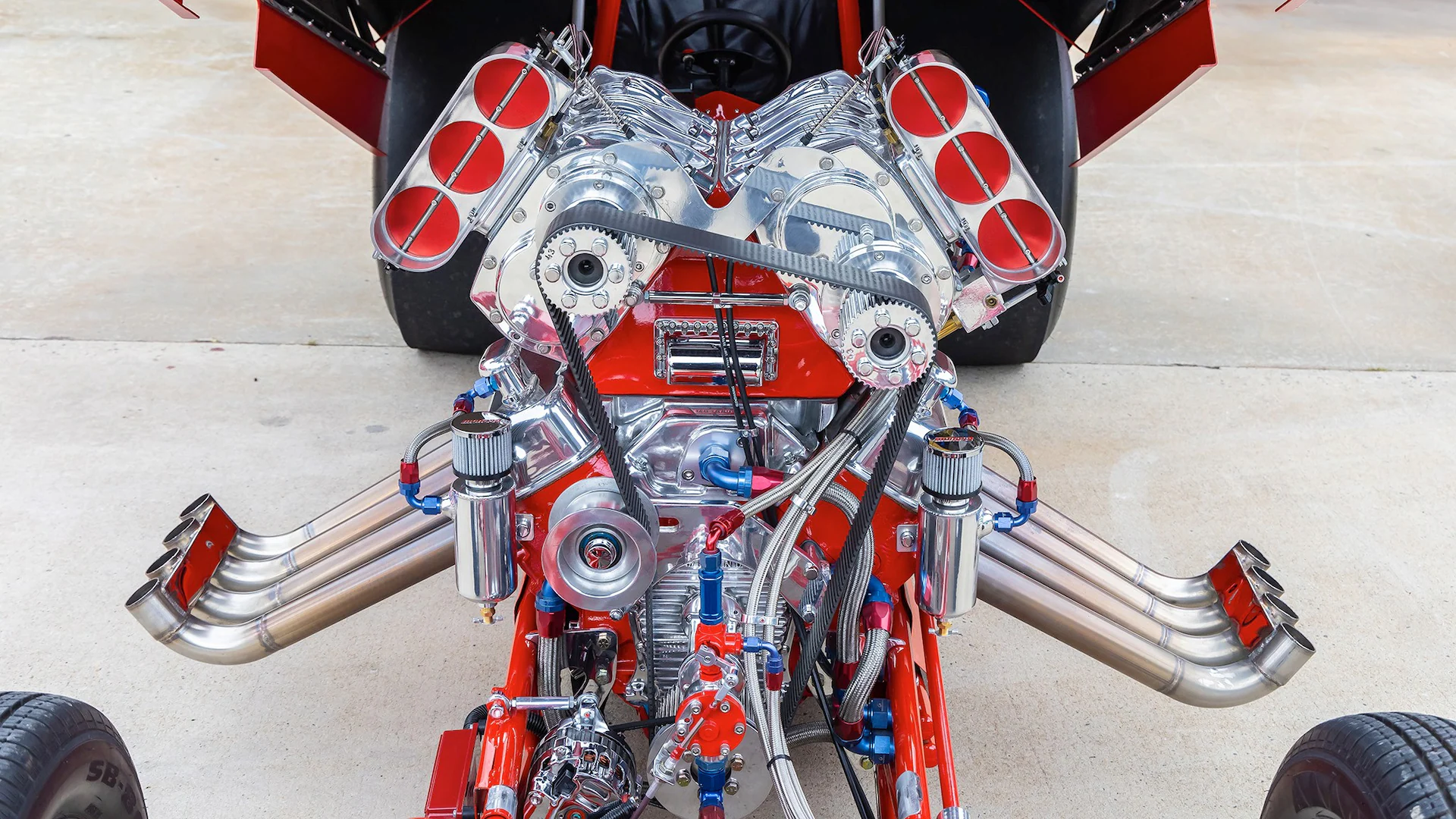 “À l’origine, il n’avait pas de verre de montant A ou C. Un jour, j’ai remarqué qu’il se fissurait au niveau du pilier C. La voiture était déjà peinte, nous avons donc dû revenir en arrière et ajouter de la structure pour la trianguler pour le support et ajouter les fenêtres en Lexan. Il ne s’est pas fissuré à nouveau. Pour cela, je gonfle à 11,5 psi dans les pneus arrière. Il y a juste un léger rebond sur l’autoroute”, m’a dit ensuite Gray à propos des pneus arrière Mickey Thompson Big Bubba 35x15x16. “J’avais besoin des pneus les plus haut possible pour réduire le rapport de vitesse. À l’avant se trouve une paire de pneus radiaux de 165 mm adaptés à la route plutôt que les coupe-pizza d’origine que l’on attendrait d’une Funny Car… Les Frenchies qui te lisent vont adorer ton reportage, Patrice”…