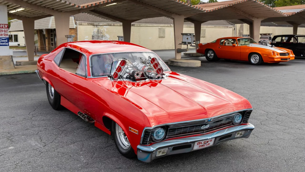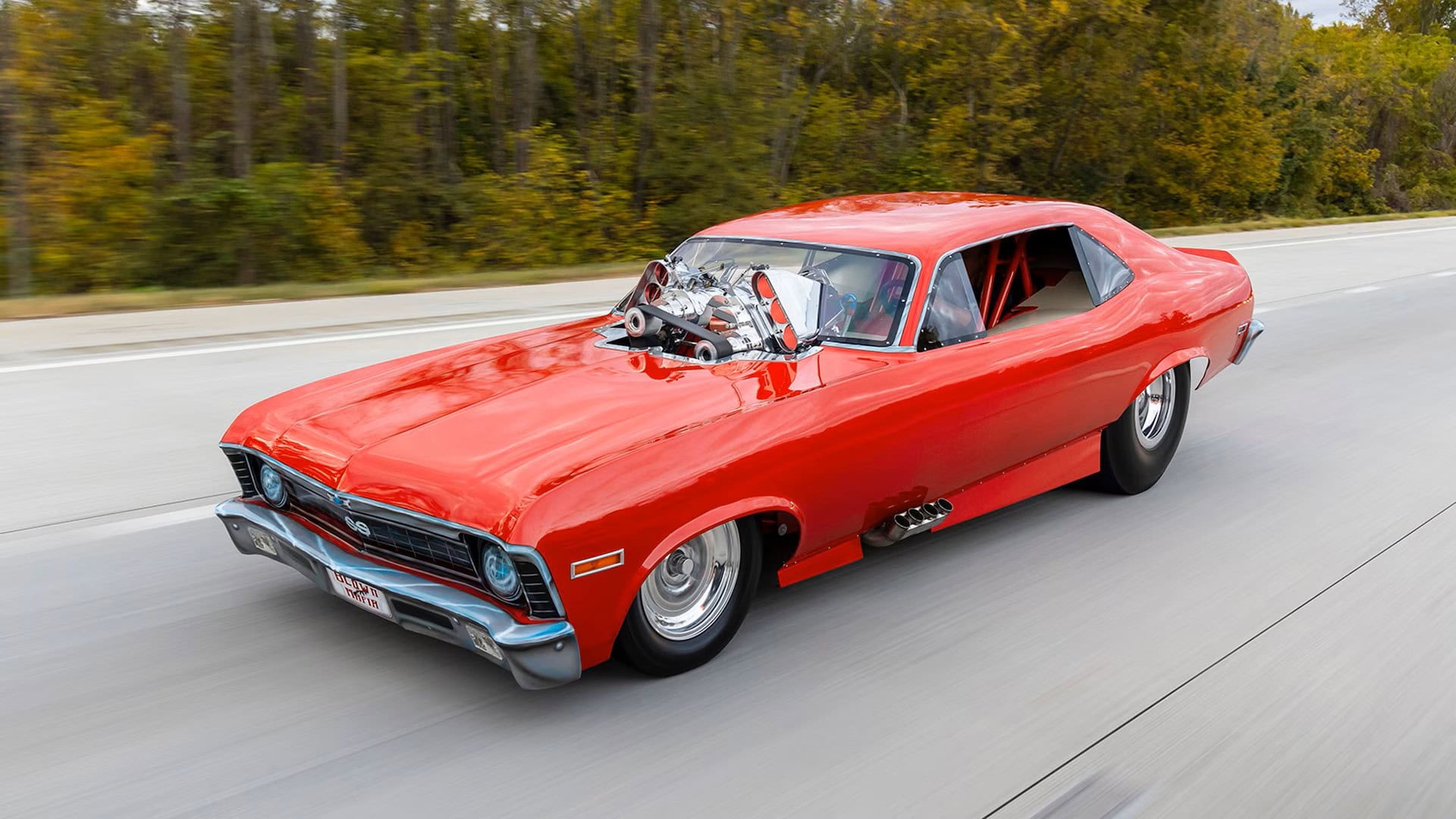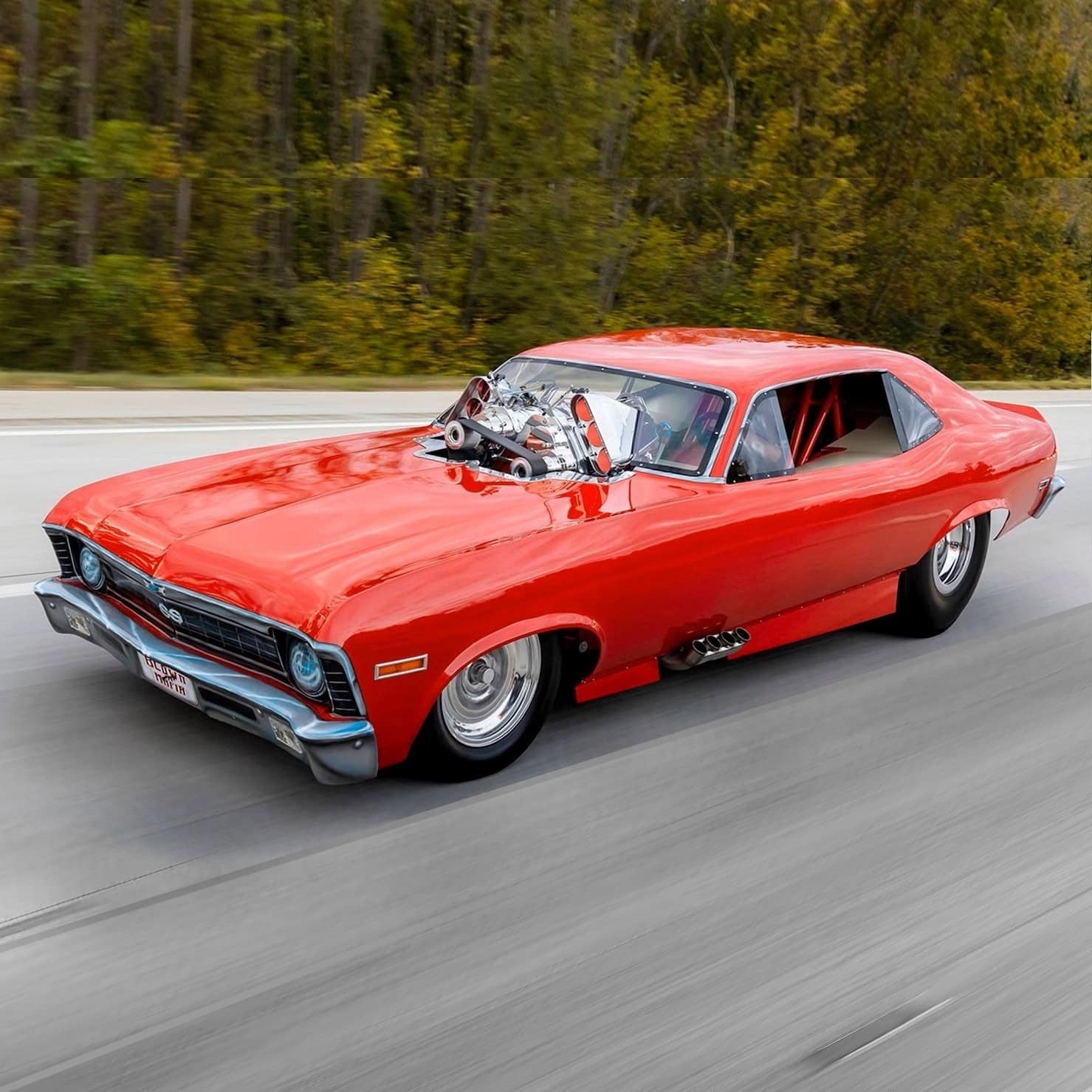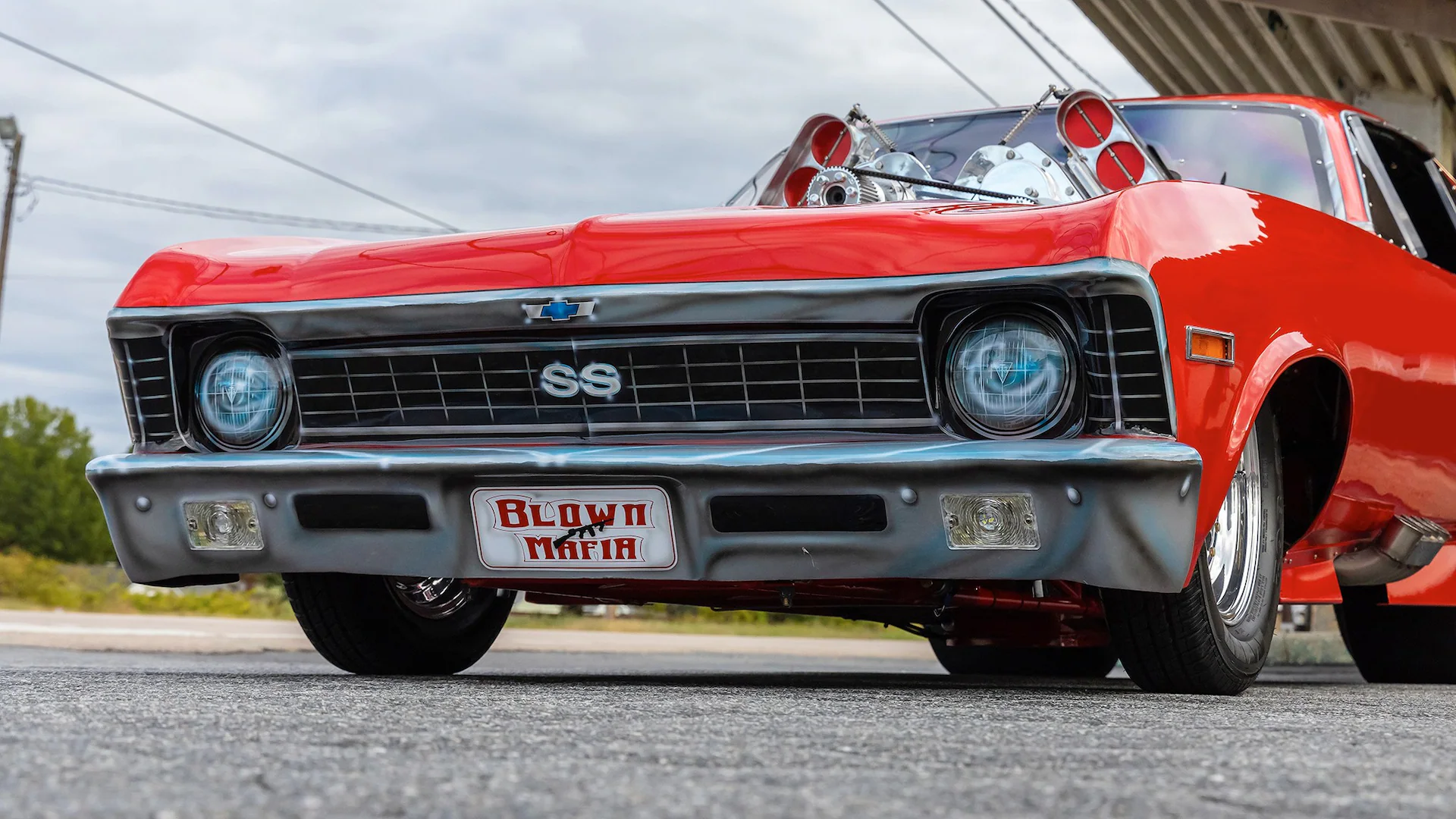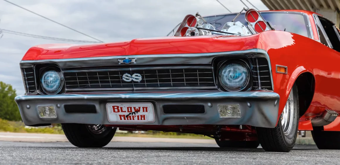 Il a ensuite re-construit un V8 Chevy Big bloc basé sur un LS6 Corvette pour la Nova. Il a d’abord commencé avec un seul compresseur 6-71 au-dessus du moteur poussé à 540ci. Son désir de repeindre la voiture, cependant, lui a ouvert la possibilité de faire quelque chose de plus radical avec la combinaison moteur. Bien que le compresseur unique soit peut-être plus fidèle à la lignée Funny Car, il a rapidement cédé la place à une paire de compresseurs GM 6-71. “Je voulais garder les deux Blowers aussi près que possible pour pouvoir voir à l’extérieur de la voiture. J’ai une bonne visibilité droit devant moi et sur les côtés de la voiture. Le pire, c’est l’inversion, ouais Patrice, la marche arrière, mais j’ai un appareil photo pour ça”.