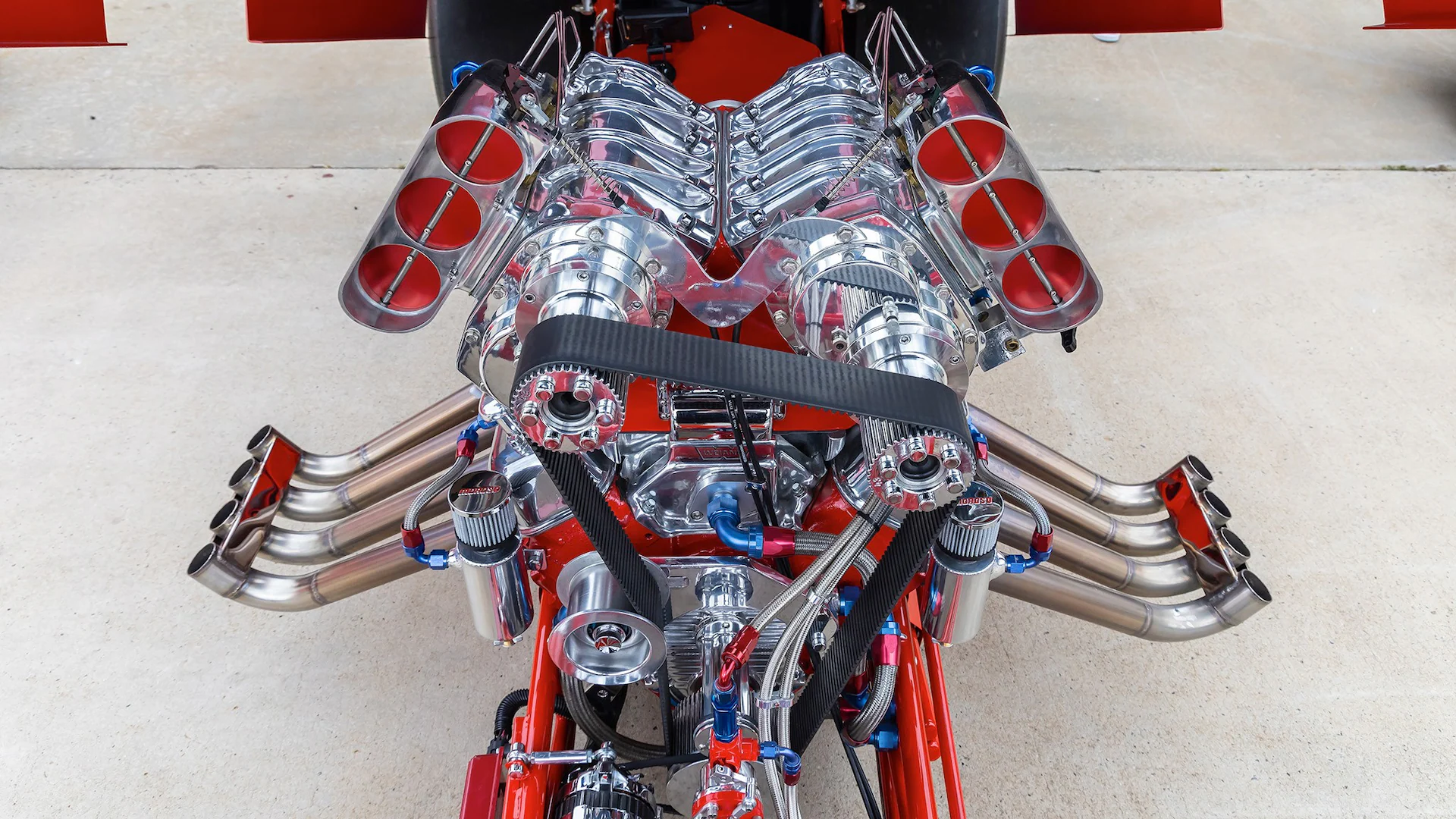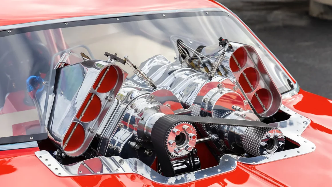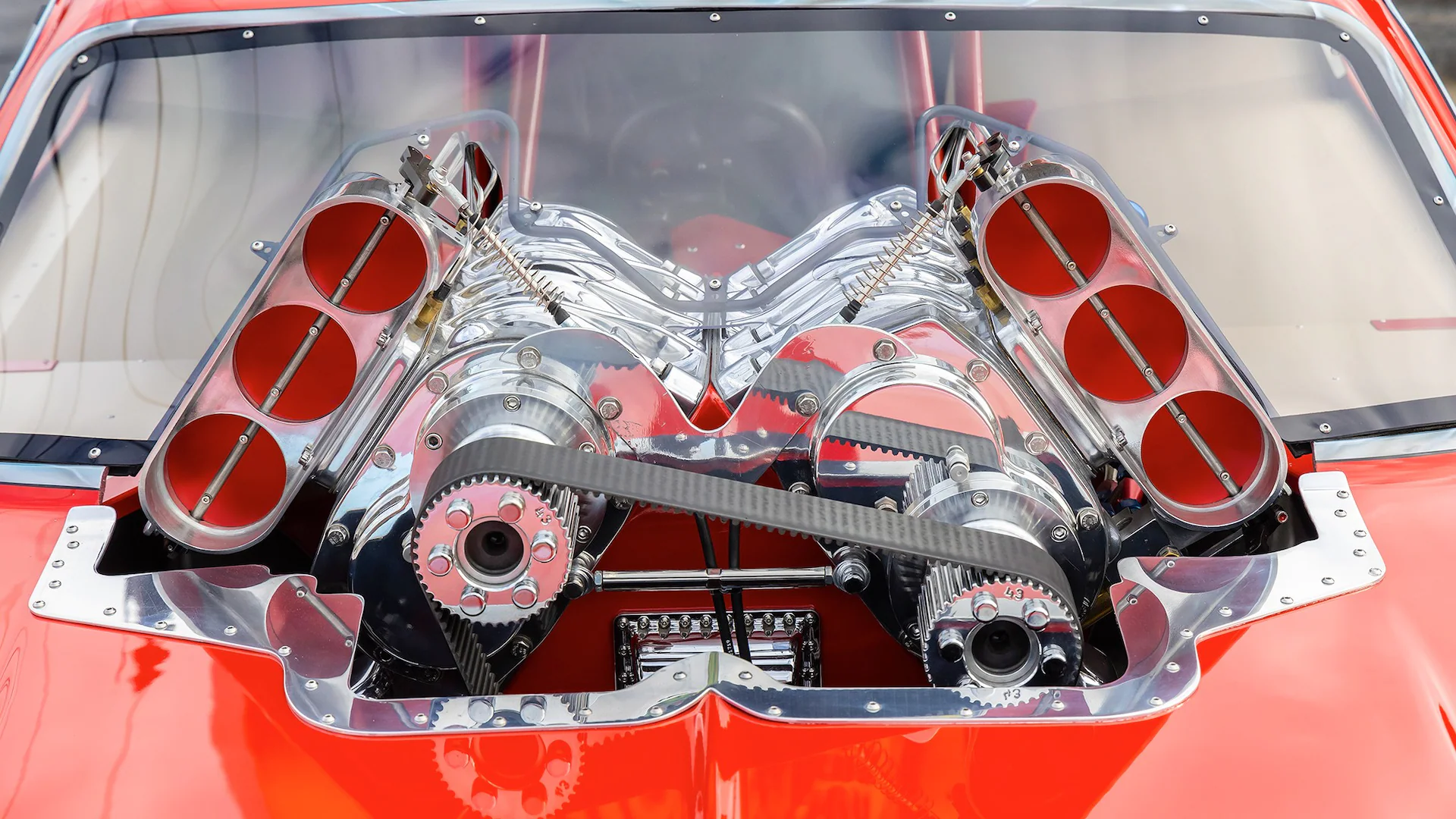 La disposition sauvage des compresseurs nécessitait évidemment une refonte du pare-brise avant, et Chris Cline de Chris Cline Race Car Technologies a été chargé de le fabriquer en Lexan Margard. L’autre problème était de savoir comment synchroniser la paire de compresseurs. “Ouais Patrice, ils ne fabriquent que certaines longueurs de courroie, j’ai donc du organiser le système d’entraînement pour les adapter. Avec les compresseurs inclinés latéralement, l’injection mécanique était la voie à suivre. Les compresseurs suralimentent à 33 %”... Steve Foulk a fait la carrosserie et la peinture et Bradley a choisi de la recouvrir du même rouge que ses autres projets. Bruce Mullins a effectué le travail d’aérographe pour imiter des pare-chocs et les garnitures chromées.