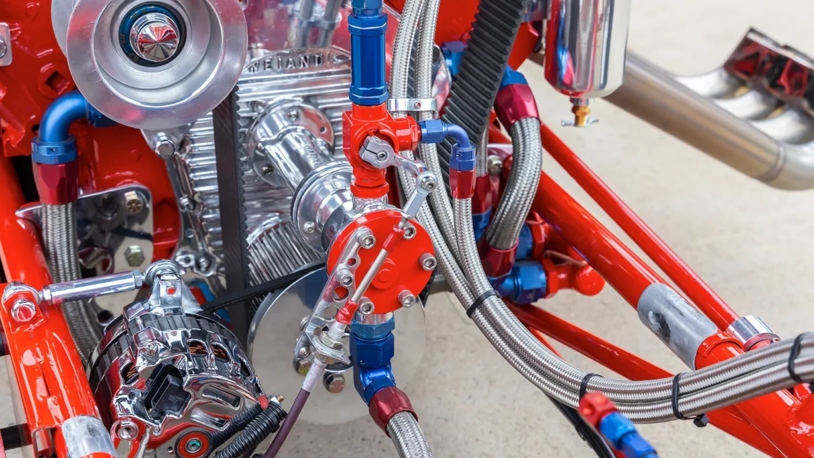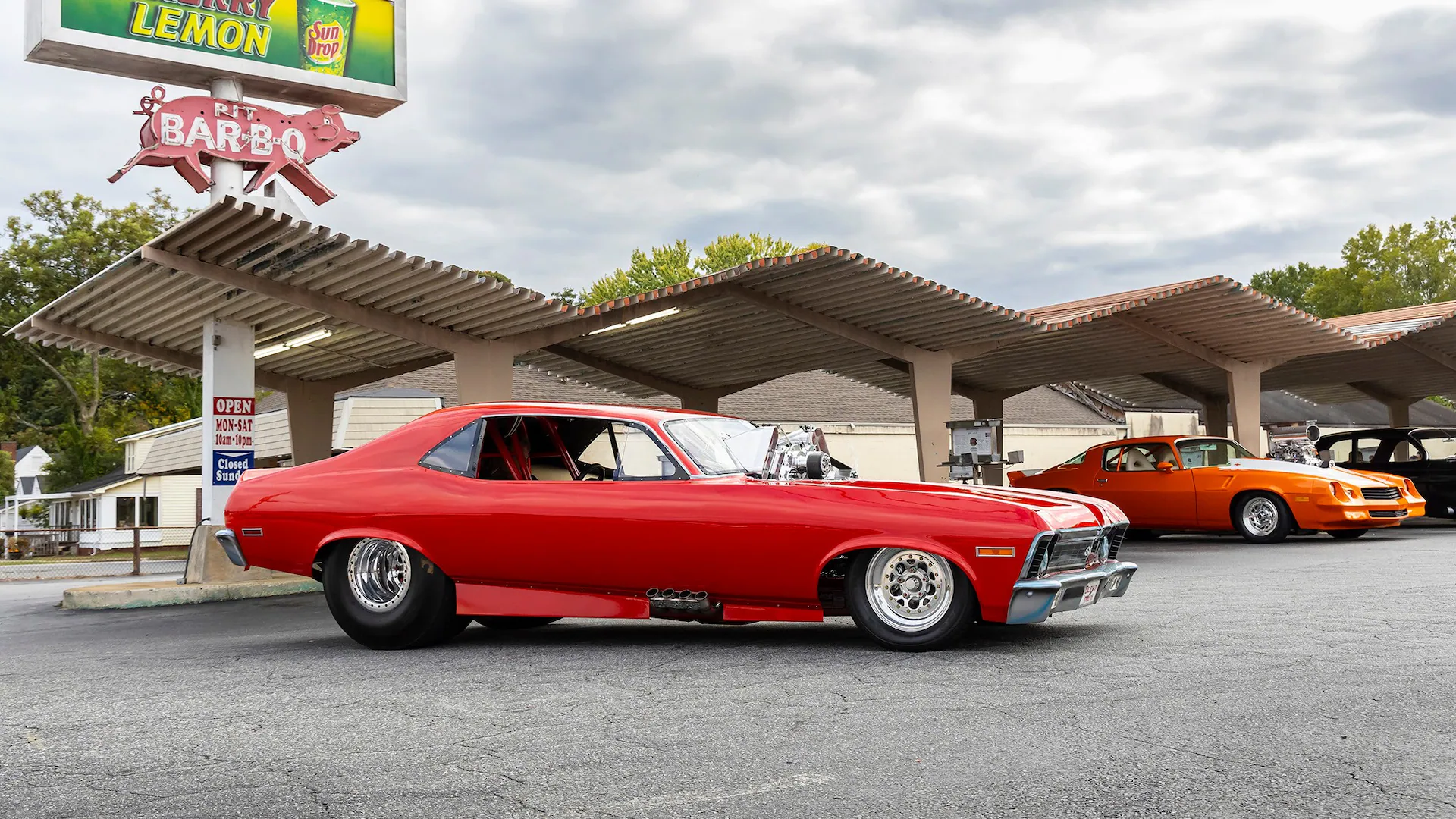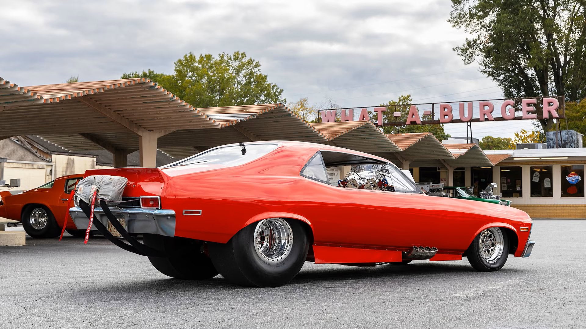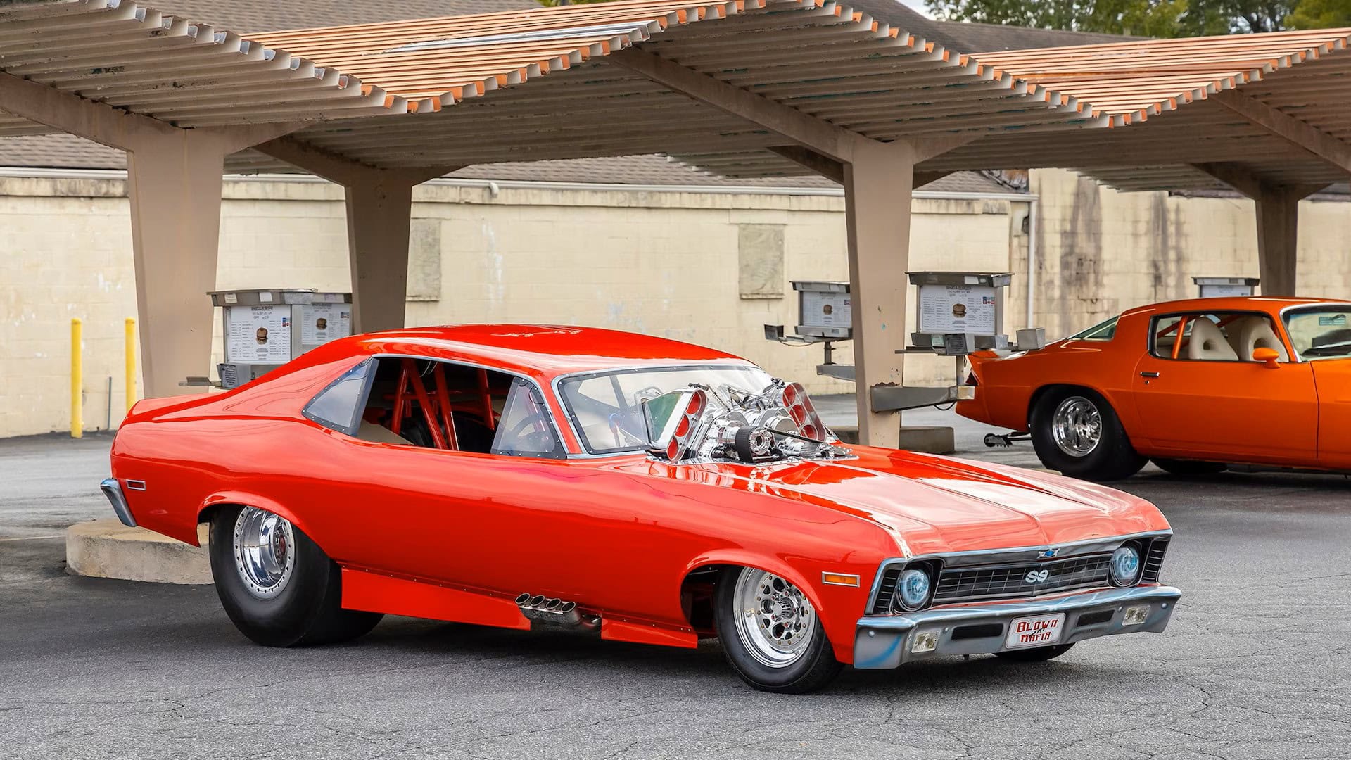 La révision de la suspension avant lui a également permis de placer les roues avant là où elles s’adaptaient le mieux à la carrosserie de la Nova. À l’arrière, le semi-rigide d’origine tient l’essieu Ford original de 9 pouces avec un rapport de démultiplication de 4,71:1. Bradley a démonté le châssis jusqu’à ce qu’il soit en métal nu et l’a remis en état. Il a également refait le câblage de l’ensemble et installé des freins à disque avant Aerospace Components, ainsi que mis à jour les étriers arrière. Avec DEUX compresseurs inclinés latéralement, l’injection mécanique était la voie à suivre : “Il est suralimenté à 33 % et tourne au ralenti autour de 1.300 tr/min. Il a fallu beaucoup de temps pour peaufiner l’injection”, m’a expliqué Gray Bradley.