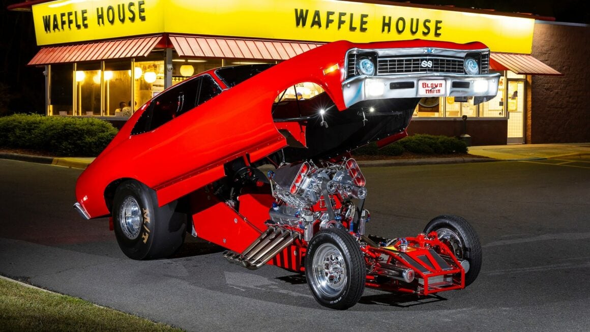 Il l’a équipée d’un big bloc 500ci Chevy surmonté d’un Blower/compresseur d’occasion. La Chevy Nova est plus étroite qu’une Corvette et ce fut donc un travail de quatre hommes pour l’enfiler comme une… (j’ai biffé la comparaison sexuelle)… “Personne ne plaçait de Blower sur des Street-Machines dans les années ’80. Quand on est jeune et connard, on prend de mauvaises décisions comme la mienne d’alors de couper la voiture. Je n’avais pas les moyens de la terminer et j’ai dû la vendre” m’a expliqué Bradley. Deux ans plus tard, il achète une Camaro 1969 qui donne le coup d’envoi de sa collection de voitures “Blown Mafia”. La Camaro a fait son entrée sur le circuit des salons de vanités avec un énorme compresseur 14-71 alimenté par une paire de turbocompresseurs.