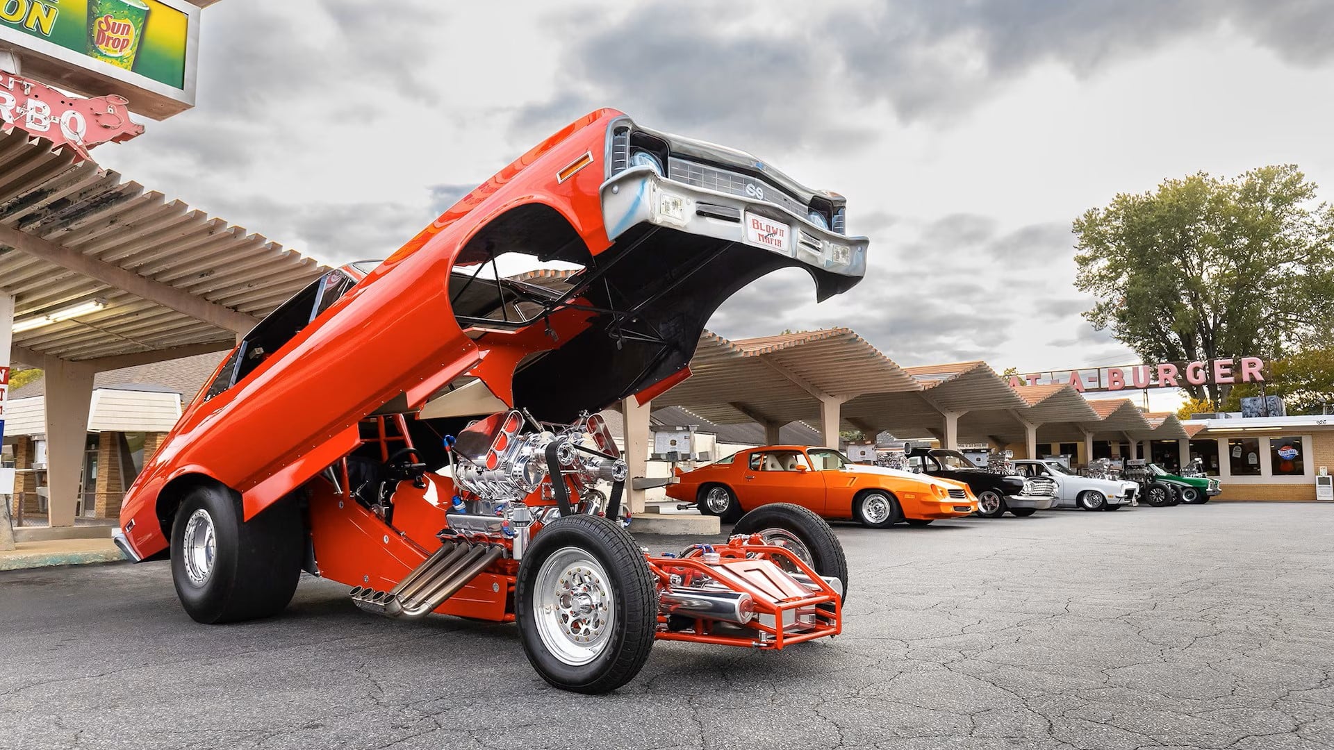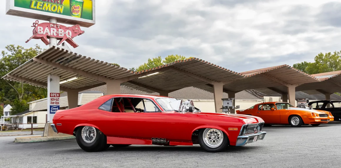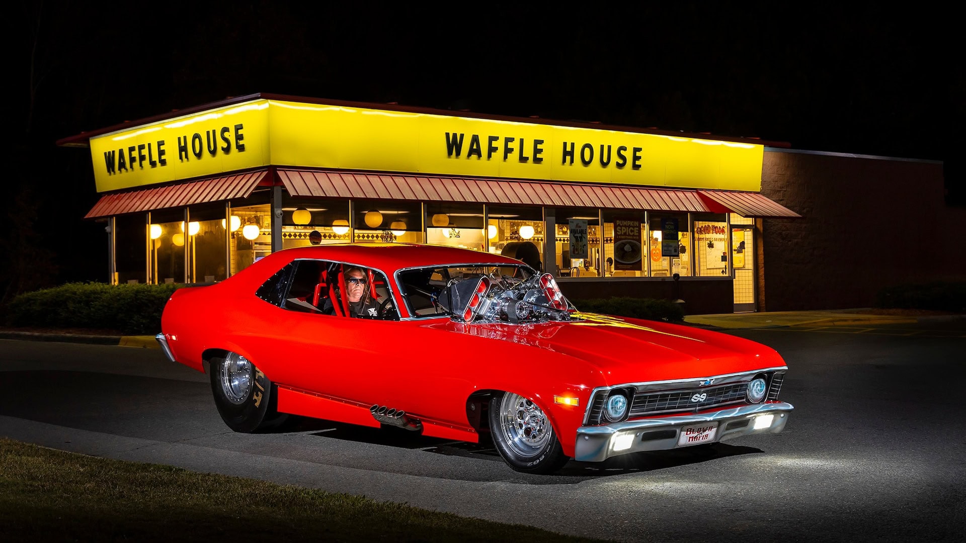 Le chaos finit par absorber toute référence extérieure à toute réalité sans me laisser peu à peu gagner par une résignation désespérée… “Il était une fois un Hot Rod faisant course avec plusieurs Street machines”… La Chevrolet Nova 1970 de Bradley Gray qui y pose ci et là en vedette est un hybride Hot-Rod-Dragster-Street-Machine que ce même Bradley Gray a décidé de construire en réaction à la grande déglingue du monde. Waouwwwwwwww ! Bradley Gray, de Concord, en Caroline du Nord, a grandi à l’époque des Hot Rods et des Dragsters Pro Street des années ’80 (les années Chromes et Flammes avec TopWheels en version américaine) et a sauté la tête la première dans la tendance avec sa toute première voiture, une Chevy Nova de’70.