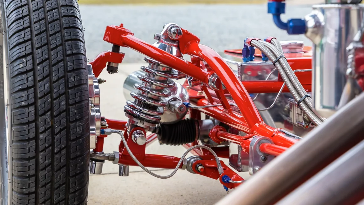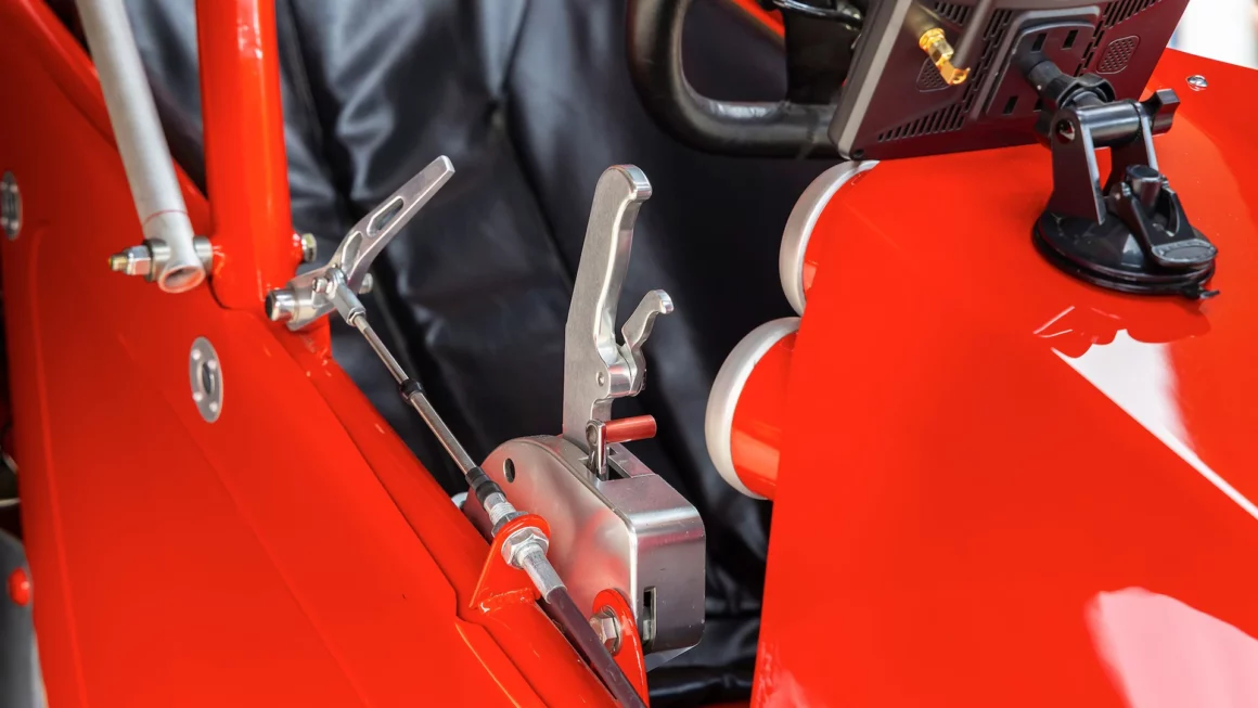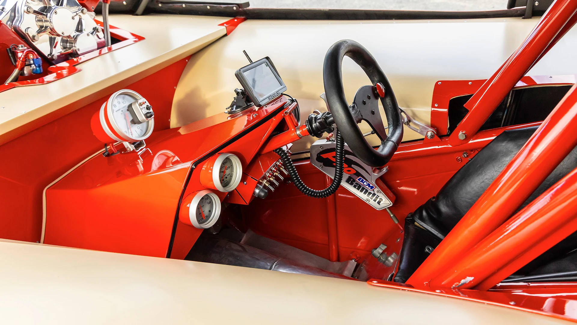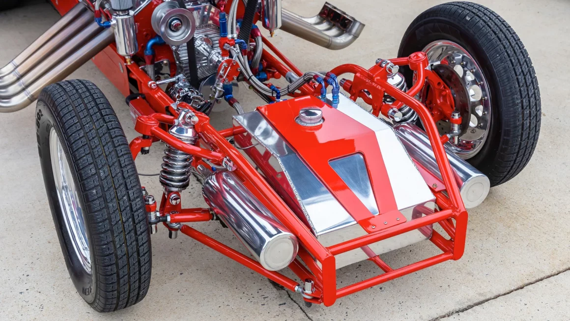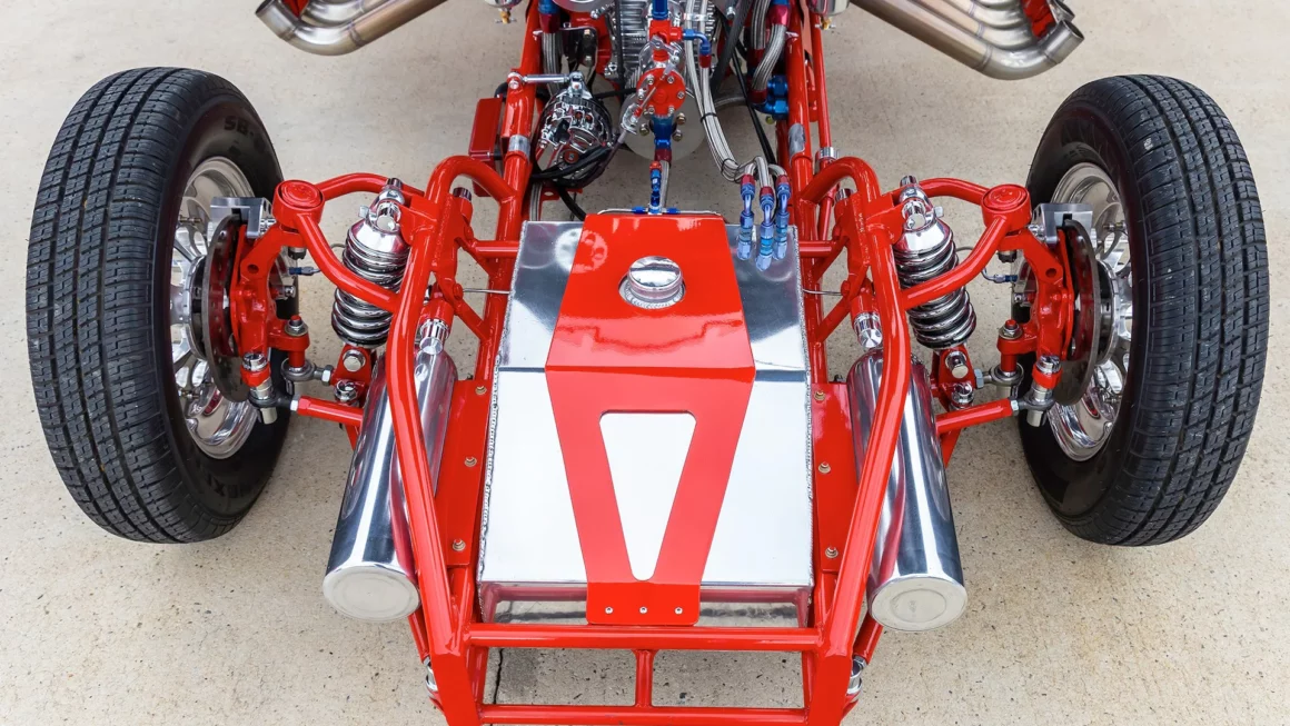 Le système de refroidissement se compose d’une pompe de 55 gallons par heure montée sur le radiateur monté à l’arrière. Une paire de batteries de camions fournit la force nécessaire pour démarrer et allumer le moteur. Gray m’a en outre expliqué qu’il avait abandonné le volant papillon d’origine parce qu’il ne s’adaptait pas bien. Quoique les roues avant soient montées sur des ressorts hélicoïdaux, la suspension arrière est solidement montée FIXE sur la voiture, ce qui signifie que ce ne sont que ces pneus hauts qui absorbent les bosses de la route. “Ouaisss Patrice je suis dingue. J’utilise 11,5 psi dans les pneus arrière. Il y a juste un léger rebond sur l’autoroute”, m’a dit Bradley à propos des pneus arrière Mickey Thompson Big Bubba 35x15x16,