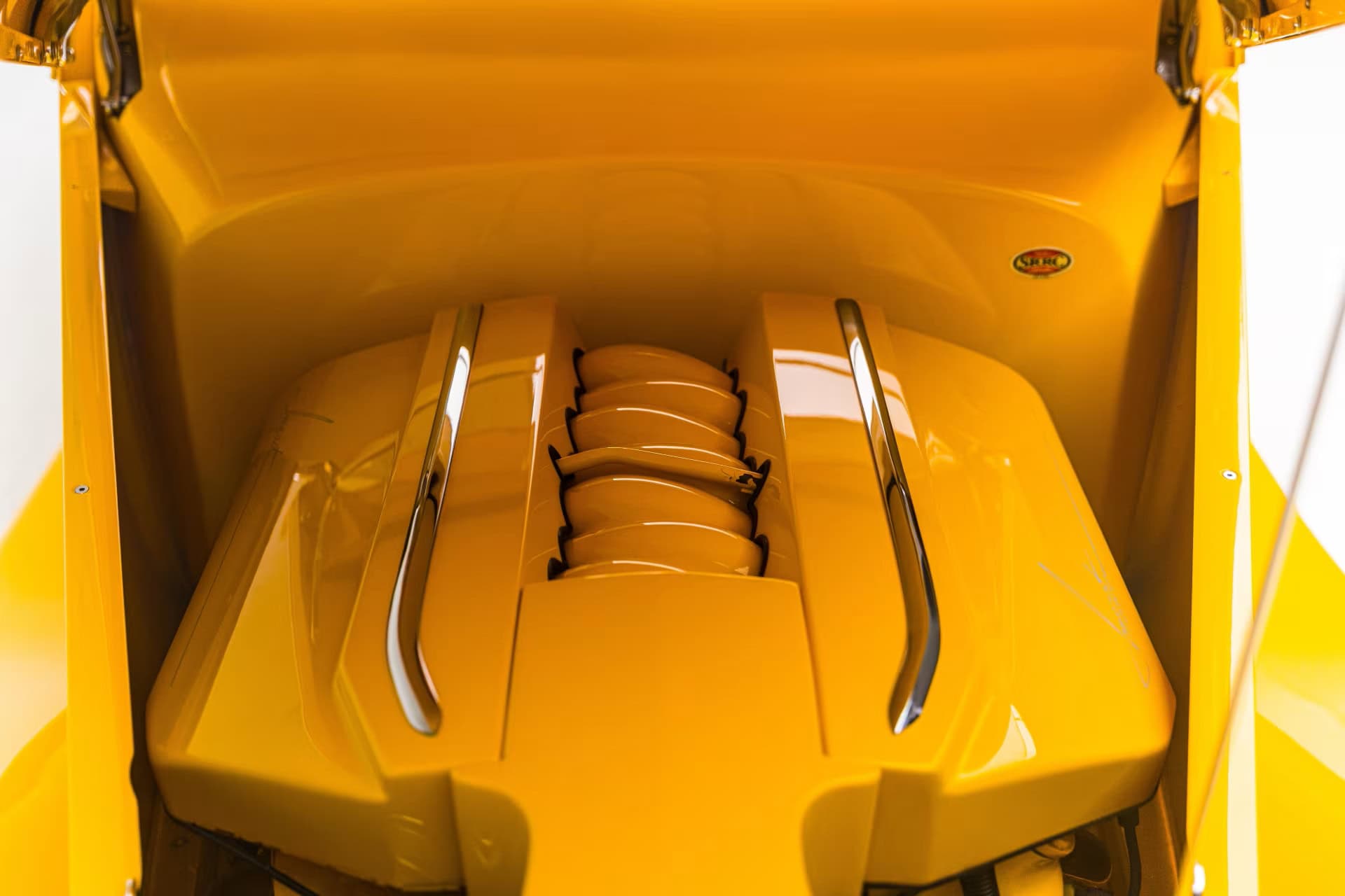 L’intérieur du “Shockwave”, garni de cuir fauve façon Ferrari surpiqué par Paul Atkins, offrait un contraste discret et élégant. On y trouvait également un tableau de bord sur mesure subtil avec des instruments Classic, l’incontournable volant en aluminium usiné et des pédales en acier chromé. Deux rétroviseurs extérieurs, fabriqués par Karl Johasson, étaient fixés de chaque côté. Malheureusement, le moteur LT4 de 5,7 litres (350ci) poli et détaillé par Andy Wallen n’était qu’ornemental. La fonction d’une voiture d’exposition est en effet d’être irréprochable en permanence, sans la moindre imperfection, rayure, décoloration ou autre défaut. Il n’est donc pas surprenant que “Shockwave” ne pouvait fonctionner pas par ses propres moyens.