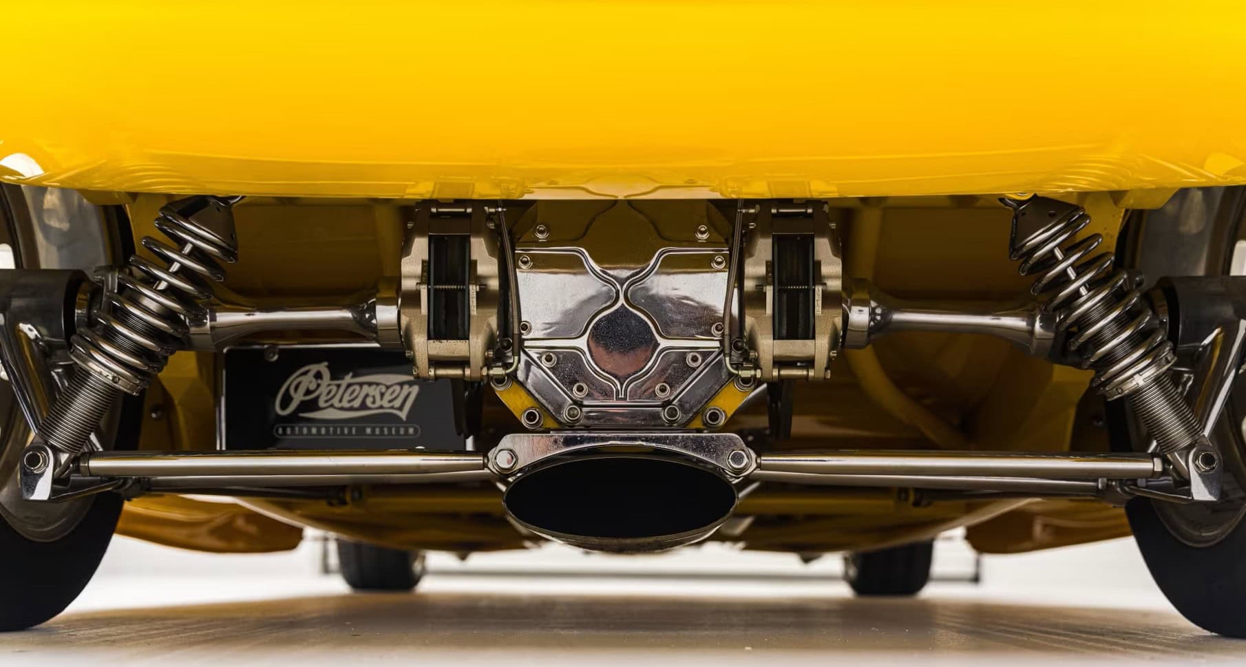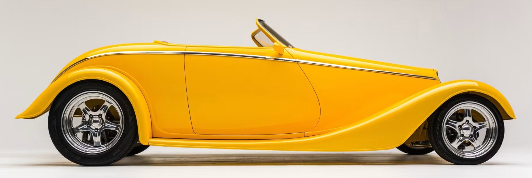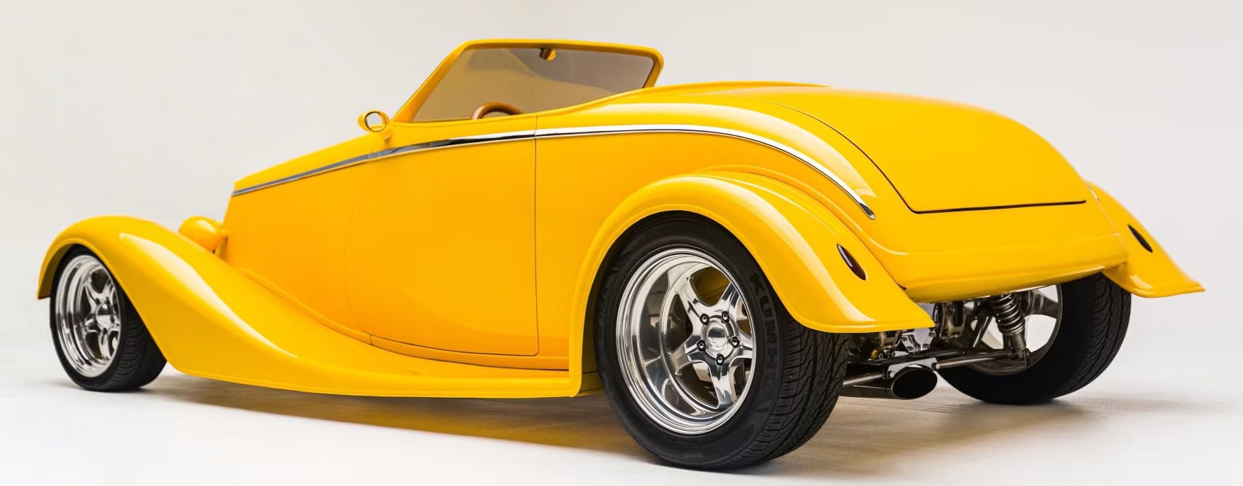 Je ne m’attendais à pas tout ce bordel en créant Chromes&Flammes durant les Seventies… Bref, aux States, tout le musée Petersen (qui en a déjà perdu le nom) va bientôt être vendu aux enchères… Cette Ford roadster de 1933 va ainsi traverser le pâté (gag !) lors de la vente aux enchères de Mecum à Glendale en mars 2026, et pour cela elle a été affublée d’un excellent palmarès pour attirer les acheteurs potentiels. Faussement conçue par Chip Foose, comme mentionné précédemment ci-dessus-avant, mais réellement construite par Barry White de “Street Rod Repair Company” ce Hot Rod’33 jaune personnalisé, connu sous le nom de “Impact”, porte assurément son nom et a fini par être lauréat du prestigieux prix America’s Most Beautiful Roadster (AMBR) en 2001.