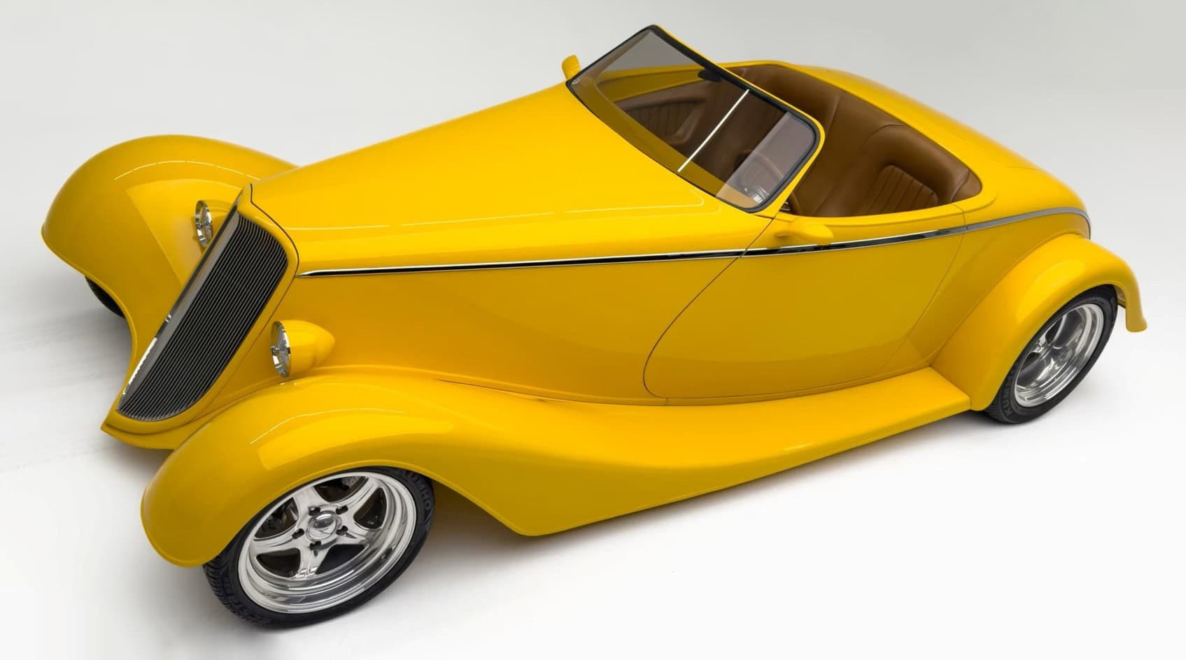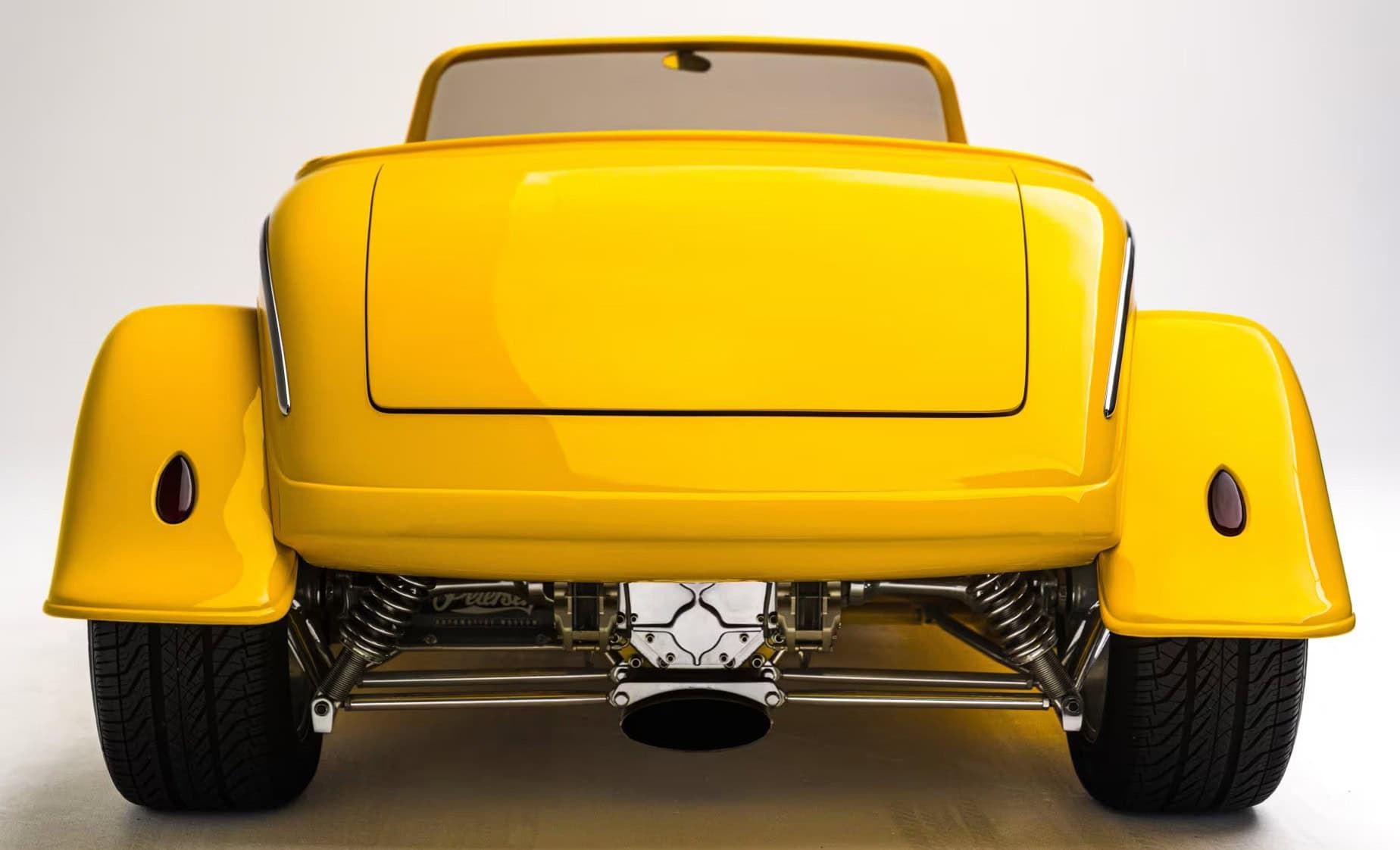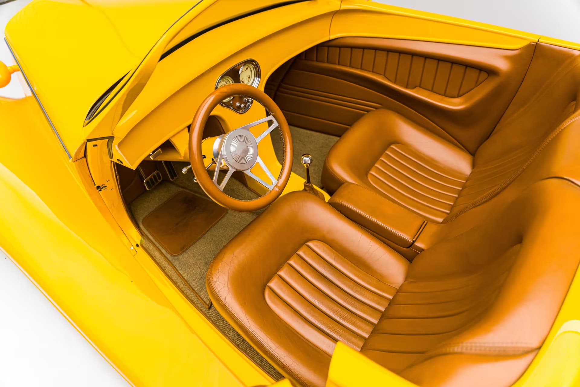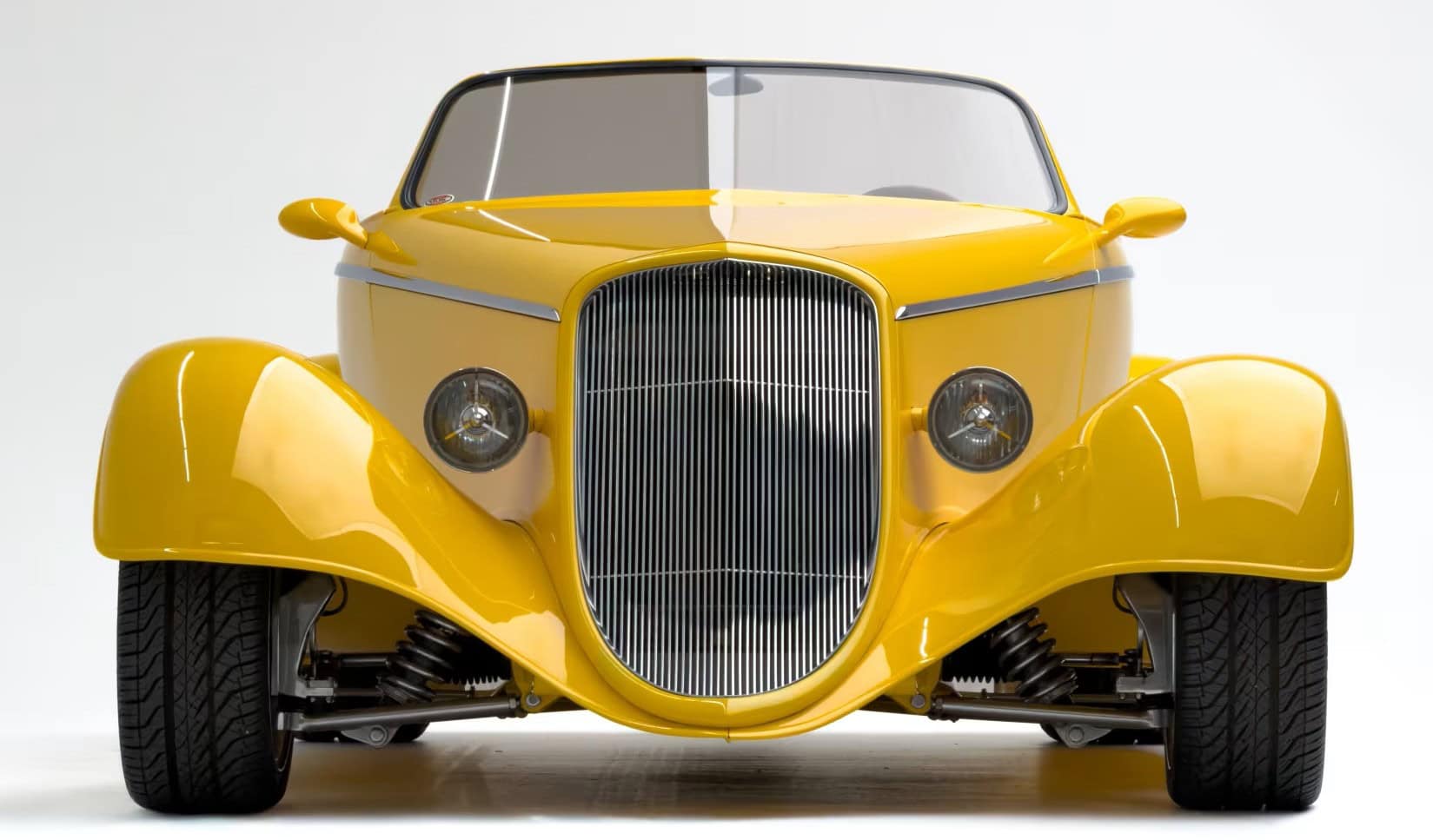 Cette construction présente une carrosserie Ford roadster 1933 sur mesure entièrement en acier, mais pas polie/lustrée mais recouverte de peinture PPG Yellow Chrome. Le concept dans la tête de Chip Foose était de réimaginer une ancienne Ford Street Rod construite dans le style européen, présentant donc des lignes simplistes avec des surfaces lissées, un pare-brise arrondi et fort penché vers l’arrière, avec seulement quelques touches brillantes comme la calandre avant, les garnitures latérales et les jantes. À l’intérieur, on trouve un intérieur entièrement personnalisé conçu par Chris Brown avec une sellerie cousue à la main par Gabe Lopez, ainsi que des jantes en aluminium en billettes d’alu uniques et divers panneaux personnalisés.